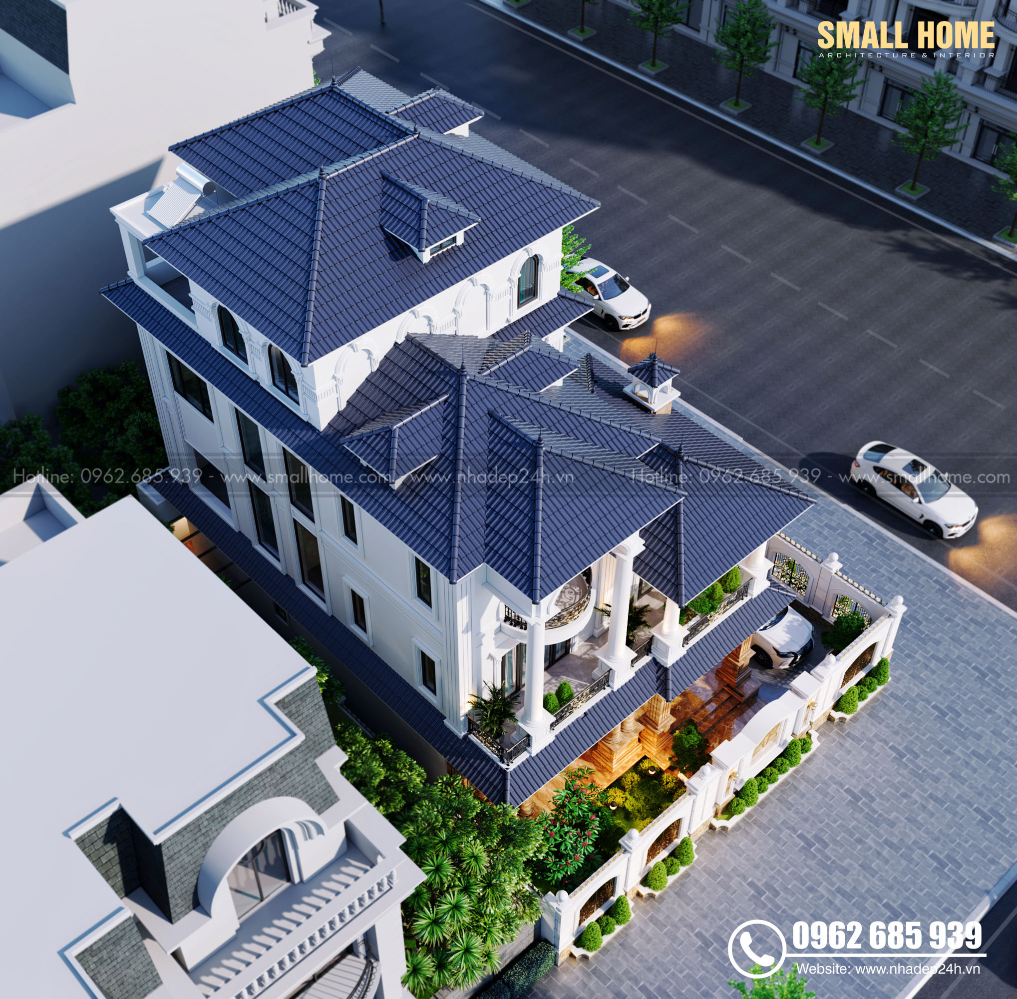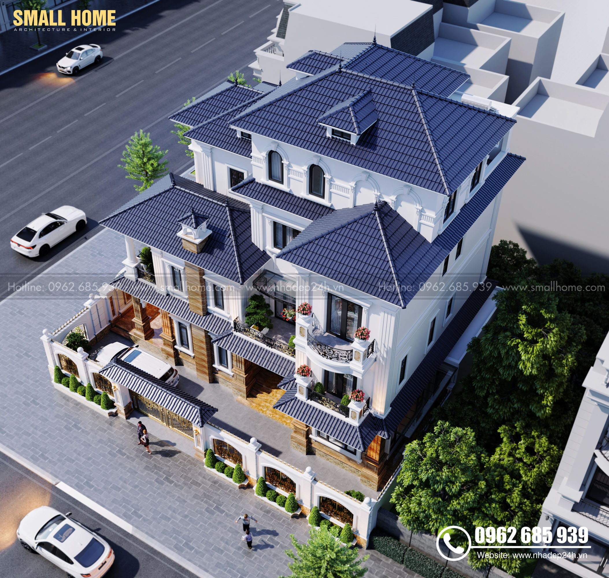 Với diện tích xây dựng lý tưởng cùng yêu cầu cao từ gia chủ, biệt thự được thiết kế theo bố cục 3 tầng đăng đối, sử dụng tone màu trắng chủ đạo kết hợp mái ngói lam than trầm ấm – vừa nổi bật, vừa tinh tế. Từng đường nét, khối kiến trúc đều được chăm chút kỹ lưỡng, tạo nên một tổng thể hài hòa – mạnh mẽ – quý phái.