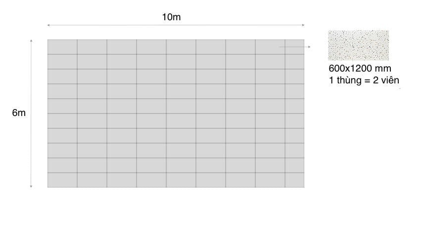 Gia chủ cần lát nền với diện tích 60m2 (10×6), chọn gạch 600×1200mm (diện tích 1 viên gạch là 0.72m2).