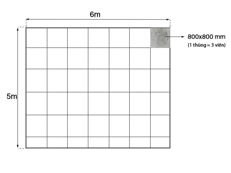 Gia chủ cần lát nền với diện tích 30m2 (6×5), chọn gạch 800x800mm (diện tích 1 viên gạch là 0.64m2). Vậy số lượng gạch cần mua sẽ là: