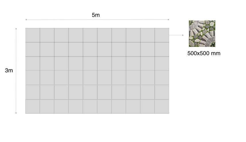 Gia chủ cần lát sân thượng với diện tích 15m2 (5×3), chọn gạch 500×500 mm (diện tích 1 viên gạch là 0.25m2).