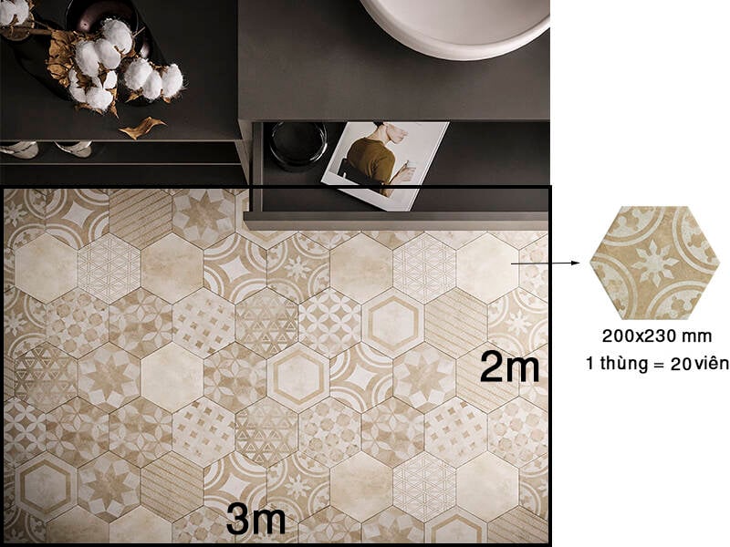 Mỗi thùng gạch lục giác 200×230mm thường có 20 viên. Vậy gia chủ cần mua khoảng 9 thùng gạch.
