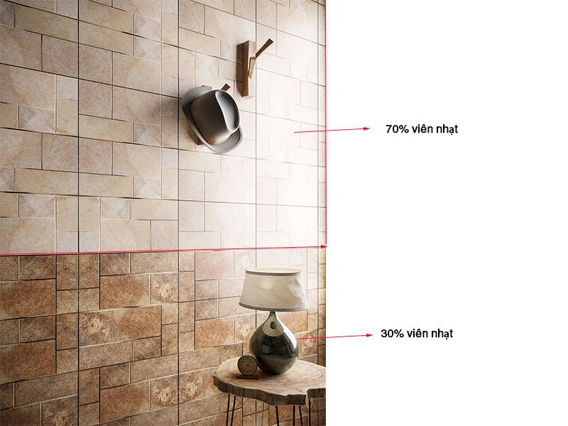 Ngoài ra, với gạch ốp tường theo bộ có viên điểm đi kèm, nên sử dụng gạch theo tỉ lệ 25% viên đậm, 1 viên điểm (đối với gạch điểm) và 70% viên nhạt (tính theo chiều dọc bức tường).