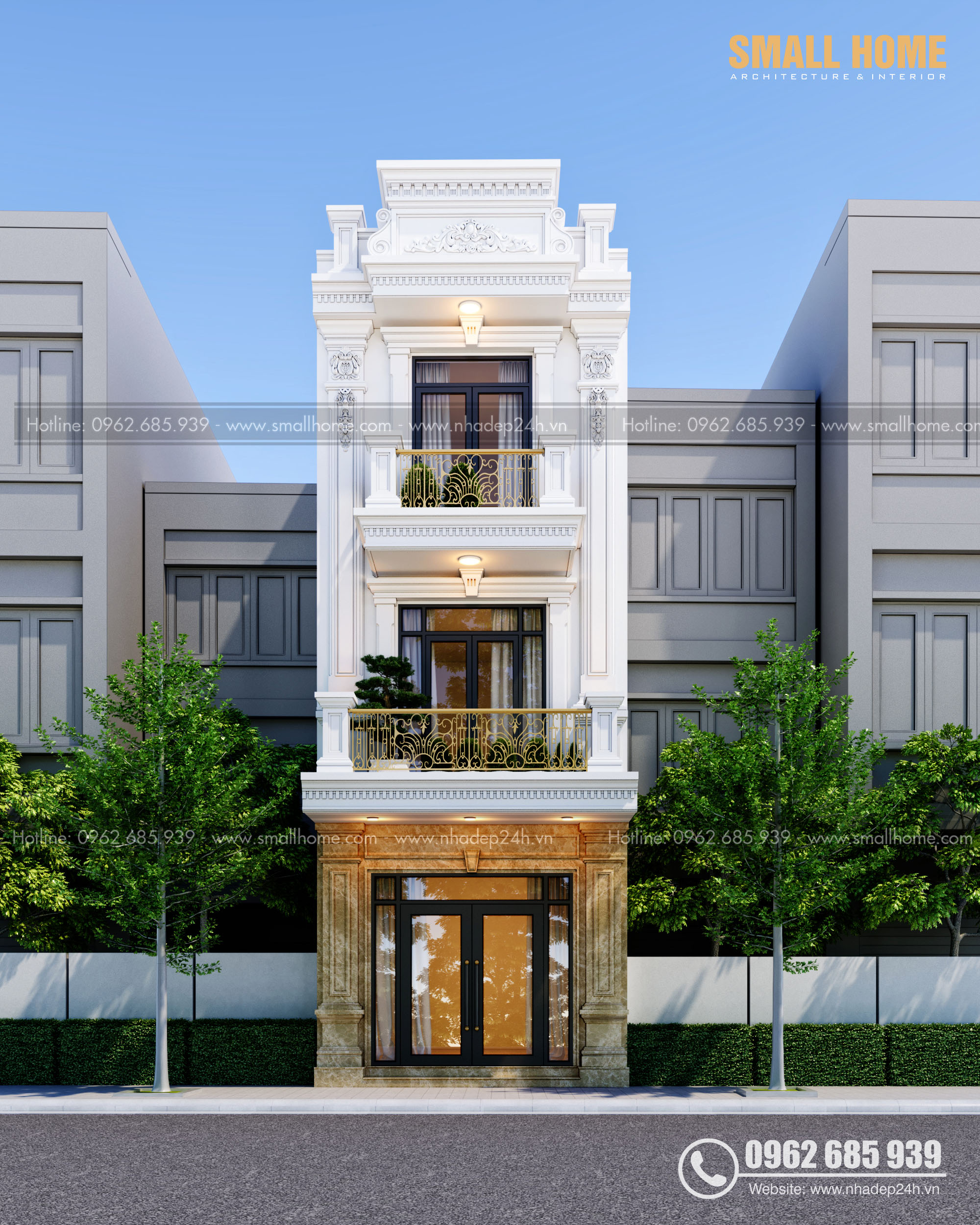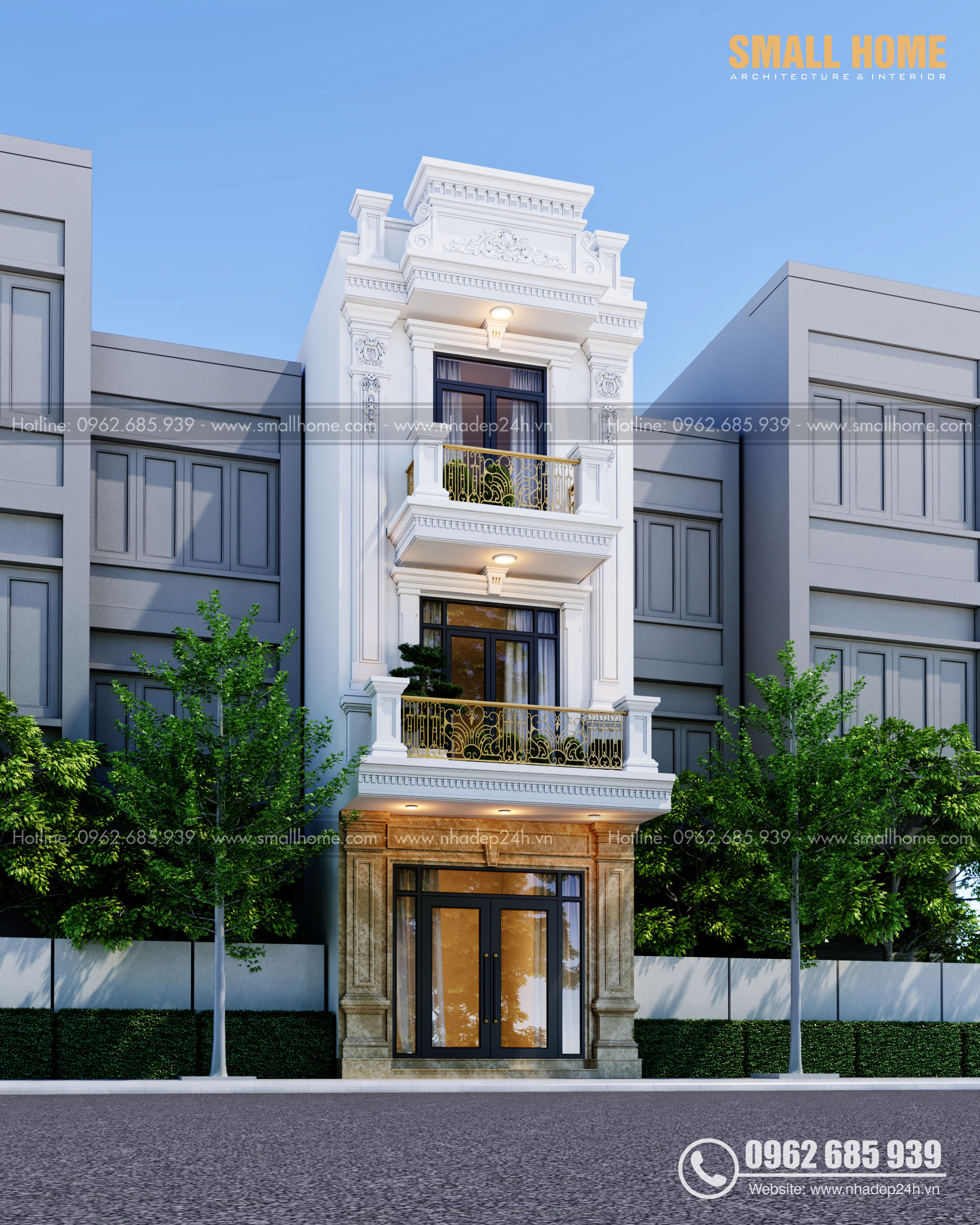 Mẫu nhà ống không quá cầu kì nhưng để lại ấn tượng bởi sự tối giản và tinh tế. Thiết kế phù hợp với những gia đình thích phong cách tân cổ điển nhưng không muốn có nhiều họa tiết rườm rà cho căn nhà của mình. Sự nhẹ nhàng cùng những đường cong đơn giản, những chi tiết khắc điệu tinh xảo đầy gợi cảm của tay vịn ban công.