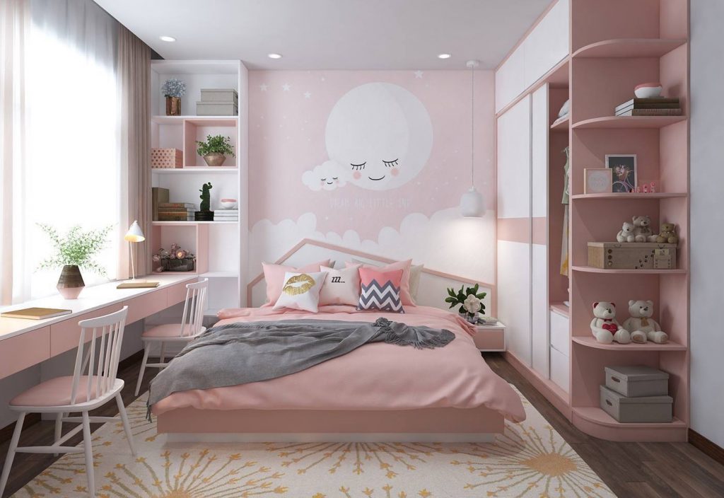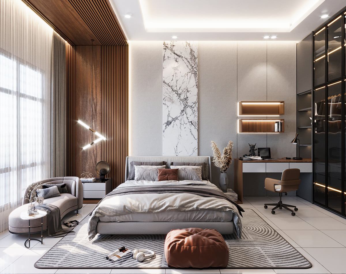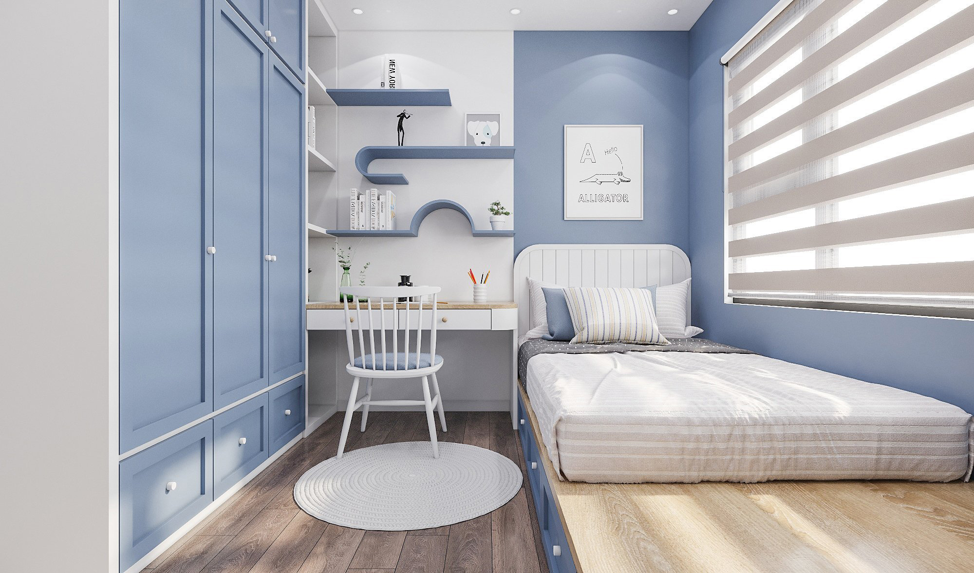 Tầng 2: 1 phòng ngủ master + phòng làm việc, phòng sinh hoạt chung, 2 phòng ngủ cho con.