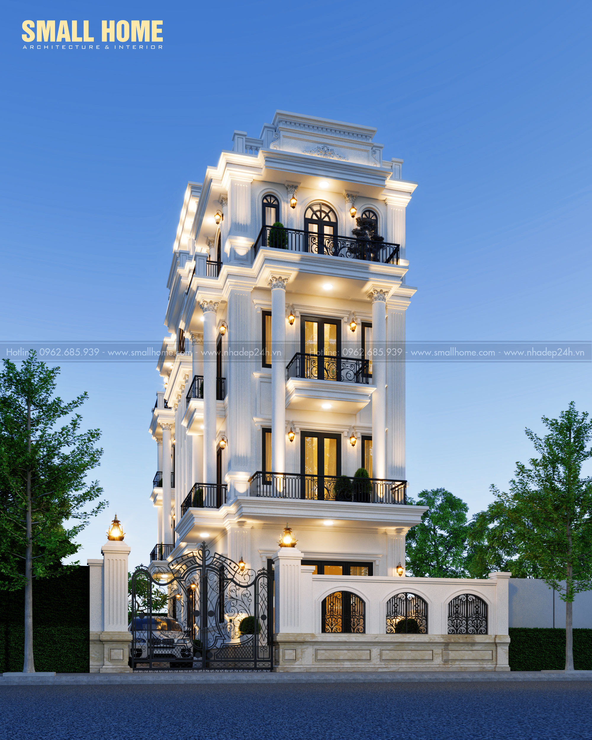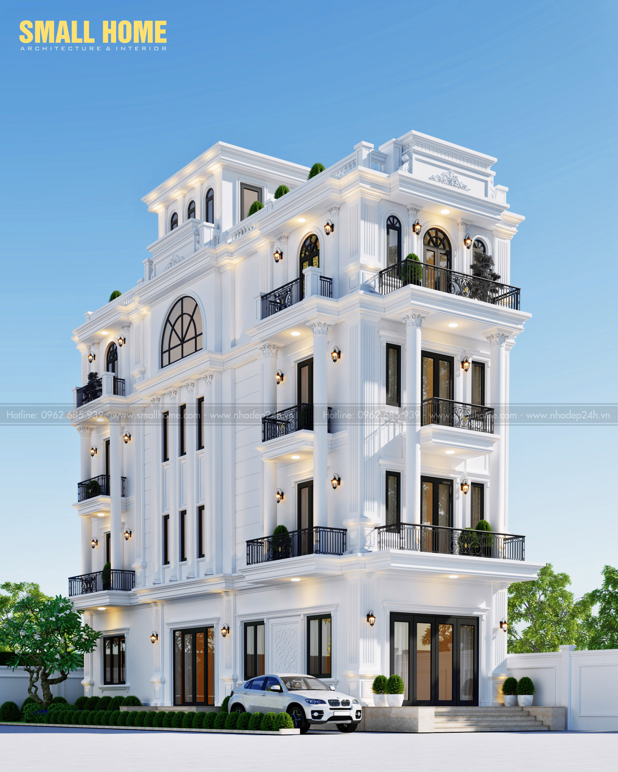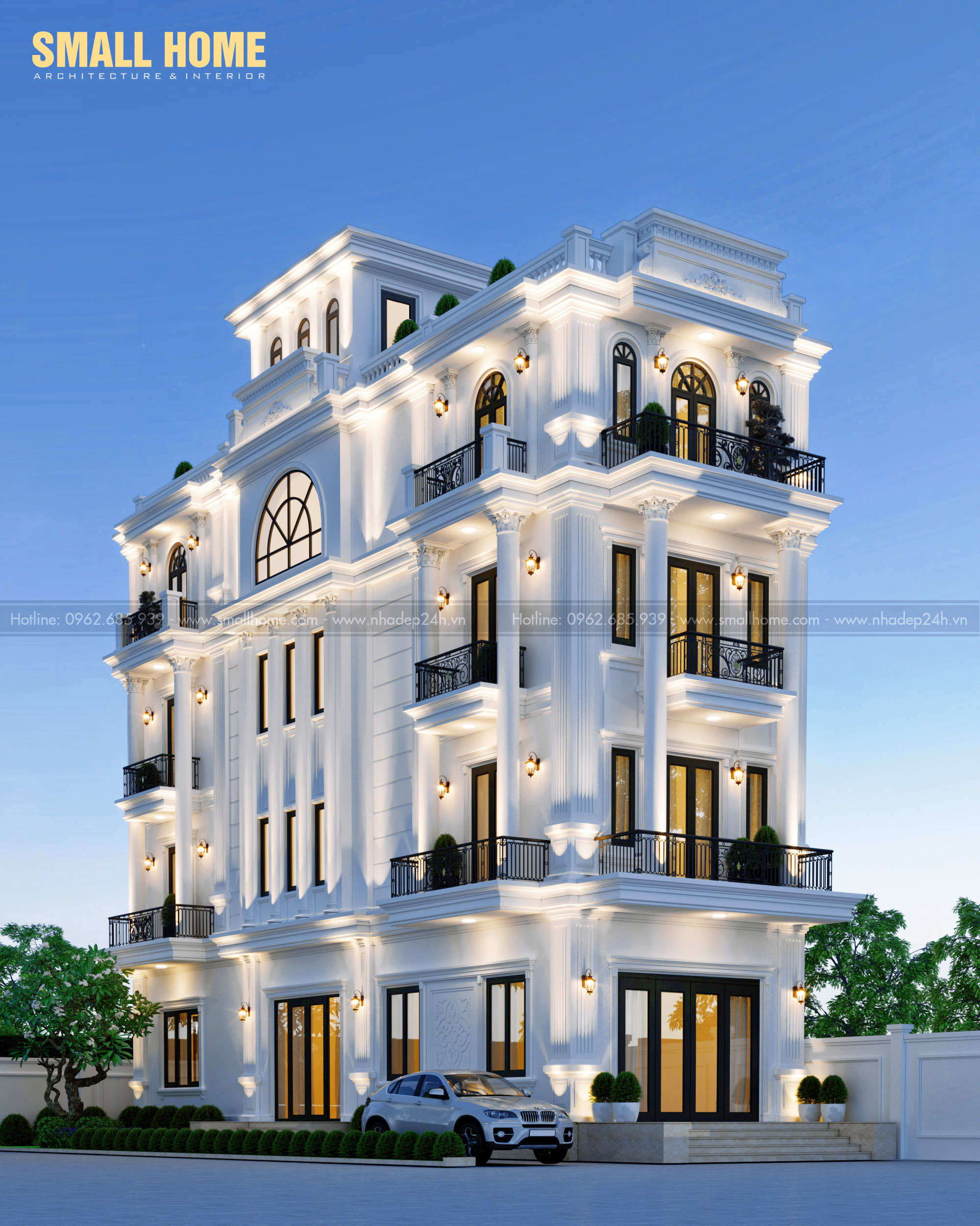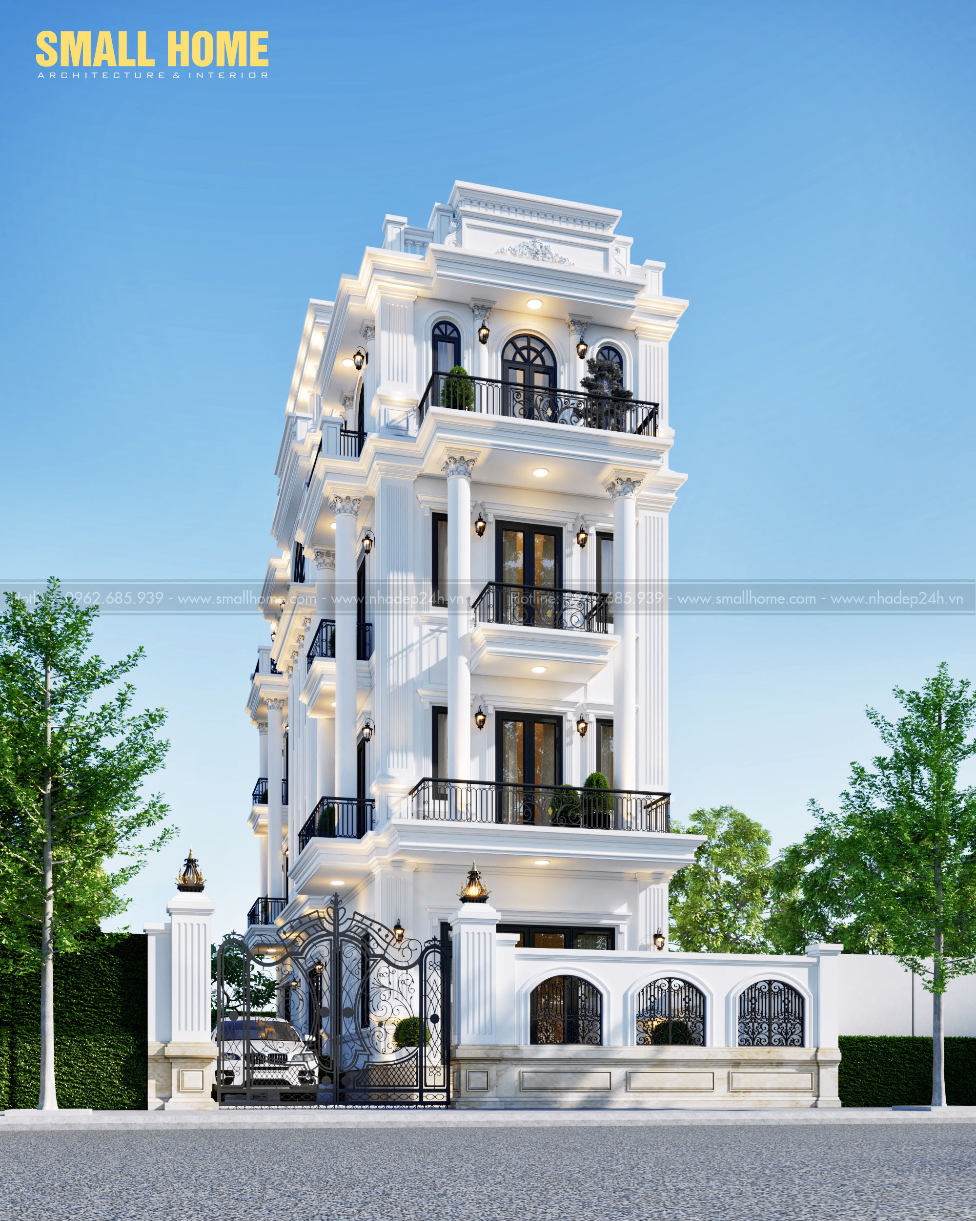 Với màu trắng tinh khôi làm chủ đạo điểm xuyết bằng màu đen huyền bí, ngôi biệt thự mang đến cho người nhìn cảm giác thanh lịch nhưng không kém phần sang trọng. Ngoài ra, việc sử dụng hệ chương mái ghi ấn sức hấp dẫn và nét đặc trưng riêng biệt của phong cách kiến trúc tân cổ điển càng làm cho mẫu biệt thự tân cổ điển 4 tầng 1 tum thêm hút mắt và tạo được ấn tượng khó phai.