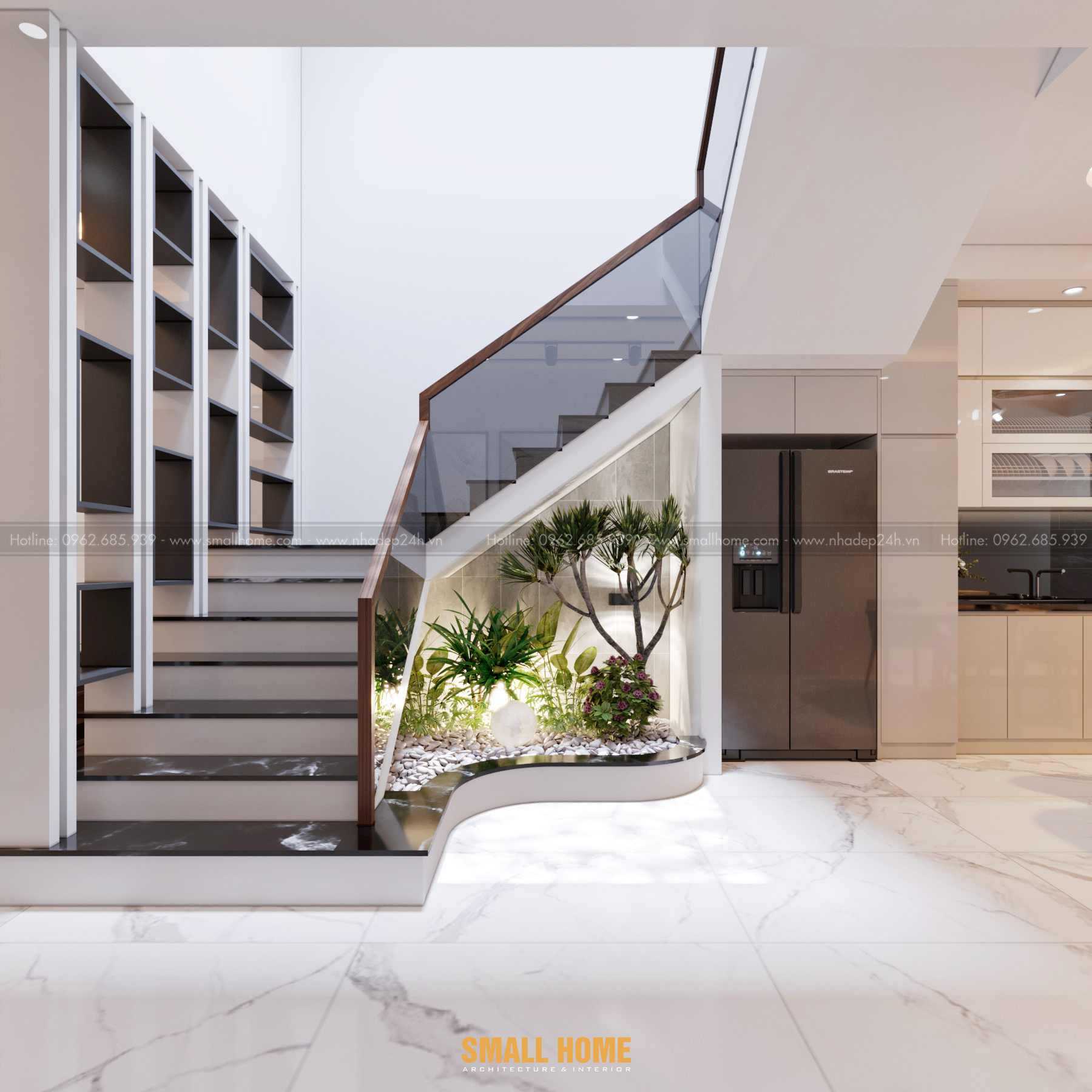 Cầu thang của nhà anh Bình được thiết kế ốp đá đen vân mây, lan can sử dụng hệ lan can kính, tay vịn gỗ tự nhiên. Phía dưới gầm thang, thay vì làm các tủ gầm thang thông thường, thì riêng đối với nhà anh Bình, KTS của Smallhome đã thiết kế một tiểu cảnh cây xanh nhỏ, bậc đá chạy uốn lượn mềm mại, làm xóa bỏ vẻ thô cứng vốn có của cầu thang truyền thống.