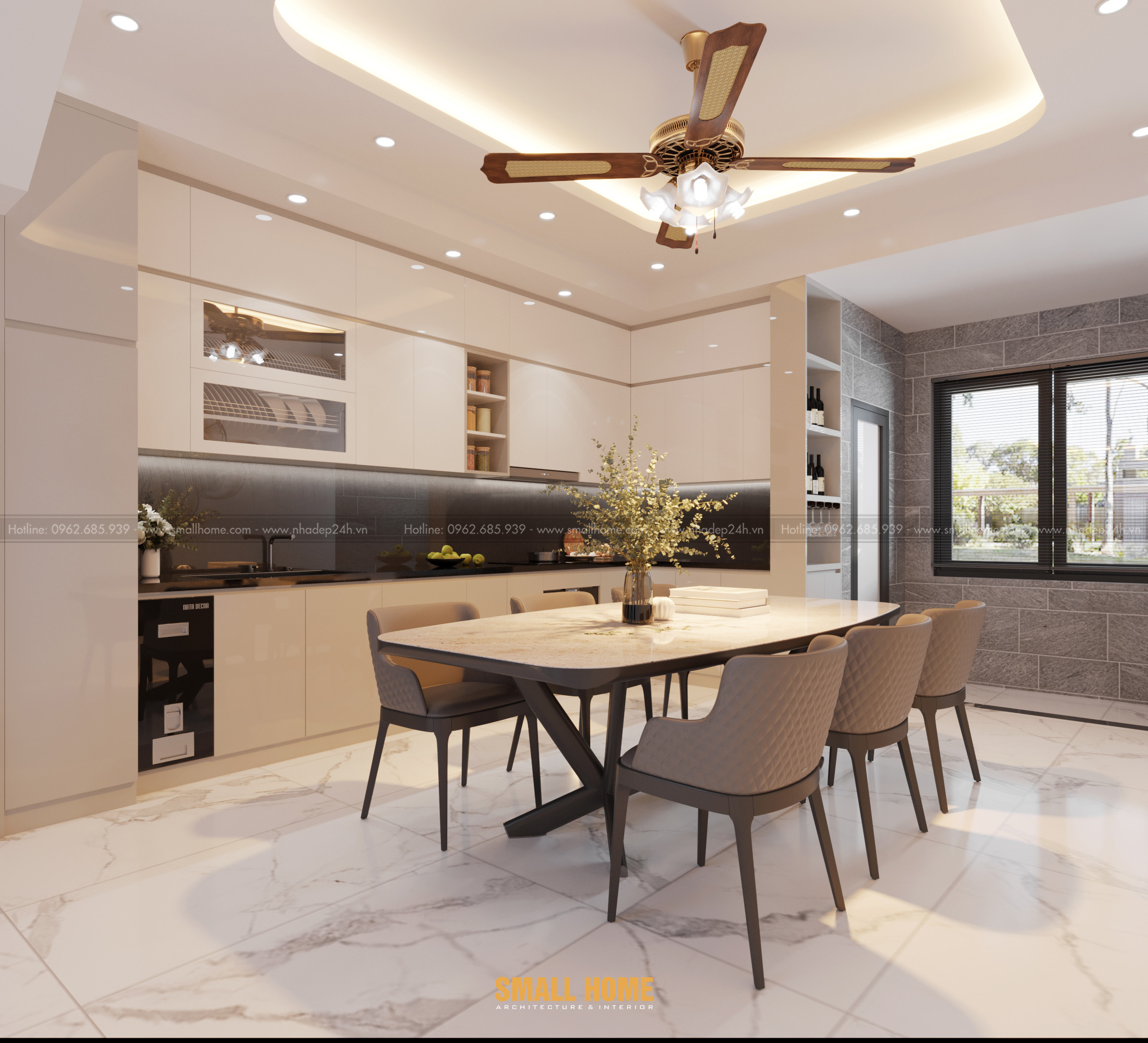 Đặc điểm nổi bật của phong cách Hiện đại chính là sự đơn giản, và màu sắc nhã nhặn, sang trọng. Nắm rõ được phong cách thiết kế này, các KTS Smallhome đã thiết kế không gian bếp và phòng ăn của gia đình anh Bình với tone màu chủ đạo là màu kem sữa và màu ghi nhạt.