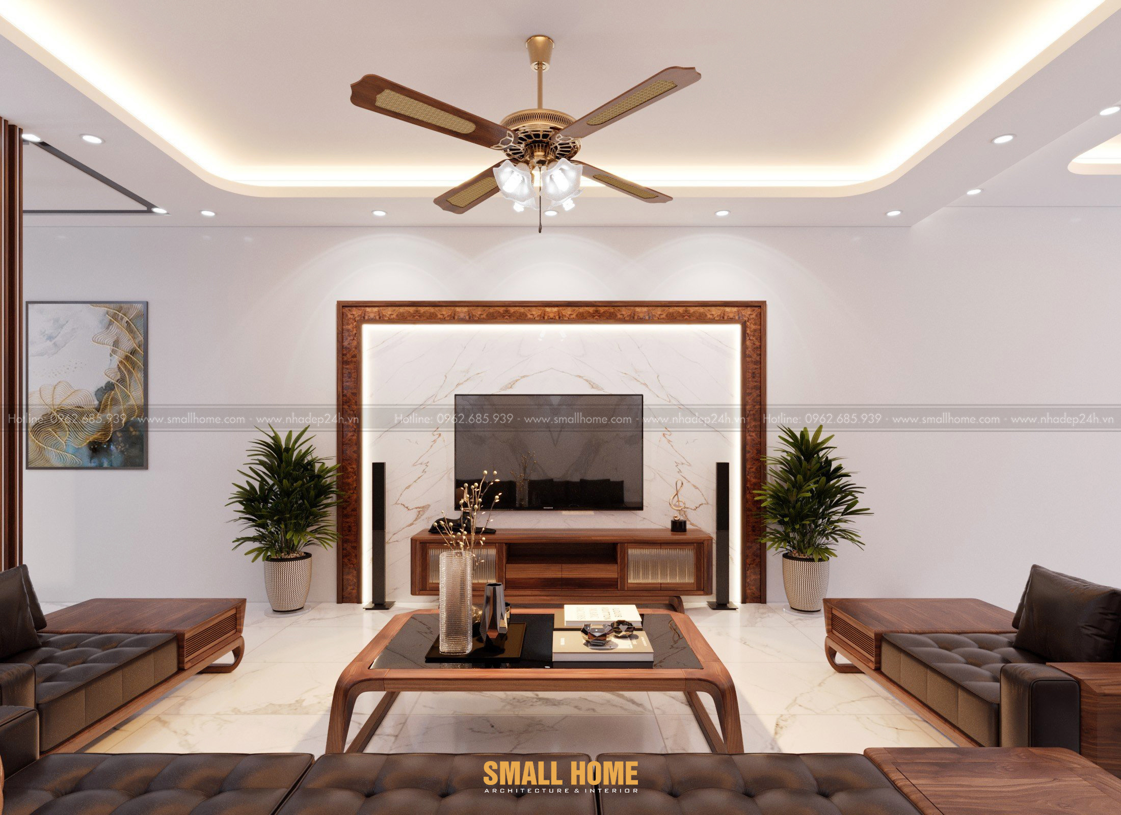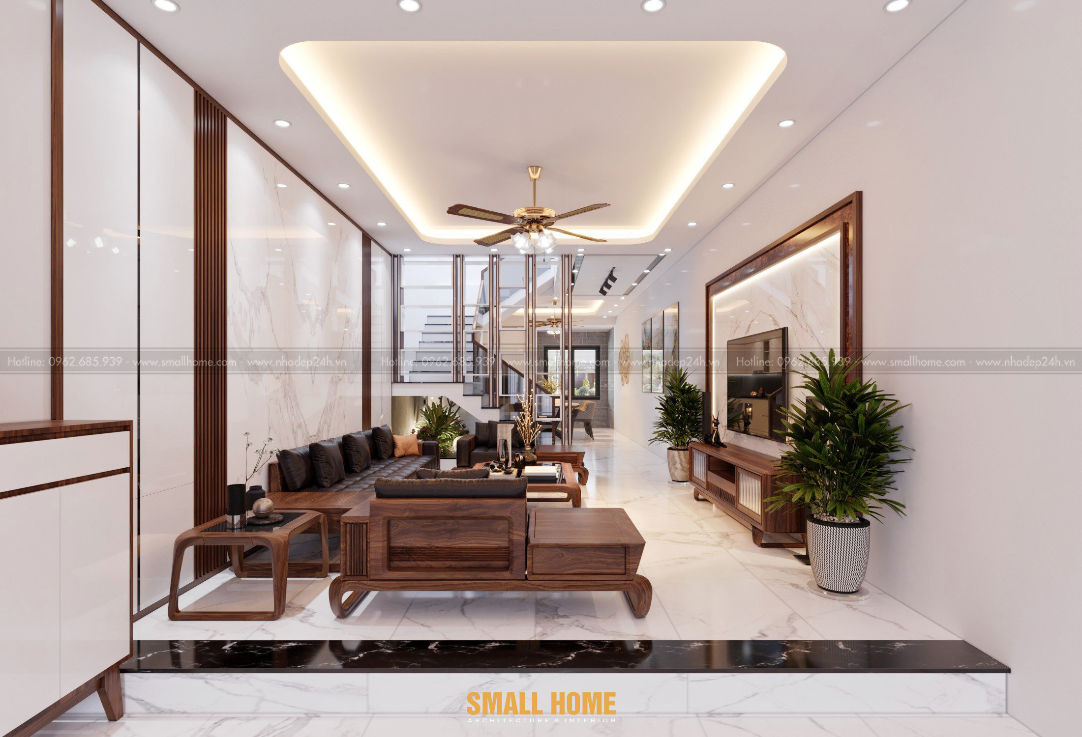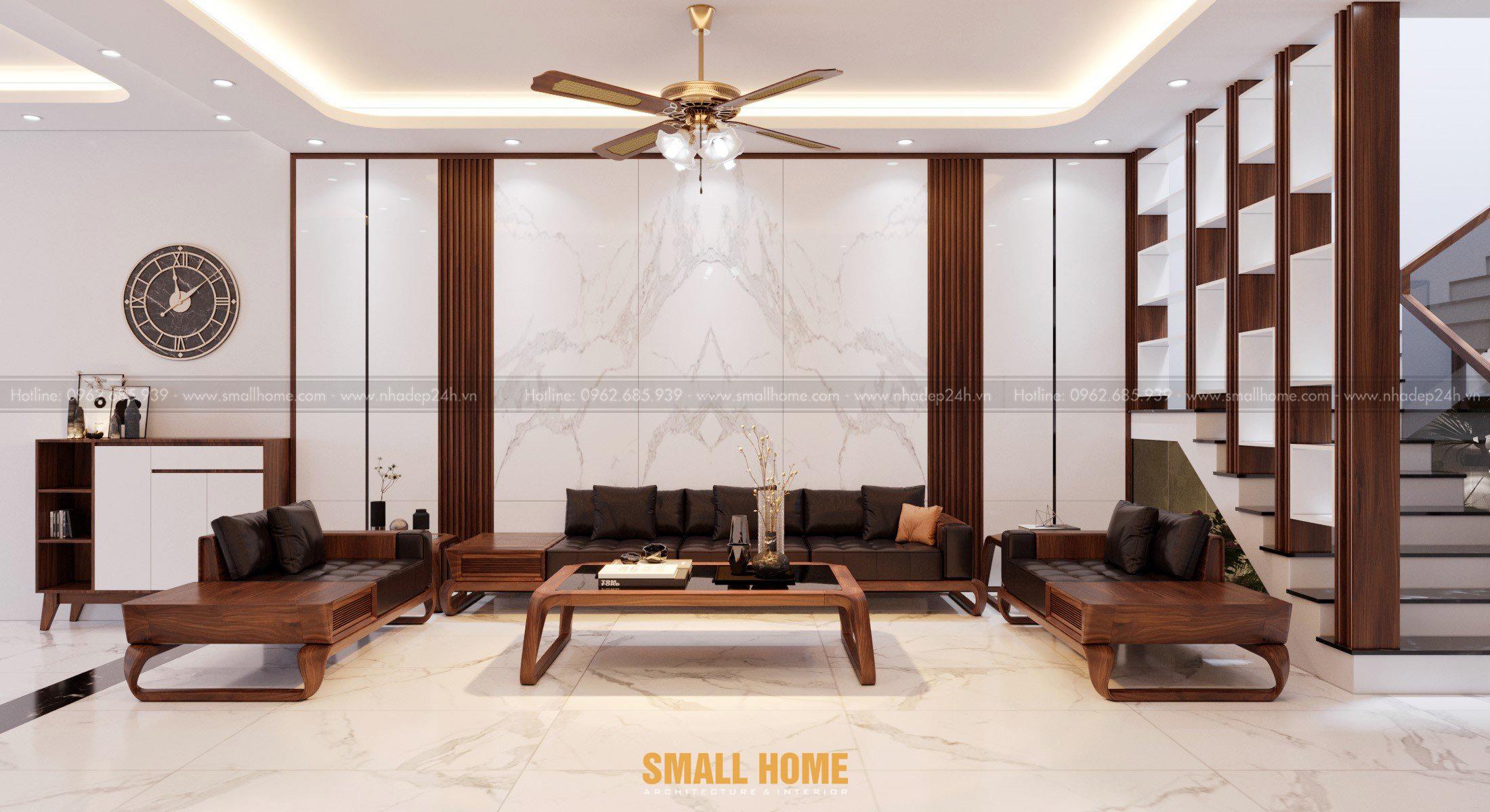 Phòng khách thiết kế kiến trúc tổng thể mặt tiền được gia đình anh Bình lựa chọn là phong cách Tân cổ điển nhưng pha chút hiện đại. Chính vì thế khi chia sẻ mong muốn thiết kế nội thất với Smallhome, thì anh đã lựa chọn thiết kế nội thất theo phong cách hiện đại, tối giản nhưng sang trọng.