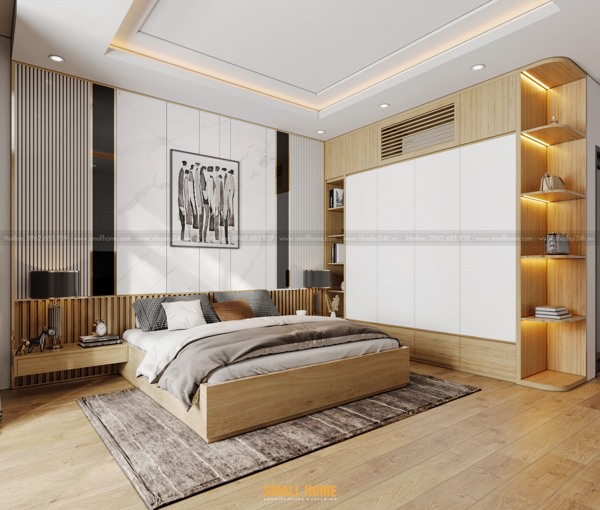 Khi thiết kế phòng ngủ master, Smallhome ưu tiên không gian thoáng, rộng rãi, màu sắc nhẹ nhàng với tone màu vân gỗ vàng nhạt và màu trắng của gỗ MDF An Cường. Vì đây là phòng ngủ của 2 vợ chồng, nên phần trang trí vách ốp tường sẽ được chú trọng hơn, phần vách trang trí đầu giường được ốp tấm PVC vân đá tráng gương, kết hợp cùng hệ nan gỗ màu trắng, điểm nhấn thêm 2 mảng alu gương đen bóng, cùng những đường chỉ inox màu vàng.