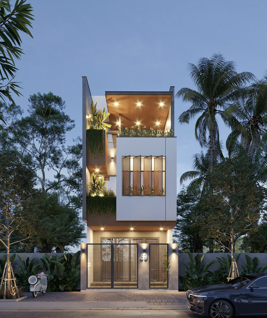 Khối ban công tầng 2 lệch ra ngoài so với tầng 1 và tầng 3 mang đến sự khác biệt, khiến khách qua đường dù đứng gần hay xa vẫn cảm thấy bị thu hút. gần 1.5m. Cửa gỗ lá sách cùng với tiểu cảnh xanh mát, tạo nên hiệu ứng cuốn hút, tinh tế và đầy sức hút cho mẫu thiết kế công trình.
