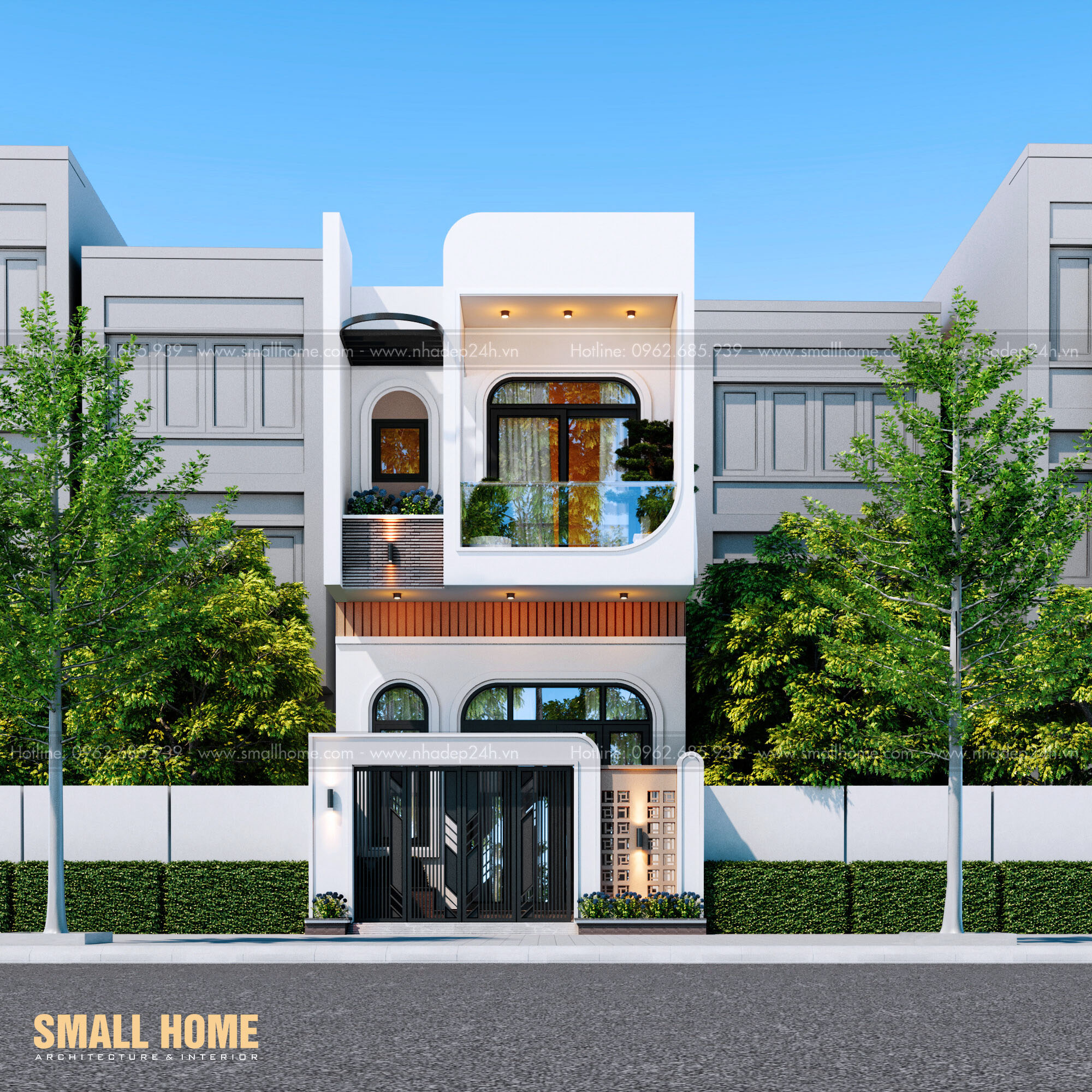 Ngắm nhìn tổng thể công trình, không khó để nhận ra thiết kế kiến trúc ngoại thất của căn nhà phố khá đơn giản, điểm nhấn tạo nên ấn tượng cho không gian mặt tiền chính là thiết kế những đường cong ở hệ cửa sổ và cửa chính. Toàn bộ tường được sơn trắng, kêt hợp ốp gỗ nhựa ngoài trời trên trần nhà và phần tường đáy trần. Tầng 2 với việc thiết kế ban công với lan can kính hiện đại, sang trọng, kết hợp cùng mái che bằng lam sắt. Phần ban công tầng 2 được thiết kế đua ra giúp mở rộng không gian và cũng là khu vực để những chậu cây xanh trang trí, điều này đã giúp cho mẫu thiết kế nhà phố diện tích 5x17m phong cách hiện đại 2 tầng khá thoáng và đẹp mắt. Không còn cảm giác chật chội cũng như gò bó và hạn hẹp của hầu hết nhà phố hiện nay.