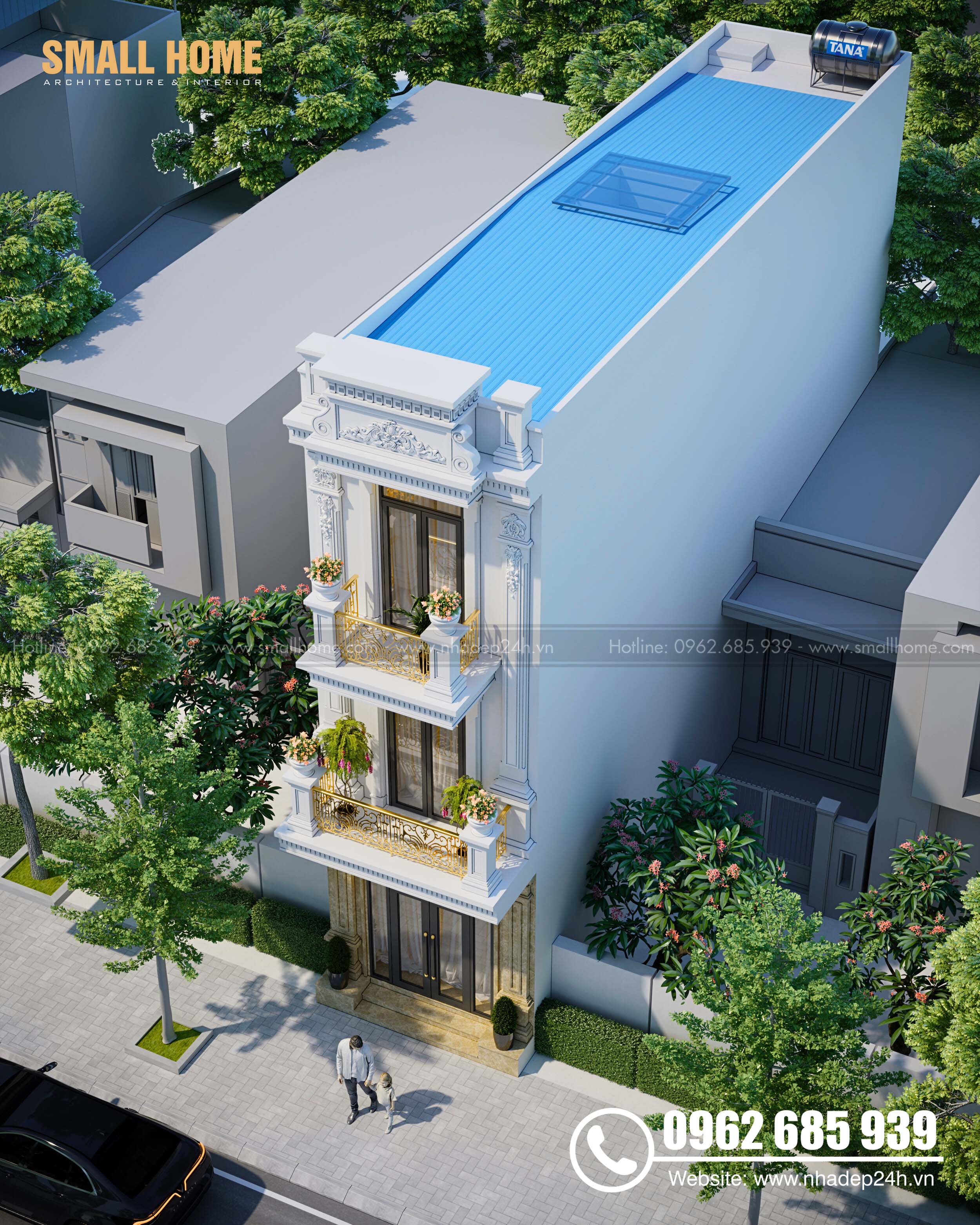 Nhìn ngắm tổng thể mẫu nhà phố tân cổ điển 3 tầng mặt tiền 4m từ trên xuống cho thấy đây chính là một mẫu thiết kế vô cùng đẹp mắt khi được lược bớt những chi tiết rườm rà, cầu kỳ. Thế nhưng vẫn mang lại một tổng thể hoàn hảo cho mẫu nhà phố này. Ngoài ra, bạn có thể thấy toàn cảnh phong cách tân cổ điển toát lên sự sang trọng, cũng như sự quý phái cho gia chủ.