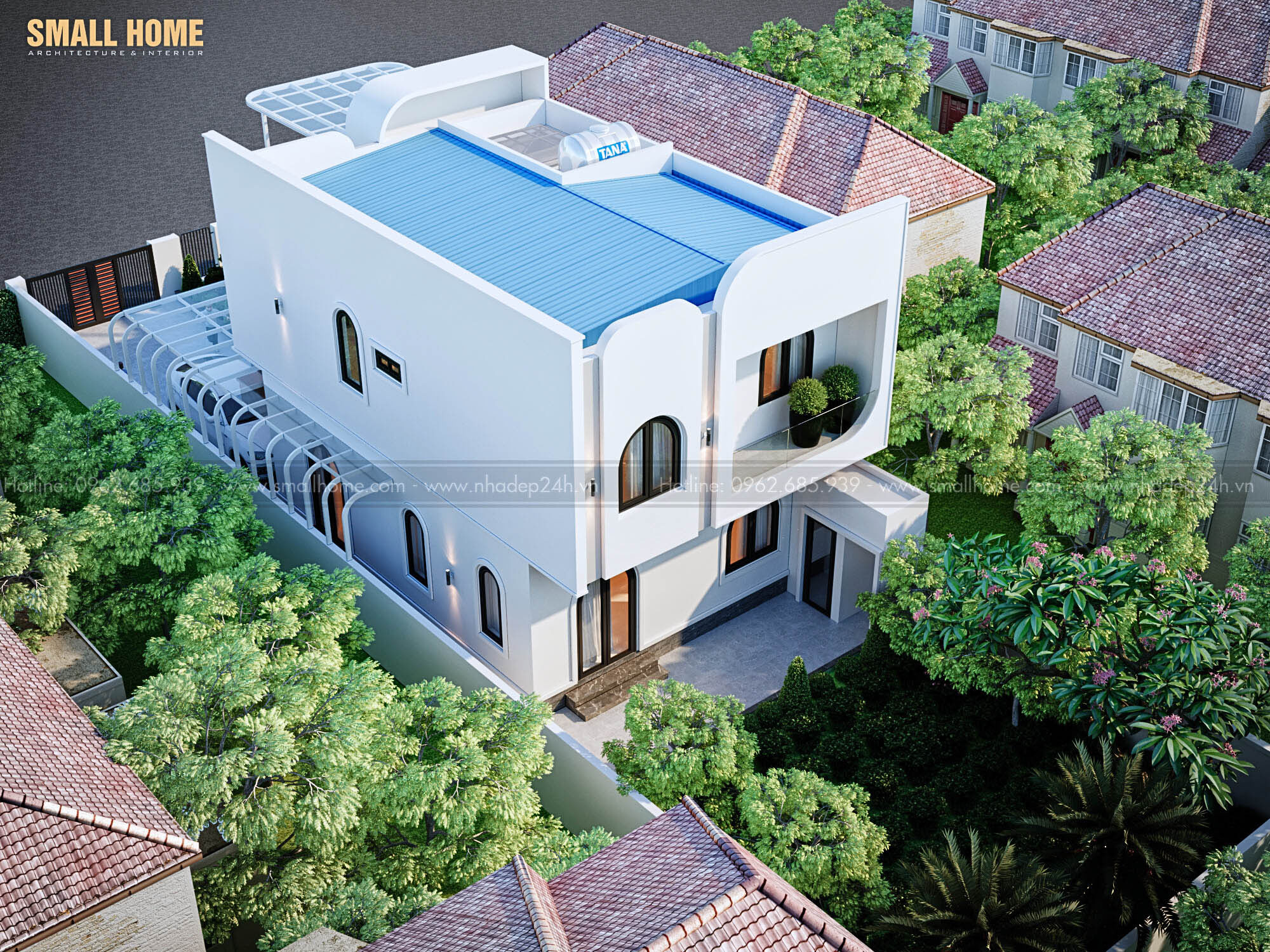 Vì ngôi nhà được thiết kế theo nhà phố phong cách Hiện đại nên hệ mái cũng sẽ được thiết kế dạng mái phẳng. Hệ lam mái lấy sáng cũng được làm bằng kính, giúp lấy sáng hoàn toàn cho khu vực thang của ngôi nhà. Đồng thời, do vấn đề về thời tiết tại miền Bắc khá khắc nhiệt vào mùa mưa và mùa hè nắng nóng, nên KTS Smallhome thiết kế bên trên mái bằng của nhà sẽ bắn thêm hệ mái tole để đảm bảo chống thấm, chống nóng cho công trình.