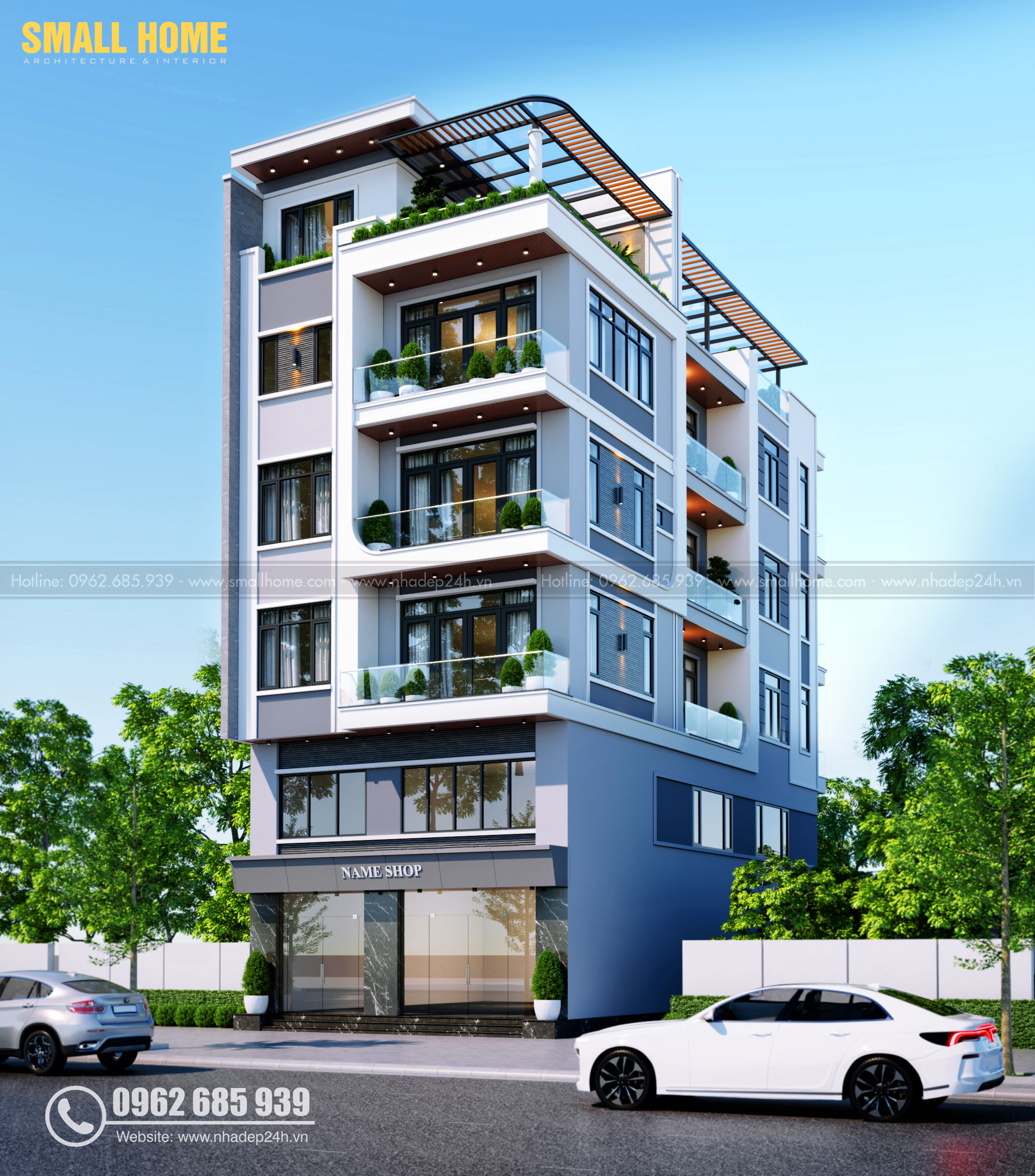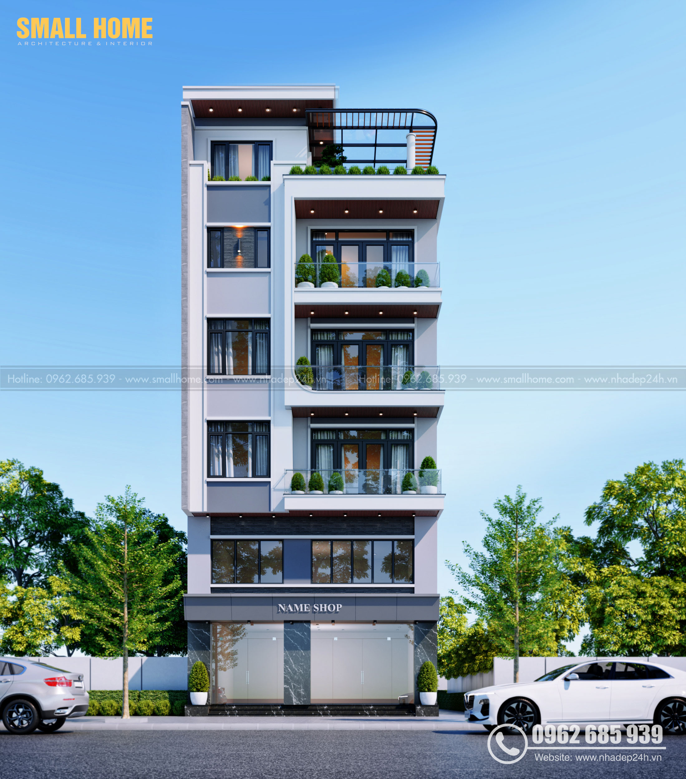 Thiết kế sử dụng chất liệu kính, lam nhôm và cây xanh trang trí mang đến vẻ đẹp đẳng cấp, đón sáng tự nhiên và tạo điểm nhấn nổi bật giữa khu đô thị. Mẫu nhà phố này đặc biệt phù hợp cho các hộ gia đình muốn kinh doanh tại nhà, mở shop, văn phòng hoặc cho thuê mặt bằng. SMALLHOME cam kết mang đến giải pháp thiết kế nhà phố toàn diện – vừa tiện nghi, thẩm mỹ vừa tối ưu kinh tế cho chủ đầu tư.