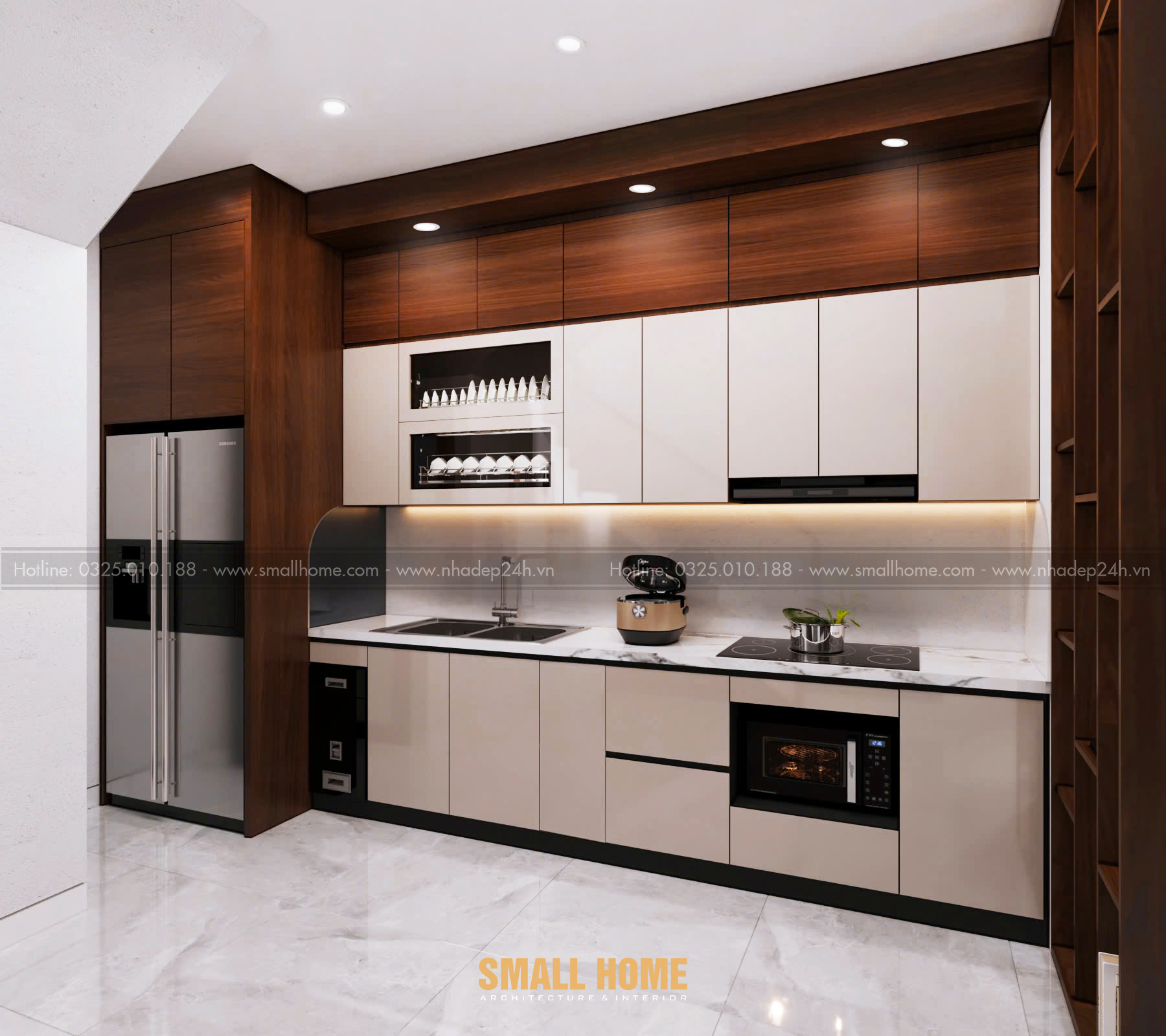 Khu vực bếp là nơi được các Kiến trúc sư Smallhome chú trọng vào công năng nhiều nhất, gia đình anh Dương muốn một căn bếp đơn giản, hiện đại nhưng phải sang trọng và đầy đủ tiện nghi. Hiểu được mong muốn của gia đình anh, Smallhome đã lựa chọn thiết kế cho gia đình anh chị mẫu tủ bếp trên kết hợp giữa MDF và cánh Acrylic vân gỗ sáng bóng, hệ tủ bếp dưới được dùng chất liệu nhựa đặc 3 lớp Picomat và cánh Acrylic màu trắng kem đang là xu hướng được ưa chuộng nhất trên thị trường nội thất hiện nay. Chúng mang đến một không gian sống thoải mái, có giá trị thẩm mỹ cao cho toàn bộ căn nhà.