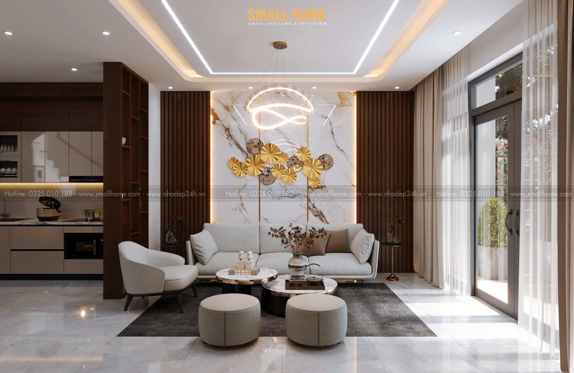 Bộ bàn ghế sofa hiện đại được bọc nỉ mút toàn bộ trong phòng khách được thiết kế với tone màu ghi sáng kết hợp bộ bàn trà khung viền inox sáng bóng, mặt bàn bằng đá trắng vân mây tạo nên sự chú ý và gây được ấn tượng đối với mọi người khi bước vào phòng khách. Hệ vách trang trí khu vực tivi và hậu sofa được các kiến trúc sư Smallhome thiết kế kết hợp độc đáo giữa nan gỗ và PVC in UV tráng gương hoa văn sang trọng, hiệu ứng đèn hắt các khe và dưới chân kệ tivi dạng treo giúp cho không gian trở nên cực sang trọng cũng như cuộc sống cực kì tiện nghi.