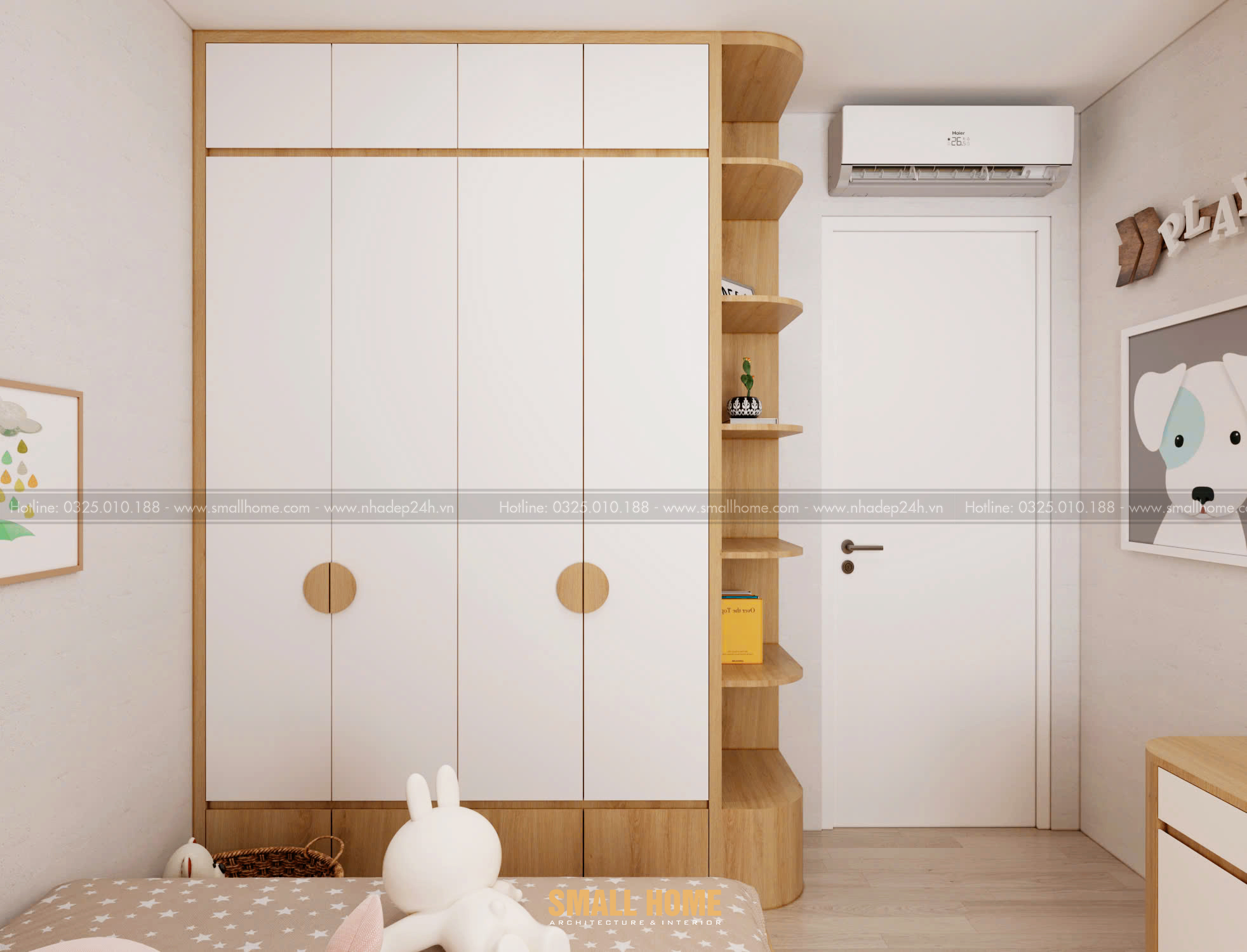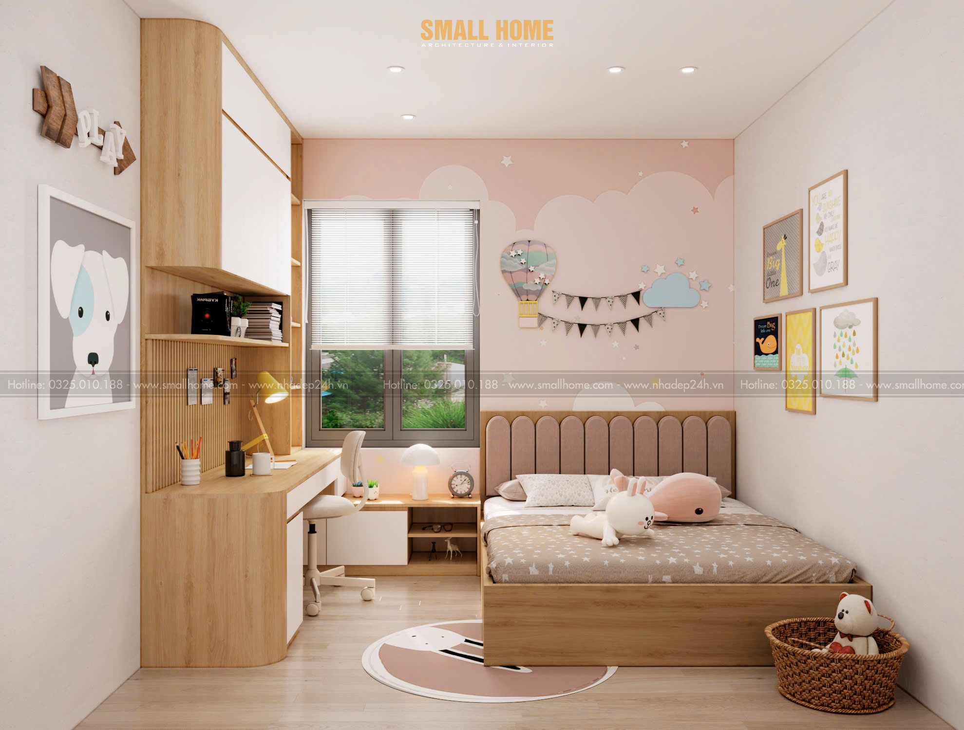 Khi nhận thiết kế phòng ngủ cho bé gái nhà anh Dương, kiến trúc sư Smallhome đã tìm hiểu những nhu cầu sử dụng của bé, bé gái thích một không gian phòng ngủ nhỏ nhắn mà phải thật ấm áp, với tone màu nhẹ nhàng, không quá sặc sỡ hoặc không quá lạm dụng các màu hồng để dùng tới khi trưởng thành. Hiểu được mong muốn của bé và gia đình, Smallhome đã lựa chọn màu gỗ công nghiệp mã 388 là màu được sử dụng rất nhiều phù hợp với mọi lứa tuổi, mọi không gian nội thất.