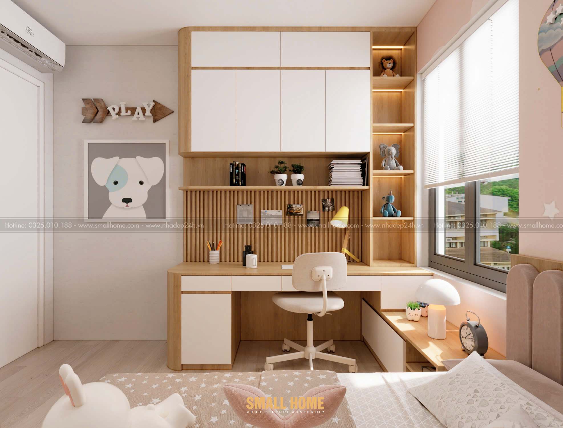 Bàn học được thiết kế bo cong góc khéo léo, đồng thời thiết kế nhiều ngăn kéo kết hợp cánh mở để tăng khả năng lưu trữ đồ. Tủ sách dạng treo cao sát trần, được thiết kế 4 cánh mở thấp và 2 cánh mở rộng trên cao. Để tăng nhu cầu để đồ, Smallhome thiết kế thêm cho bé gái một kệ nhiều đợt trên bàn học, được thiết kế thêm hệ đèn led thanh nhôm hắt sáng làm tăng tính thẩm mỹ cho cả căn phòng.