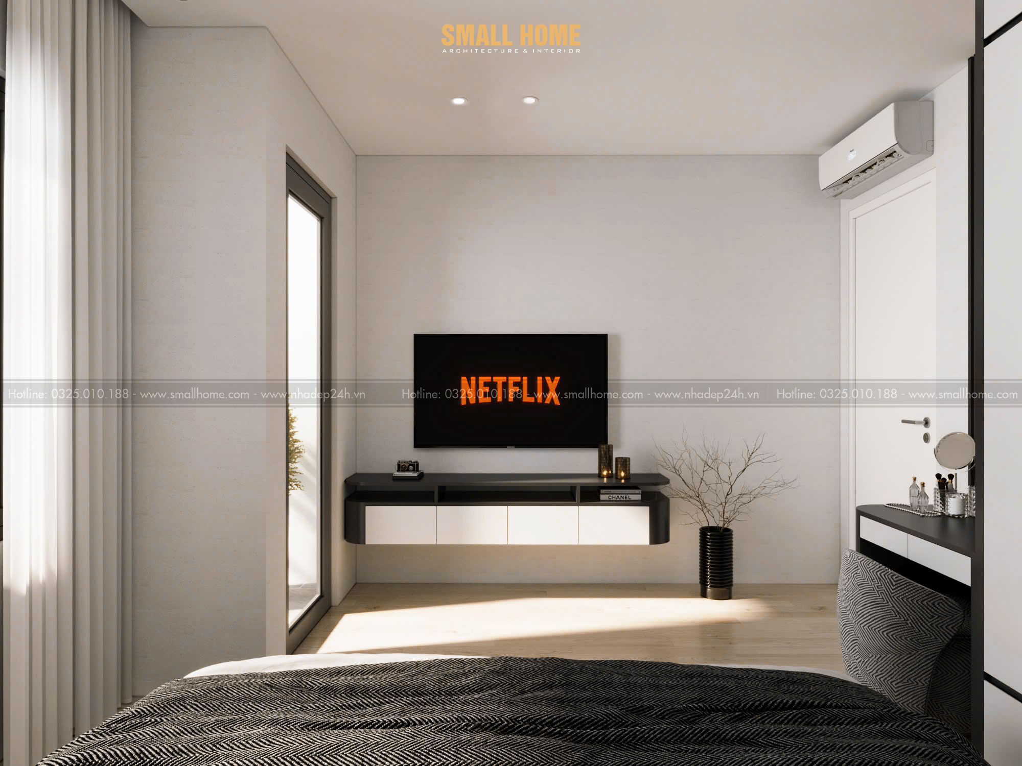 Kệ tivi thiết kế dạng treo, được bo cong 2 bên giúp tránh va quệt vào người khi di chuyển trong phòng. Smallhome khéo léo thiết kế thêm một mặt cong bên trên kệ tivi cơ bản để tạo điểm nhấn, đồng thời để tăng chức năng sử dụng của kệ tivi. Với chất liệu gỗ công nghiệp bền, đẹp, sang trọng, Smallhome đã thiết kế cho gia đình anh Dương một phòng ngủ nhỏ gọn, mà cũng rất tiện nghi với chi phí không hề cao, đáp ứng đầy đủ nhu cầu sử dụng của gia đình anh chị.