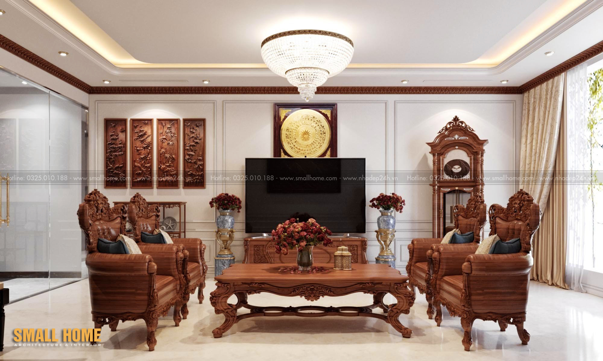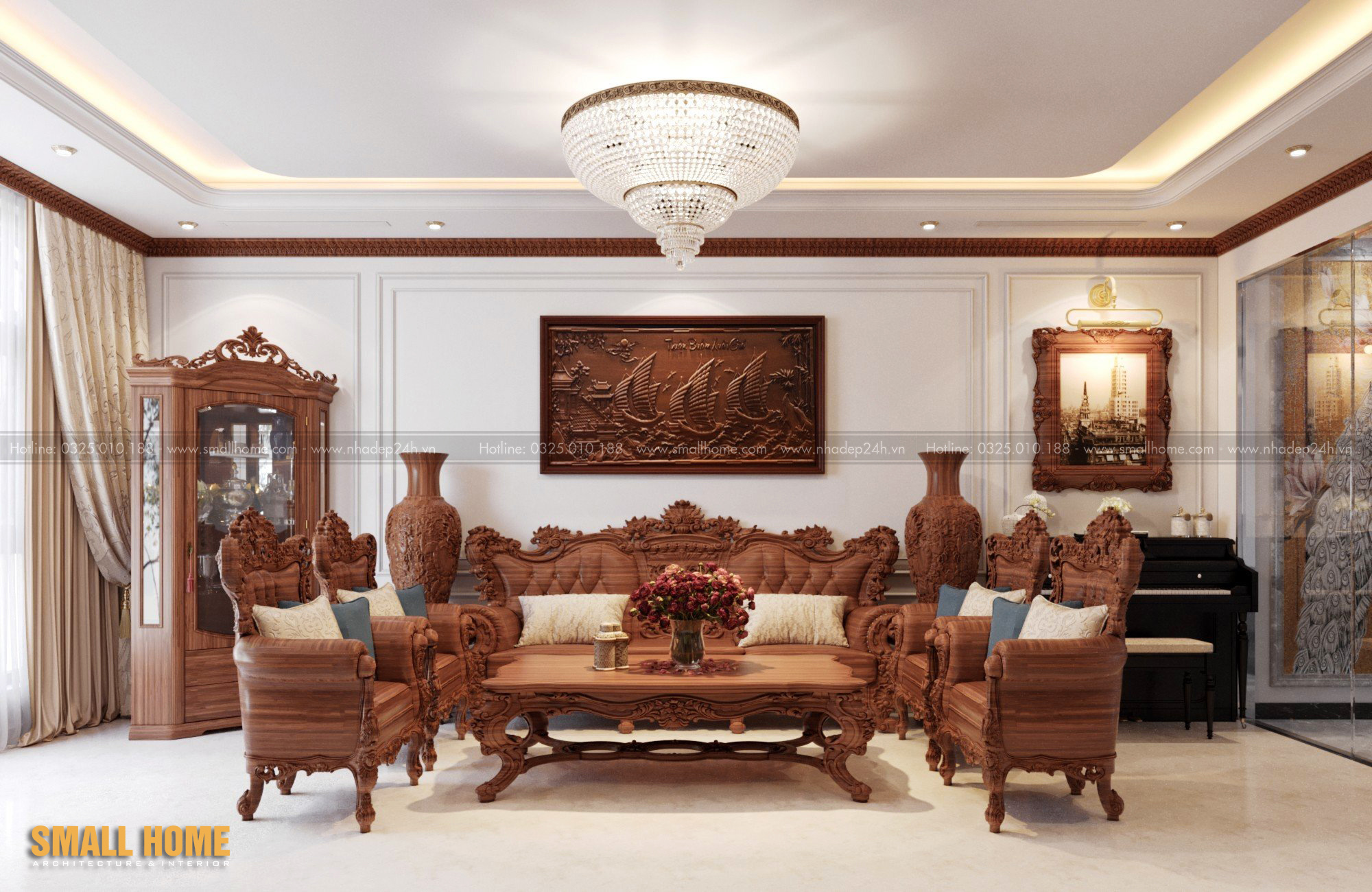 Nhắc đến nội thất phòng khách không thể không nói đến bàn ghế phòng khách. Tại đây, chúng tôi lựa chọn phong cách tân cổ điển cho không gian của gia chủ nổi bật với một bộ bàn ghế gỗ tự nhiên nguyên khối với các chi tiết hoa văn tân cổ điển đẹp để trang hoàng cho phòng khách chính. Màu nội thất gỗ Gõ đỏ được chọn làm điểm nhấn của phòng khách, khiến cho phòng khách càng sang trọng và quý phái hơn.