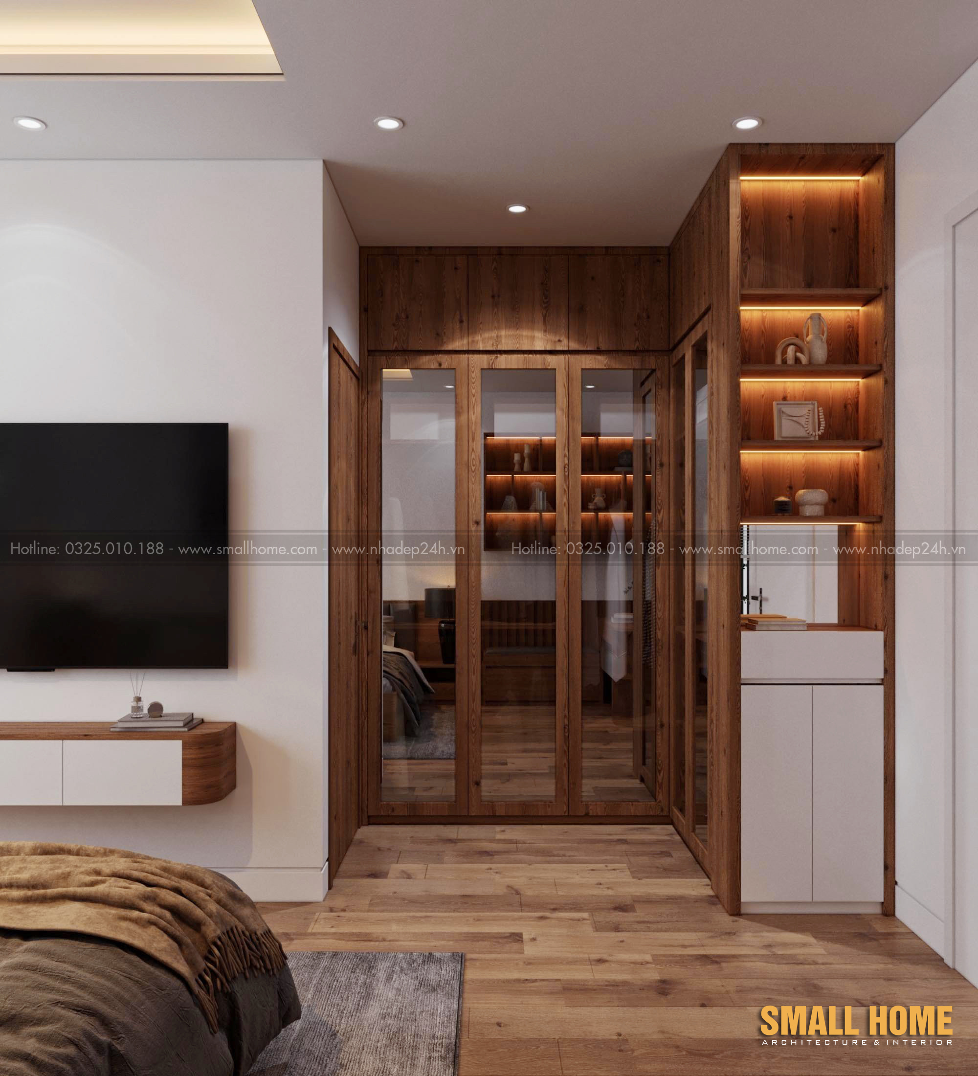 Khi thiết kế nội thất phòng ngủ, anh Sỹ yêu cầu tủ quần áo cho các con phải rộng rãi, để đảm bảo nhu cầu sử dụng của các con. Hệ tủ quần áo gỗ công nghiệp kết hợp cánh kính cường lực vô cùng sang trọng và hiện đại.
