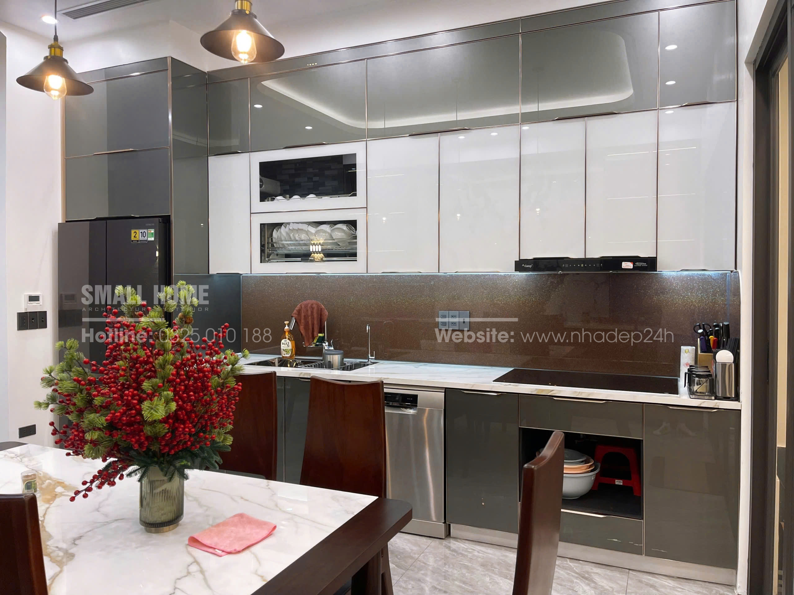 Liền kề là khu vực bếp – ăn, nơi Smallhome bố trí hệ tủ bếp chữ I chất liệu inox cánh kính cường lực, kết hợp thiết bị hiện đại. Không gian ăn uống trở nên ấm cúng, tiện nghi mà vẫn tối ưu diện tích.