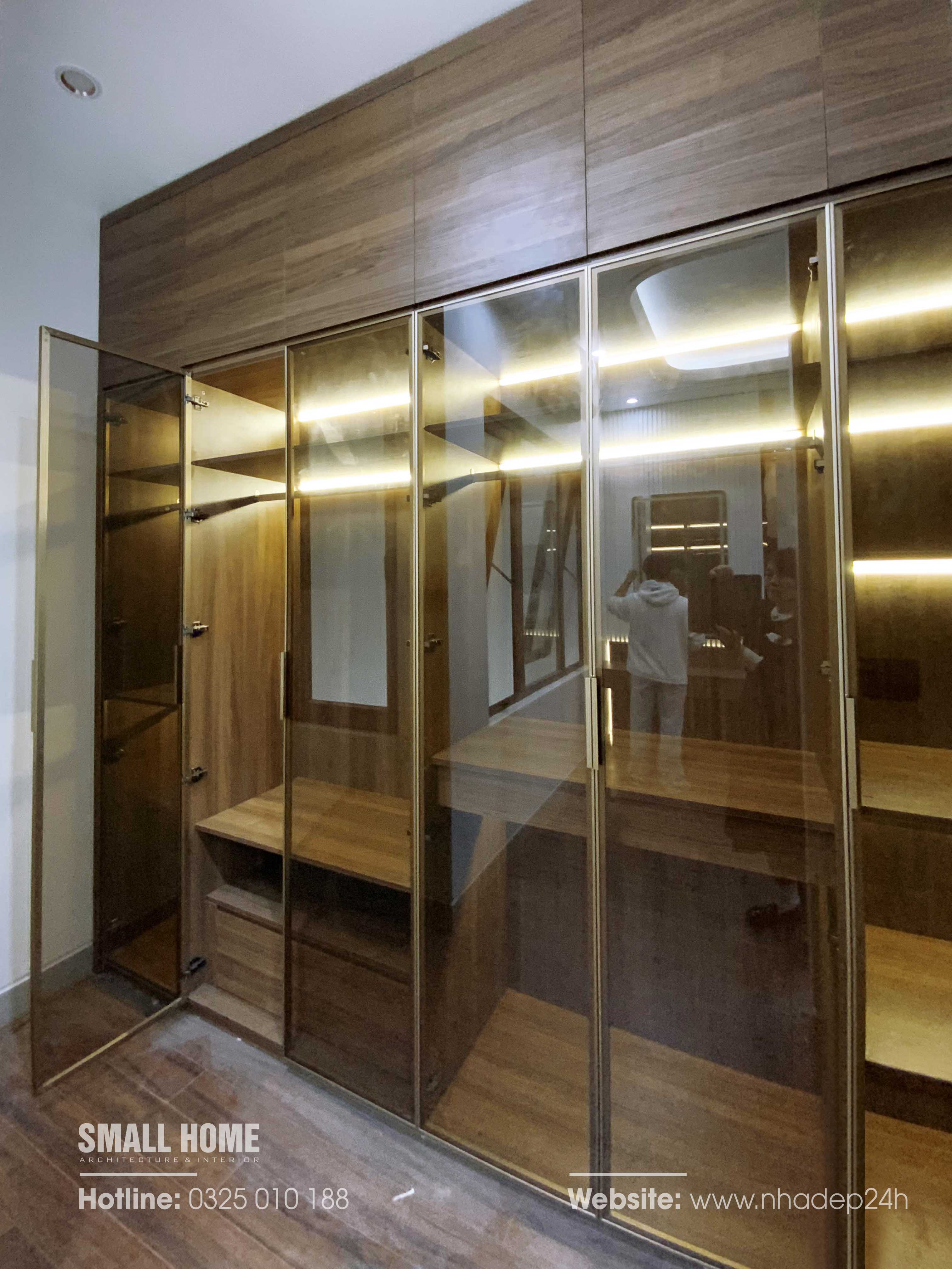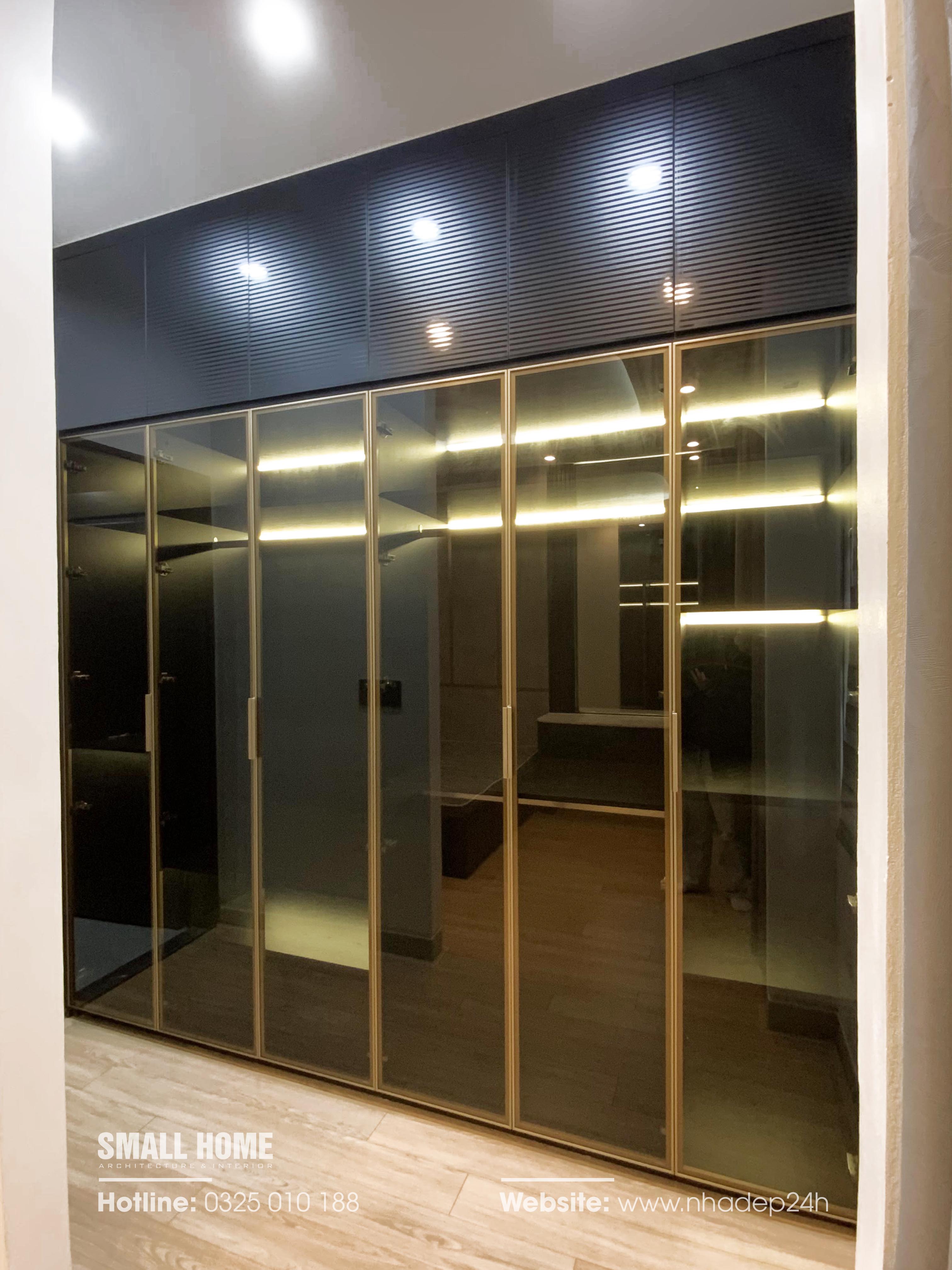 Tủ quần áo cánh kính khung nhôm vàng Champagne là điểm nhấn đặc biệt. Thiết kế full trần, ánh sáng led ẩn bên trong tạo cảm giác hiện đại và cao cấp như tủ đồ của các fashionista.