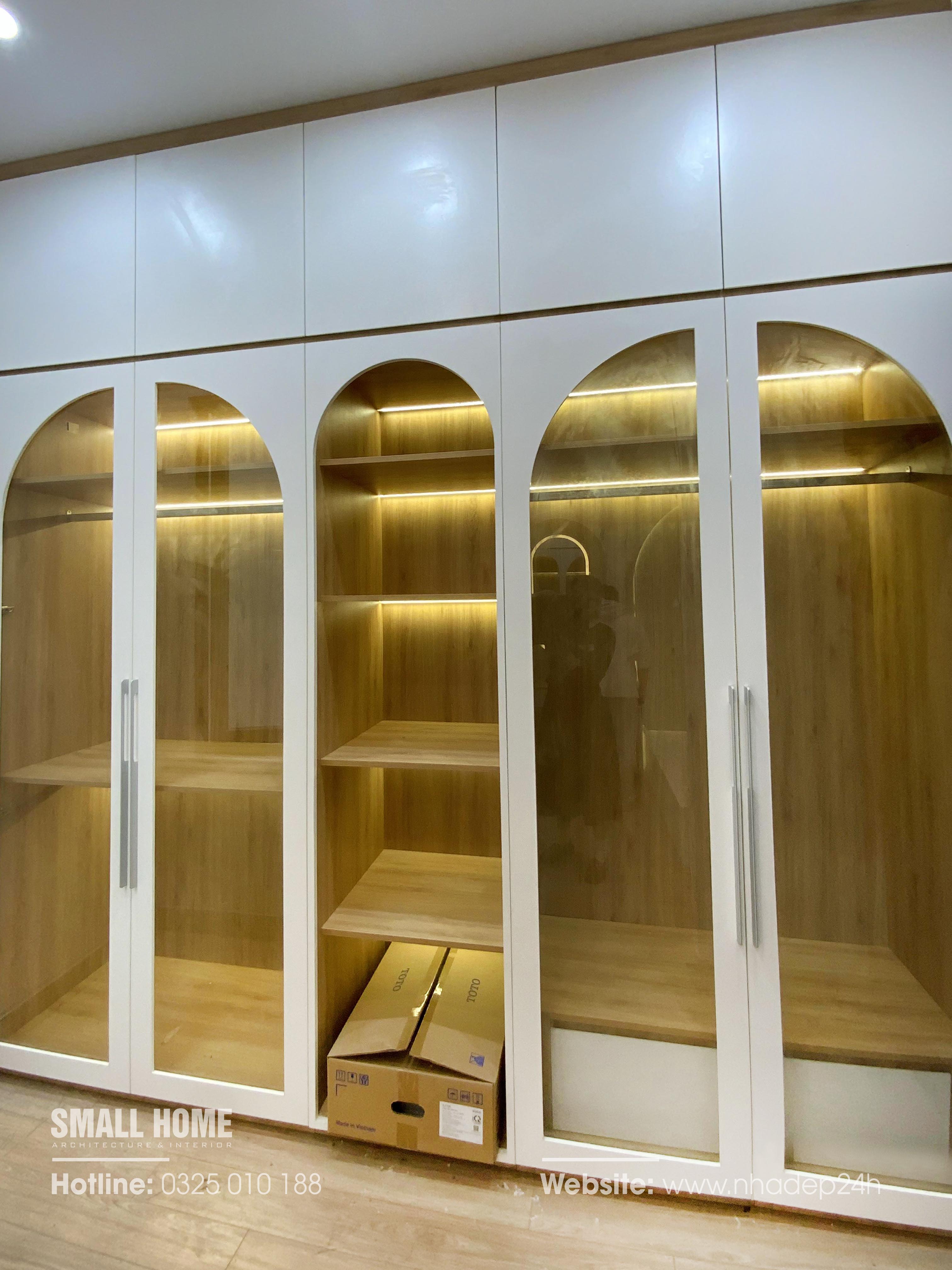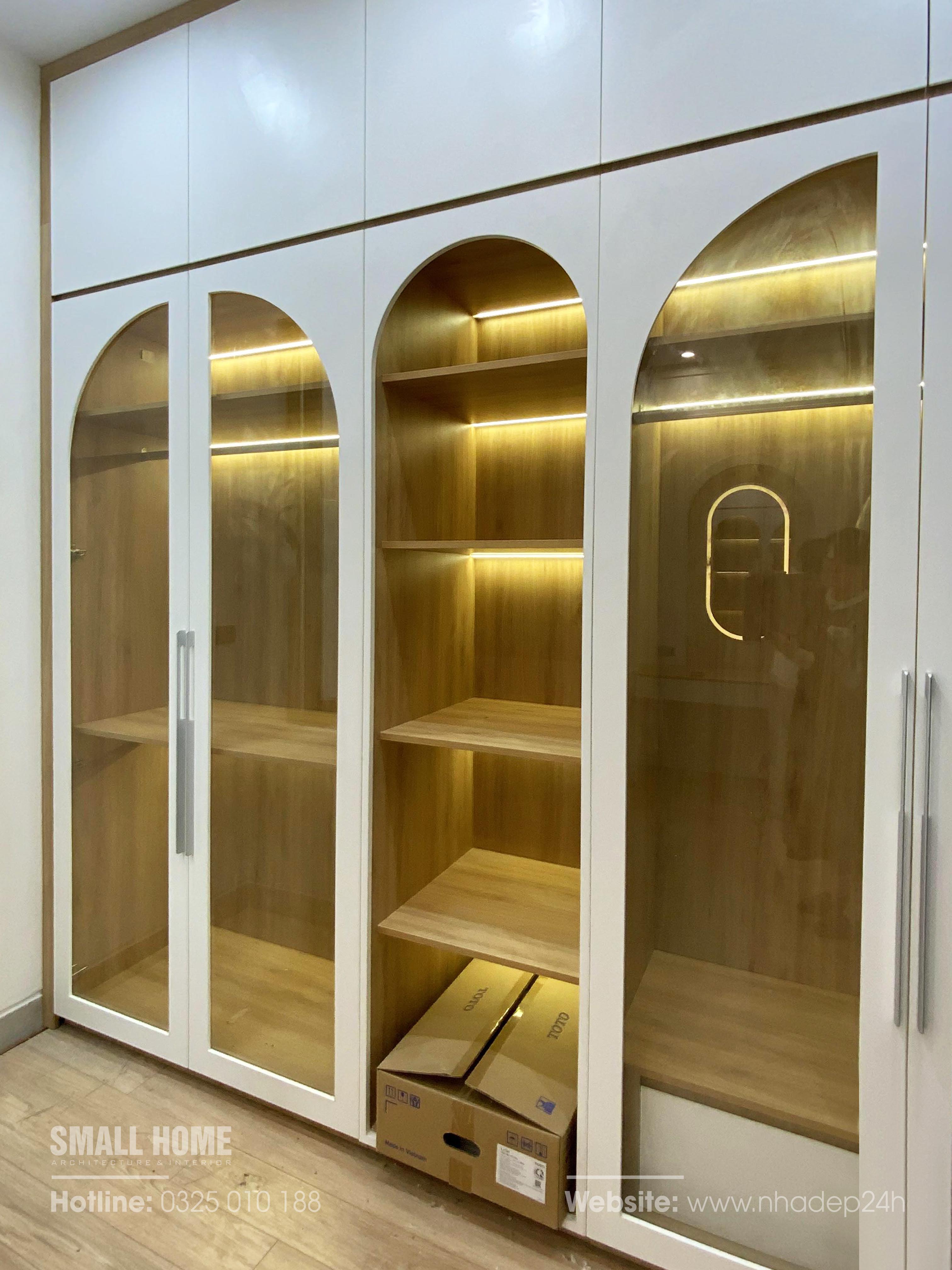 Tủ quần áo cánh kính vòm bo cong là điểm nhấn nổi bật của căn phòng. Thiết kế này vừa tạo hiệu ứng chiều sâu cho không gian, vừa giúp phô diễn đồ trang trí, sách vở hoặc phụ kiện theo cách tinh tế và sinh động.