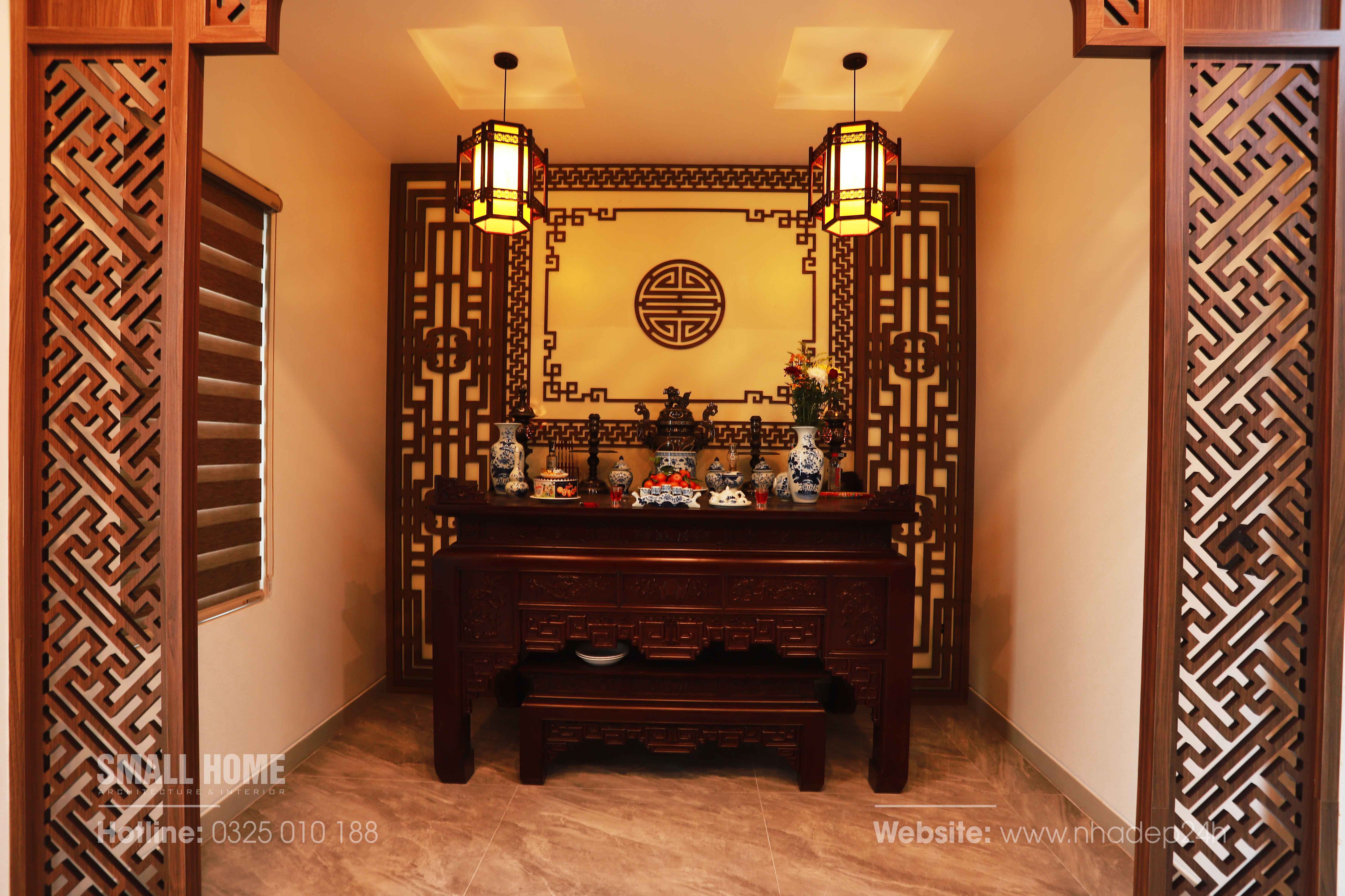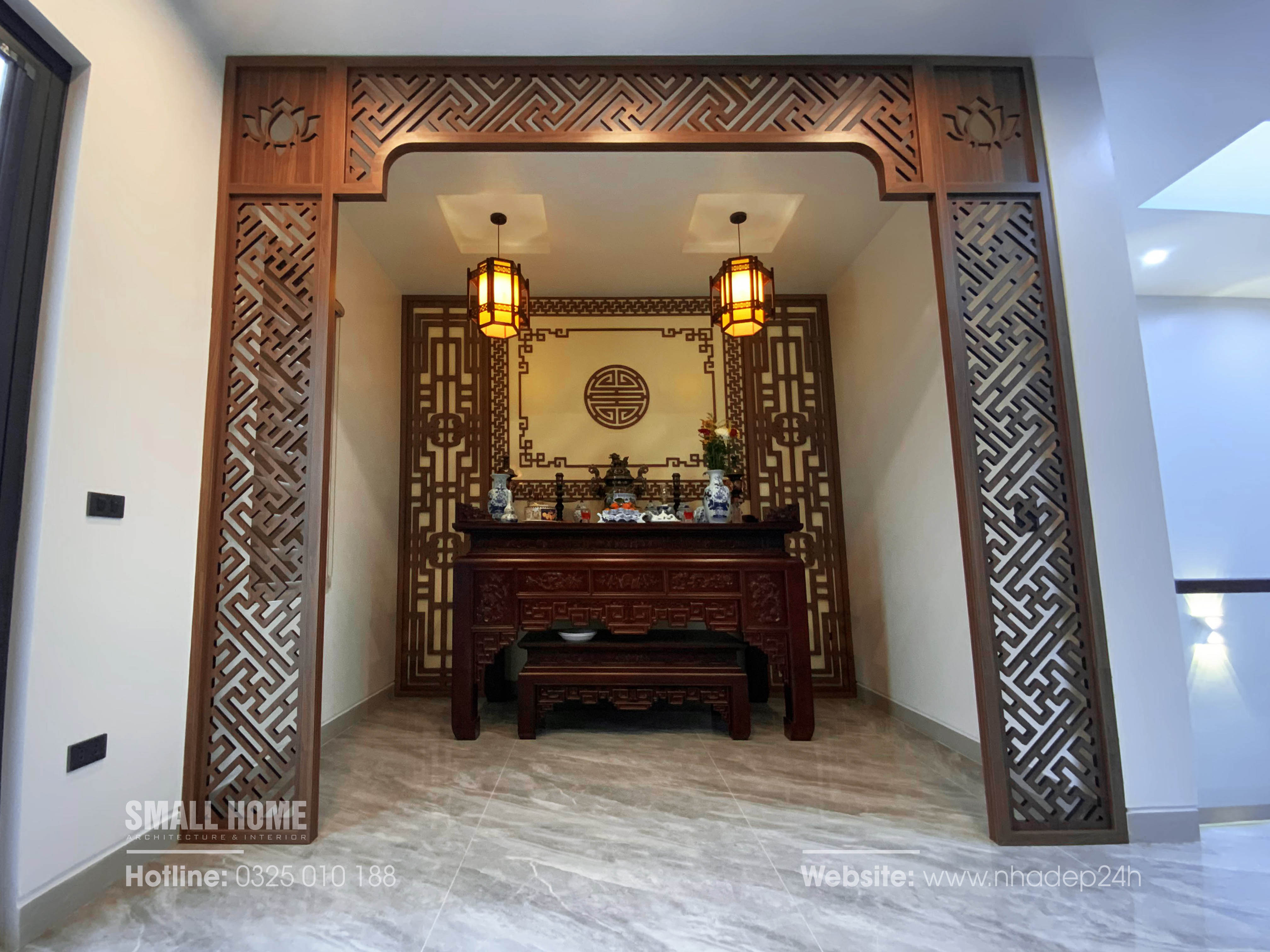 Phòng thờ được bố trí trang nghiêm, sử dụng gỗ sồi tự nhiên tạo vẻ ấm cúng, yên tĩnh. Khu vực sân phơi được bố trí khoa học, đảm bảo thông thoáng và tiện nghi cho sinh hoạt hằng ngày.