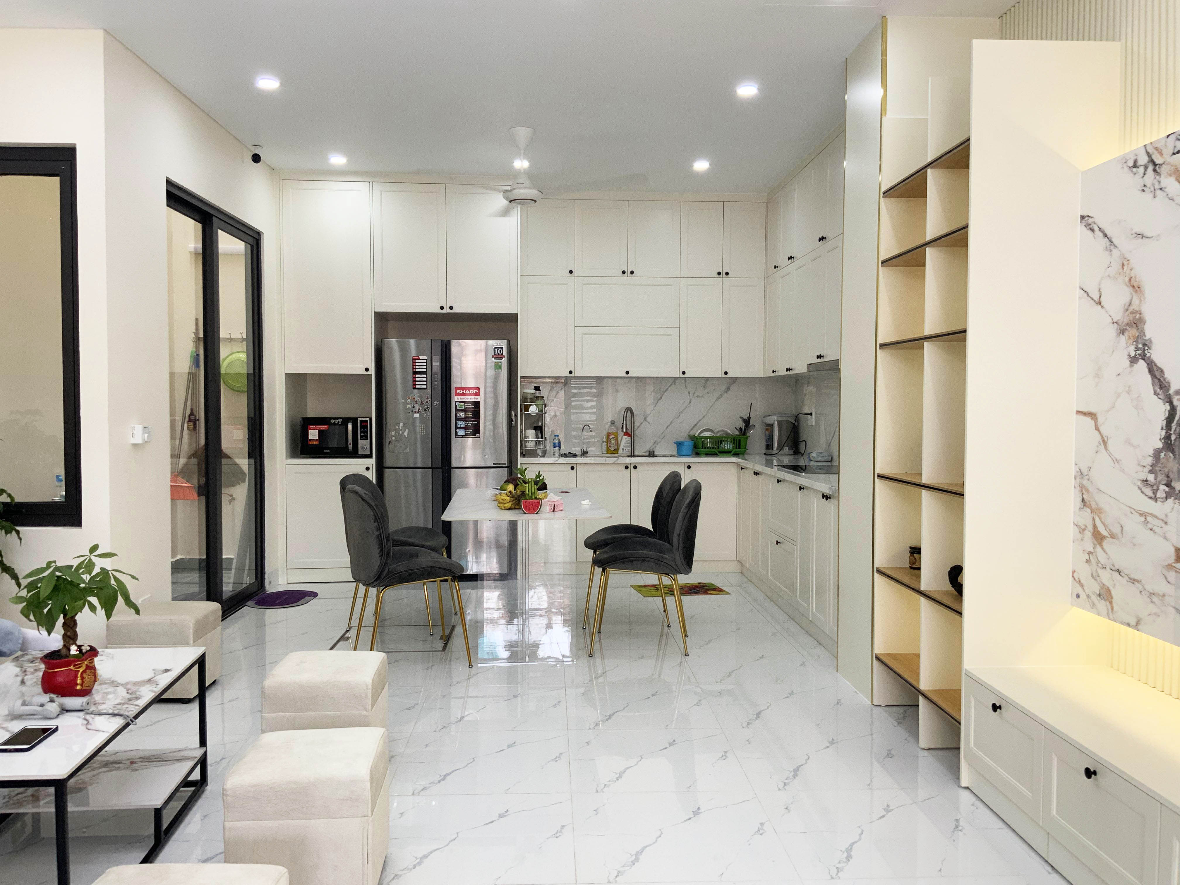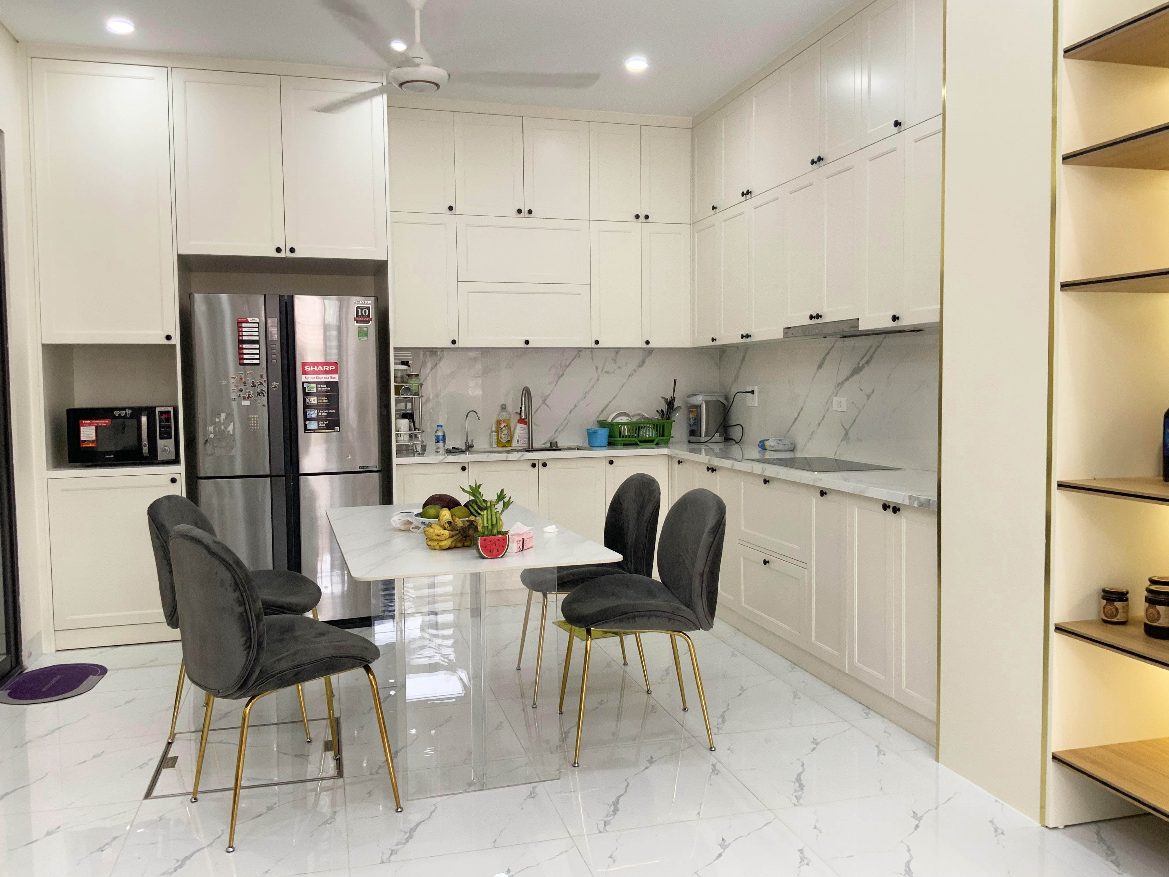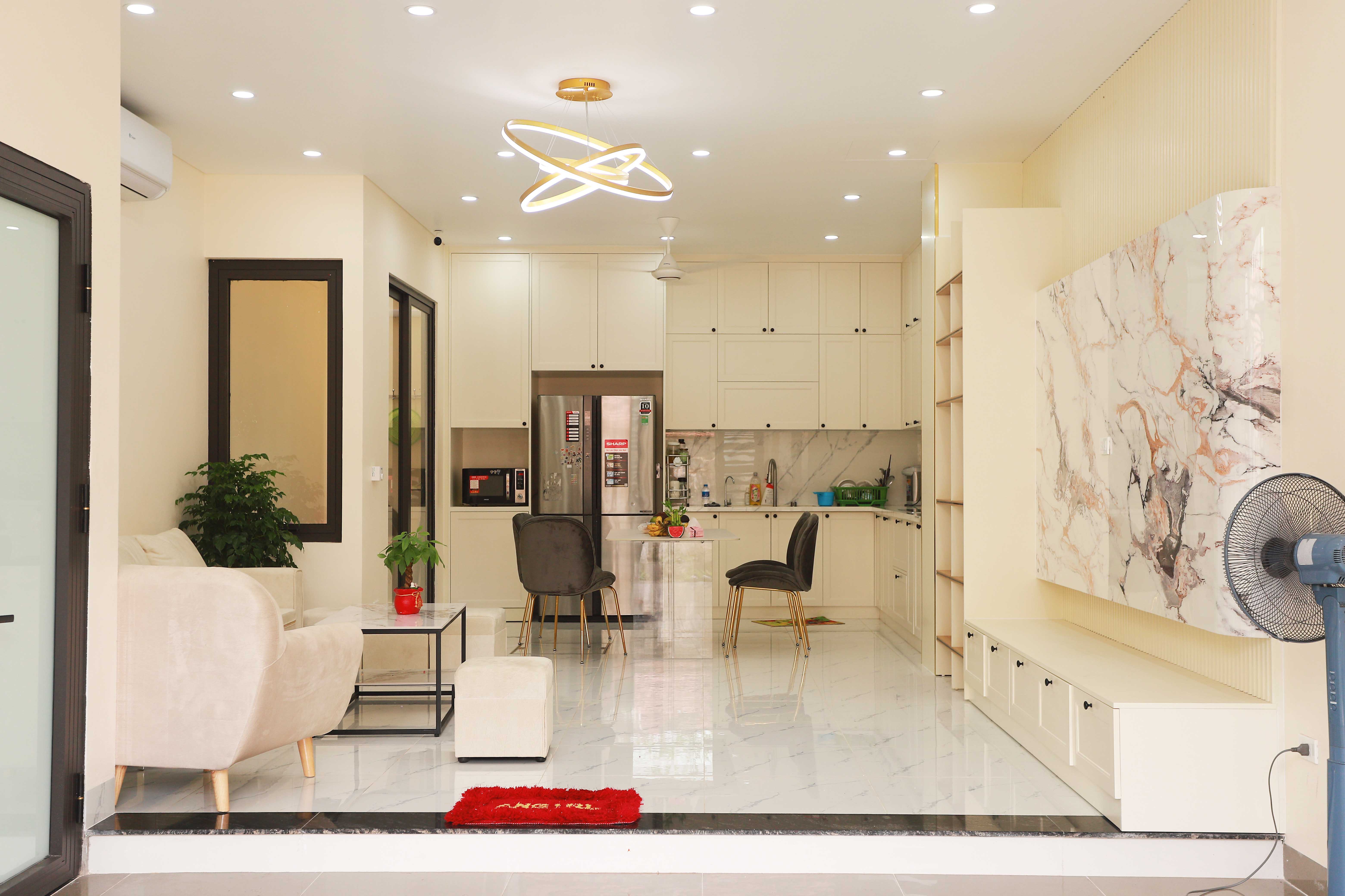 Với phong cách kiến trúc mặt tiền hiện đại, gia đình chị Lý cũng lựa chọn phong cách nội thất hiện đại đồng bộ toàn công trình. Sử dụng chất liệu gỗ công nghiệp sơn inchem tone màu kem làm màu nội thất chủ đạo, kết hợp với những đường soi phào tạo điểm nhấn. Nhìn tổng thể nội thất khu vực tầng 1 trở nên nhẹ nhàng, sang trọng và vô cùng hiện đại.