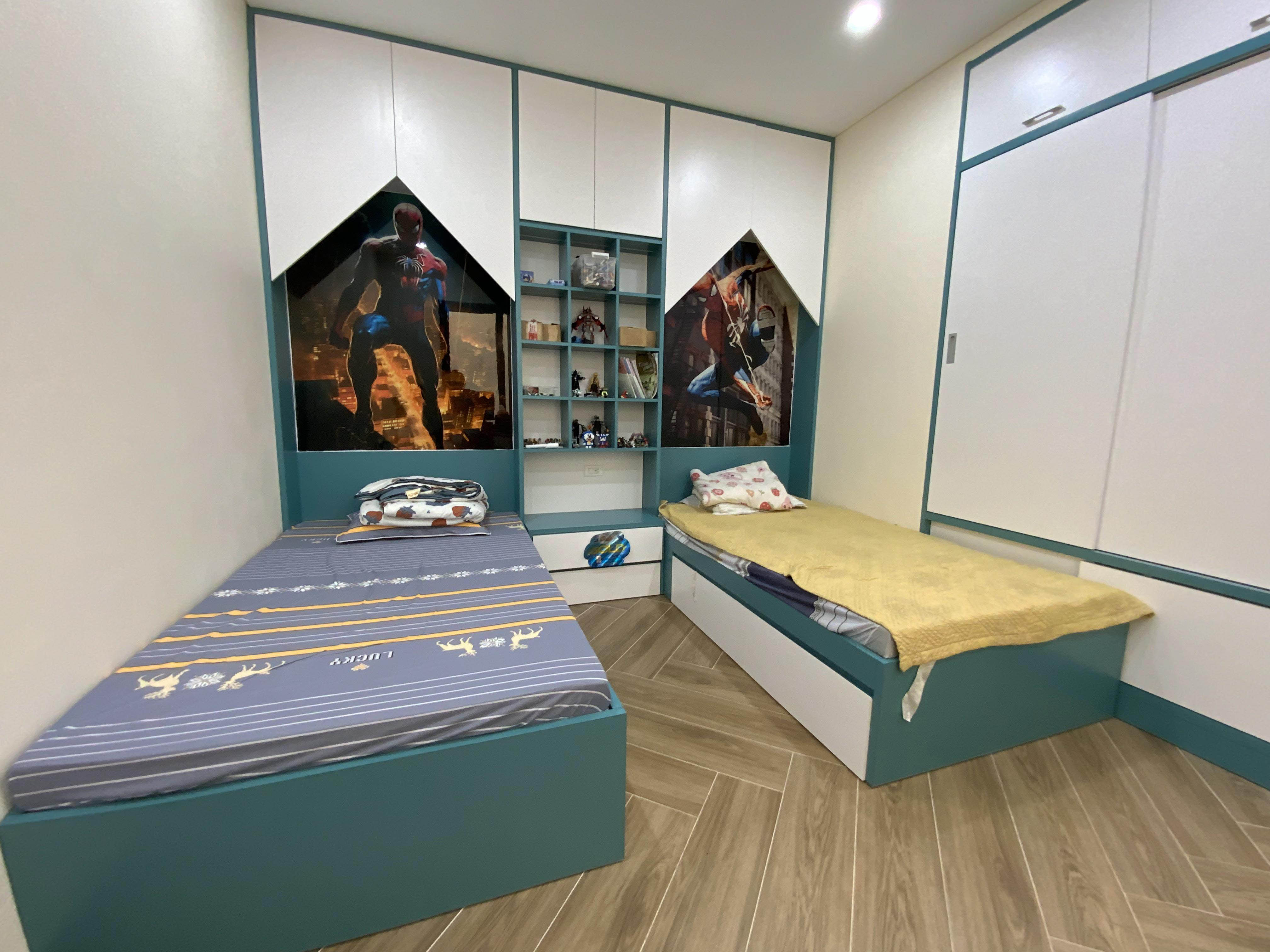 Phòng ngủ của 2 bé trai được thiết kế gọn gàng, đầy đủ công năng, được chia làm 2 hệ giường và tủ sách đầu giường riêng biệt, tạo không gian sử dụng riêng cho 2 bé. Hệ tủ quần áo âm tường, cánh lùa giúp tiết kiệm tối đa không gian sử dụng. Màu sắc chủ đạo trong phòng 2 bé trai là màu xanh lá kết hợp màu trắng. Diện tích phòng tuy nhỏ nhưng vẫn đảm bảo công năng sử dụng cho 2 bé.