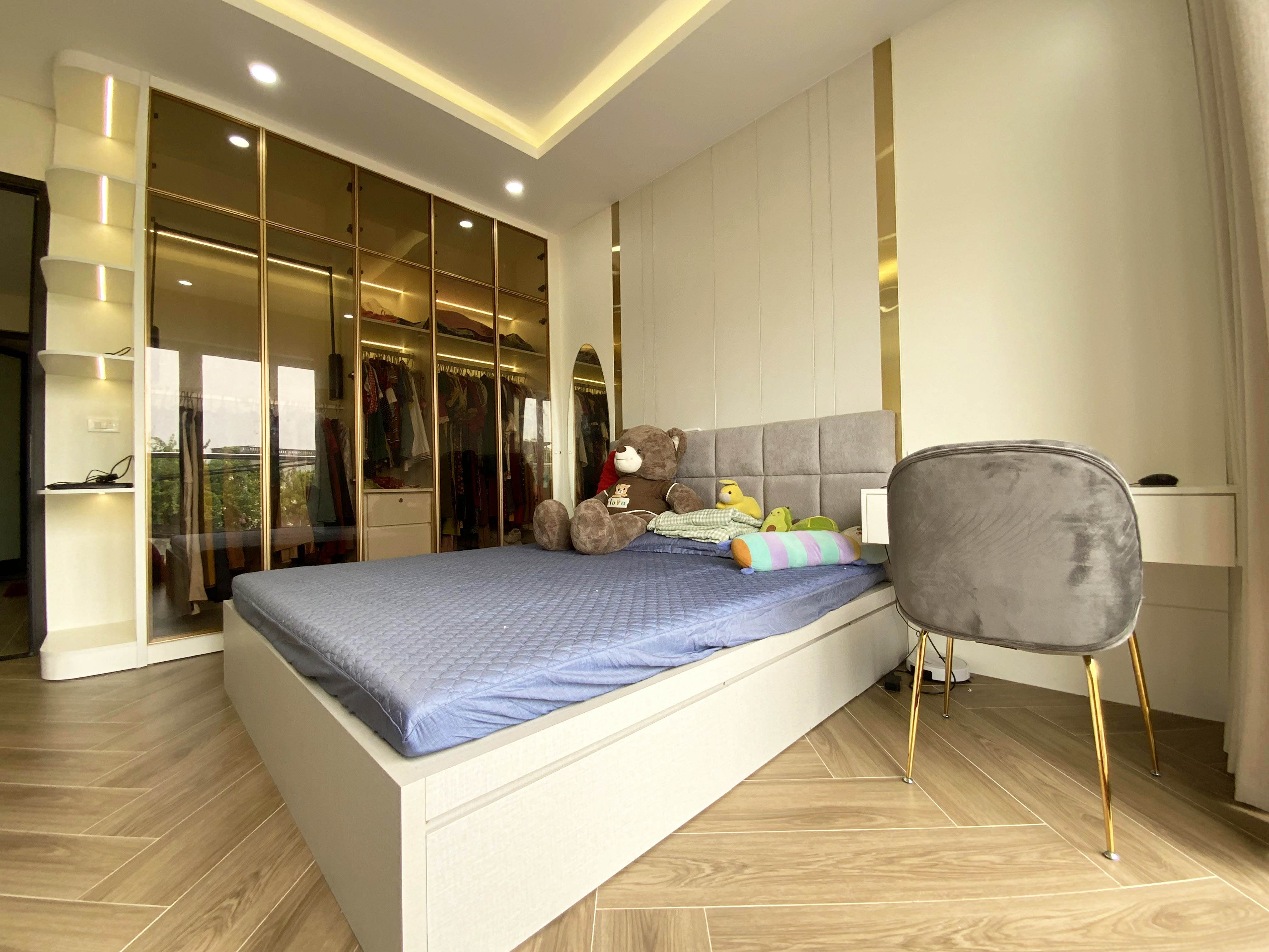 Nội thất phòng ngủ cũng được thiết kế đơn giản, hiện đại với hệ tủ quần áo cánh nhôm kính cường lực, kết hợp đèn led chiếu sáng. Giường ngủ thiết kế nhẹ nhàng với điểm nhấn là tấm đệm mút gắn đầu giường màu xám ghi, nổi bật trên nền gỗ màu kem nhạt.