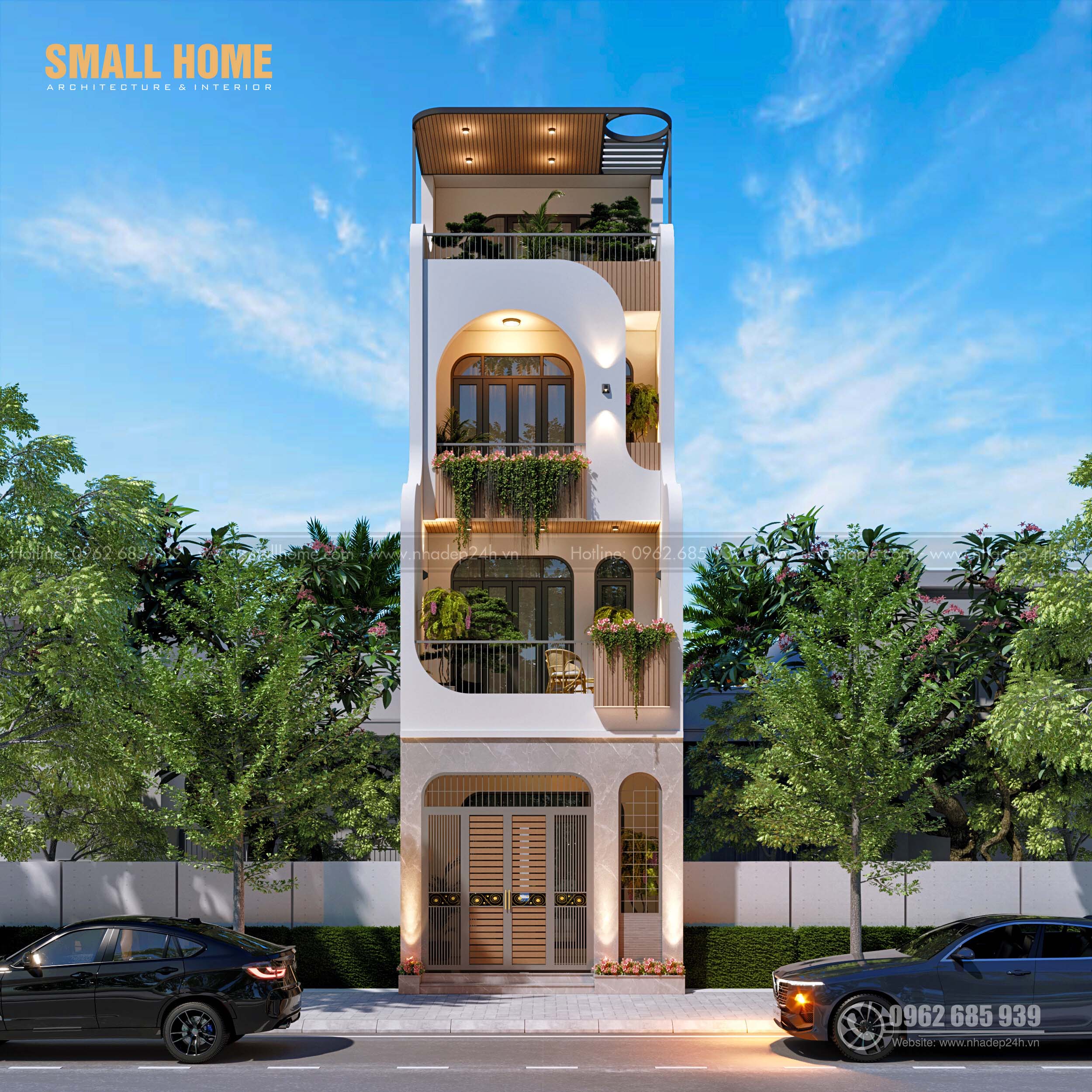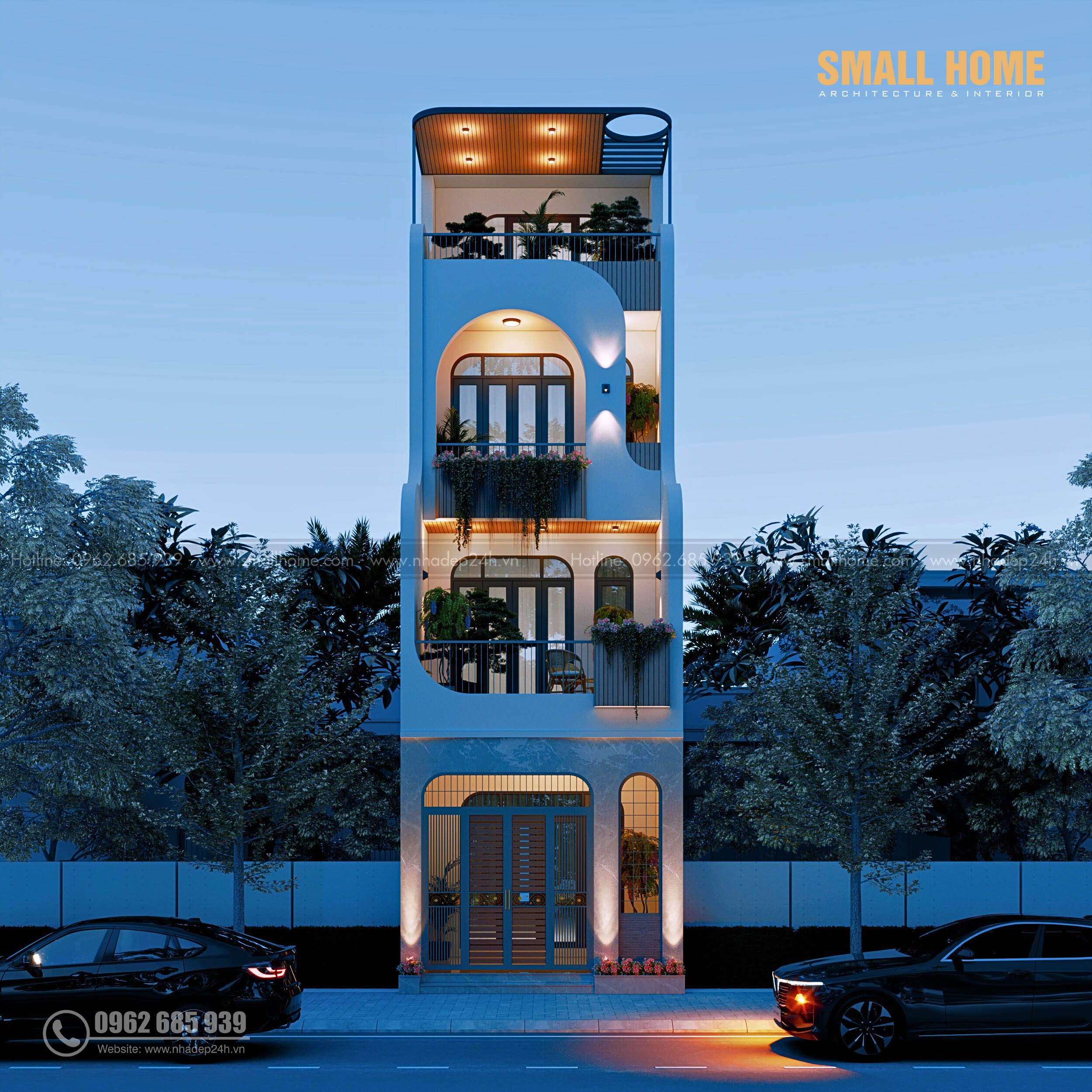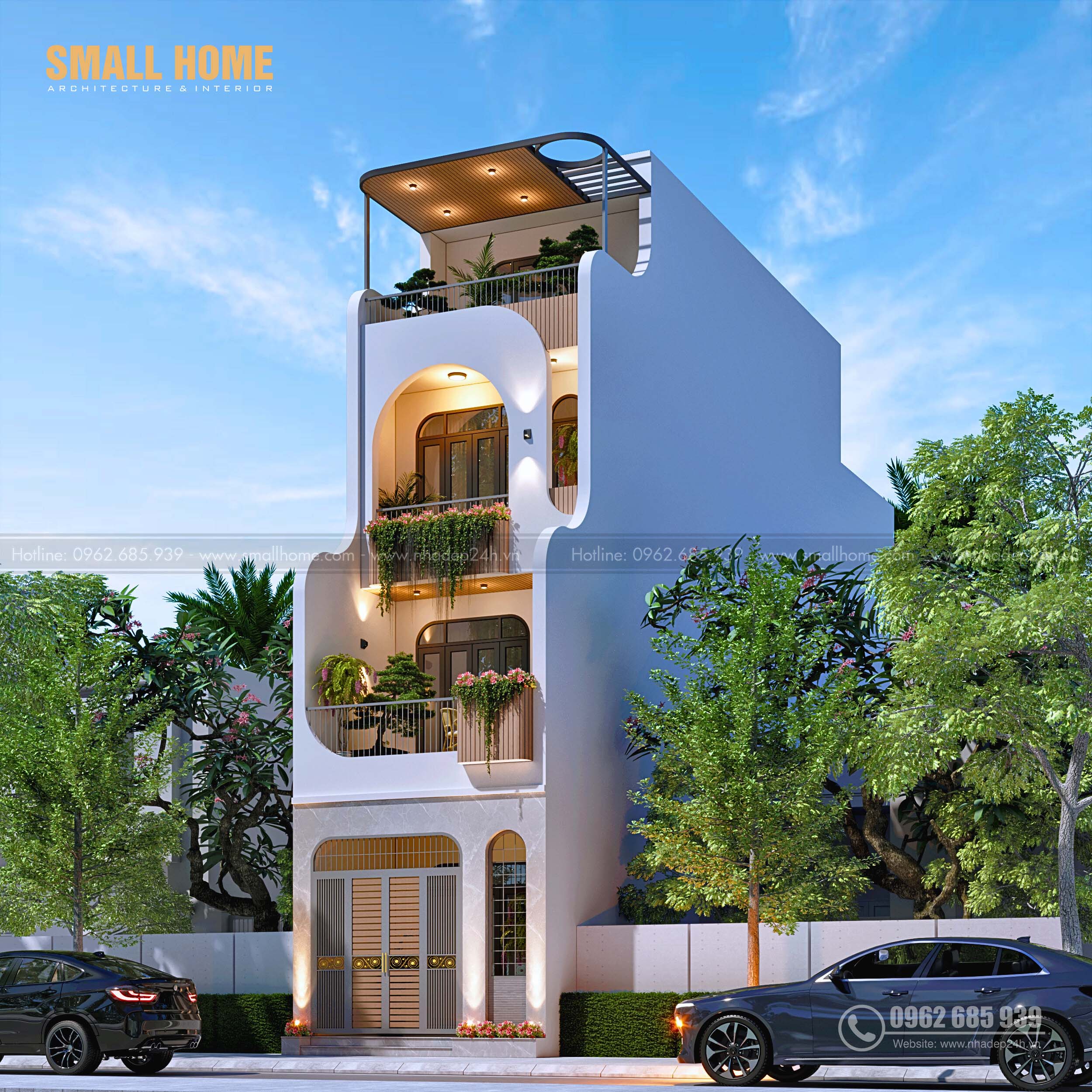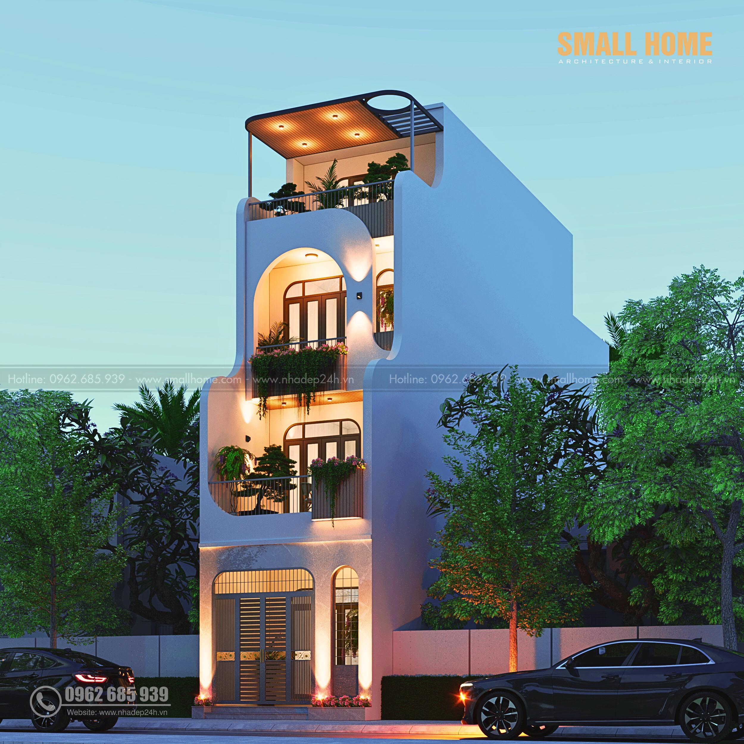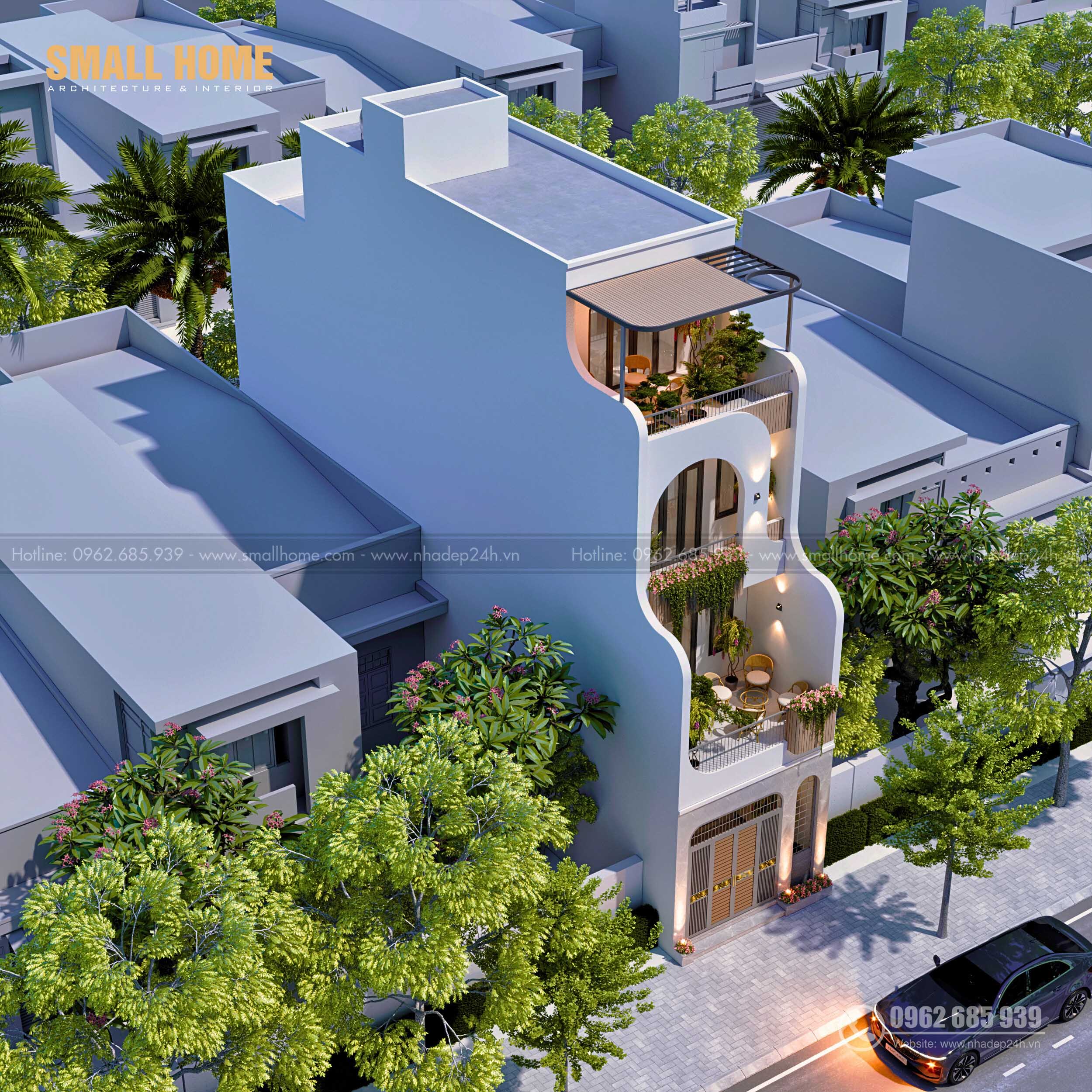Khác biệt hoàn toàn với thiết kế nhà phố vuông vức thường thấy, công trình thiết kế nhà phố nổi bật nhờ công việc sử dụng hình khối bo cong mềm thương mại ở ban công, mái hiên và mặt đứng. Sự chuyển tiếp đó không chỉ tạo nên điểm nhấn kiến trúc đặc trưng, mà còn là phần làm dịu đi sự thô cứng của hình khối bê tông , mang lại cảm giác nhẹ nhàng nhẹ nhàng, thư thái cho tổng thể nhà nhà.
