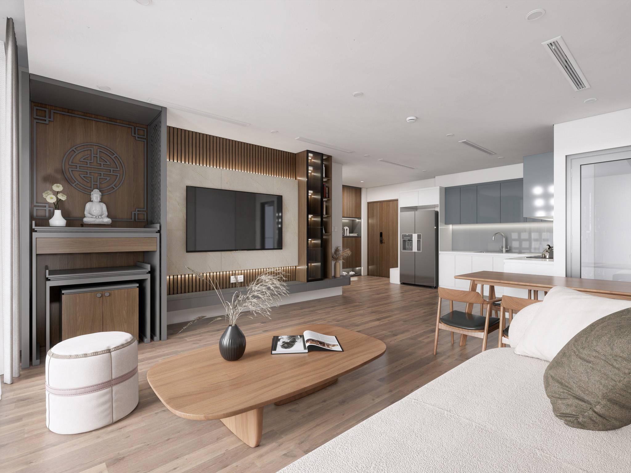 Mẫu thiết kế số 4: Sử dụng 2 gam màu chính trắng và màu gỗ trong không gian của căn hộ chung cư 90m2. Nhằm tạo vẻ đẹp hiện đại và sang trọng hơn trong căn hộ.