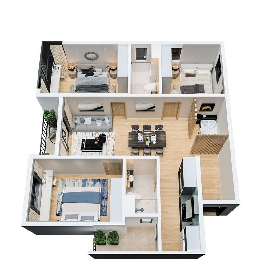 Mẫu thiết kế số 15: Mẫu thiết kế 2 phòng ngủ song song và một phòng ngủ đối diện với phòng khách. Nhằm đáp ứng cho những gia đình có 4 – 5 thành viên.