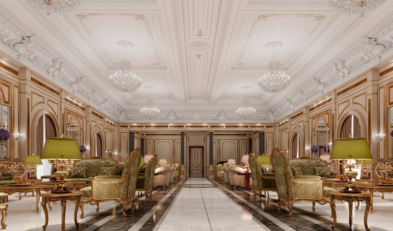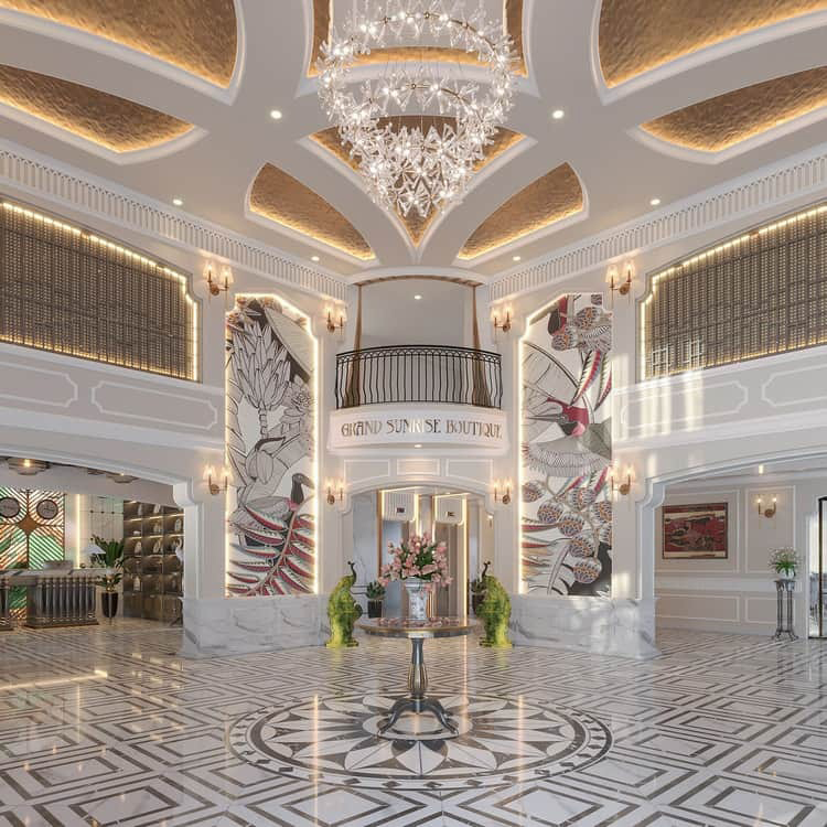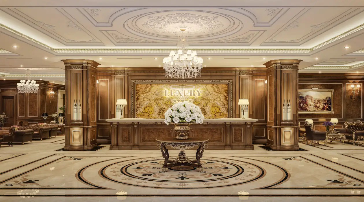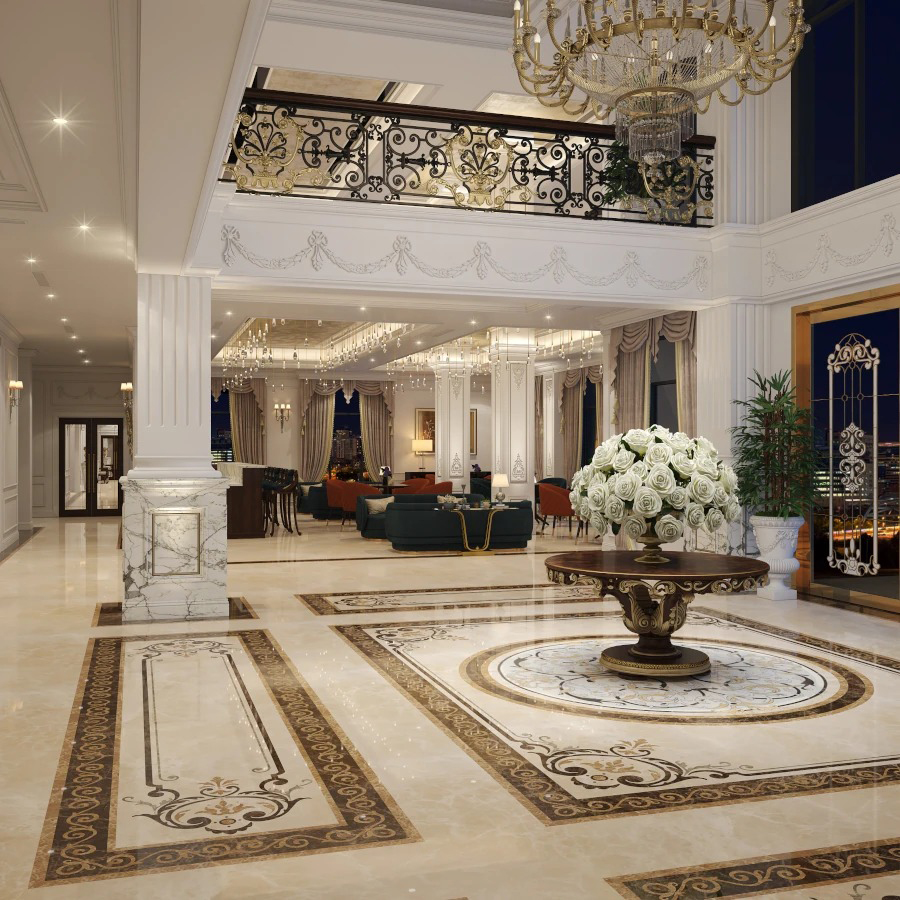 Phần sảnh khách sạn là không gian đầu tiên khách hàng tiếp cận khi đến với khách sạn của bạn. Như trong thiết kế này, phong cách cổ điển thể hiện rõ ràng qua họa tiết và màu sắc. Sàn sử dụng chất liệu đá hoa cương, kết hợp ghế sofa có đường viền cầu kỳ. Thiết kế phào chỉ kết hợp màu sắc nhẹ nhàng mang đến sự thân thiện và thoải mái cho khách hàng.