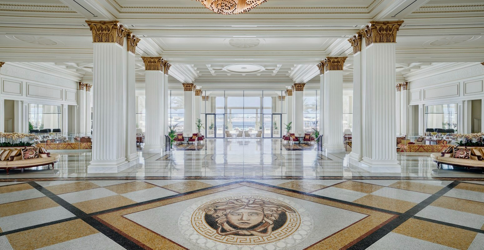 Sàn đá kết hợp tường màu vàng sang trọng cho sảnh nội thất khách sạn