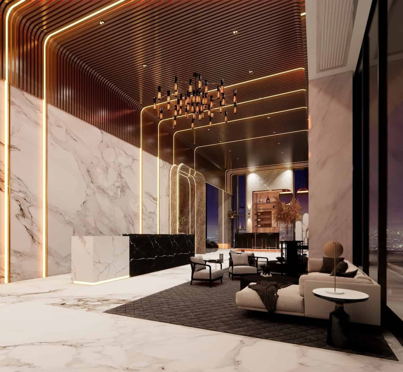 Khi bước đến khách sạn vị trí đầu tiên gây ấn tượng với khách hàng chính là tiền sảnh của khách sạn, đa số các khách sạn lớn đều dành một không gian thoáng rộng được trang trí nội thất bàn ghế tiện nghi và sang trọng để gây thiện cảm với khách hàng từ ánh nhìn đầu tiên.
