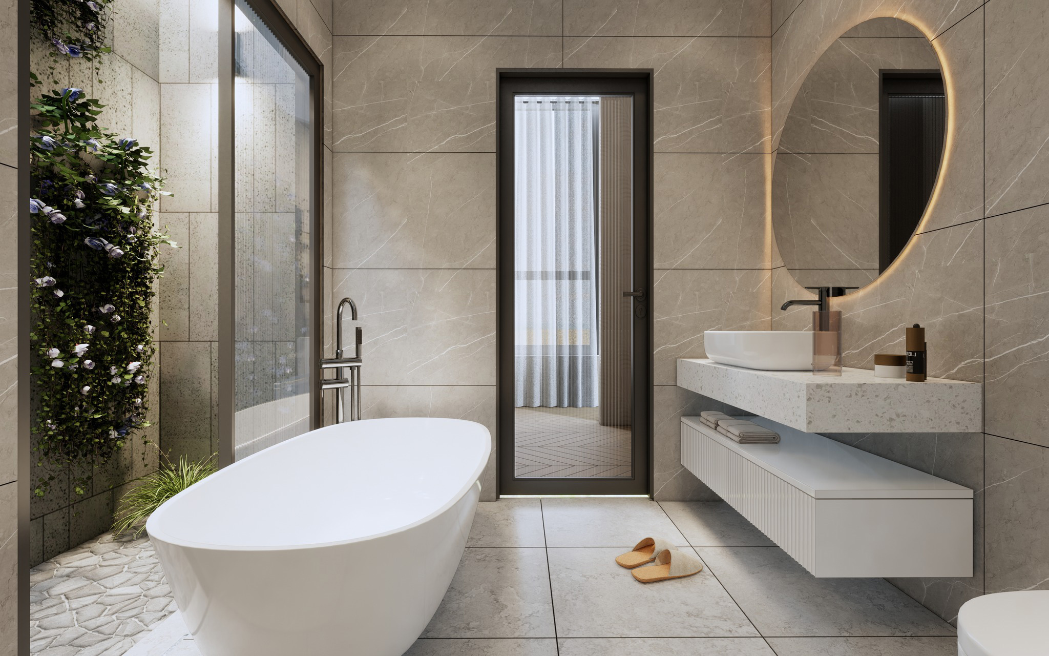 Phòng tắm với thiết kế cửa sổ rộng đón ánh sáng tự nhiên, rèm che điều tiết ánh sáng và tạo không gian riêng tư khi sử dụng. Thiết kế không quá cầu kỳ nhưng đầy đủ cơ sở vật chất cũng như đồ dùng cho khách hàng, đảm bảo các tiêu chuẩn thiết kế nội thất khách sạn đề ra.