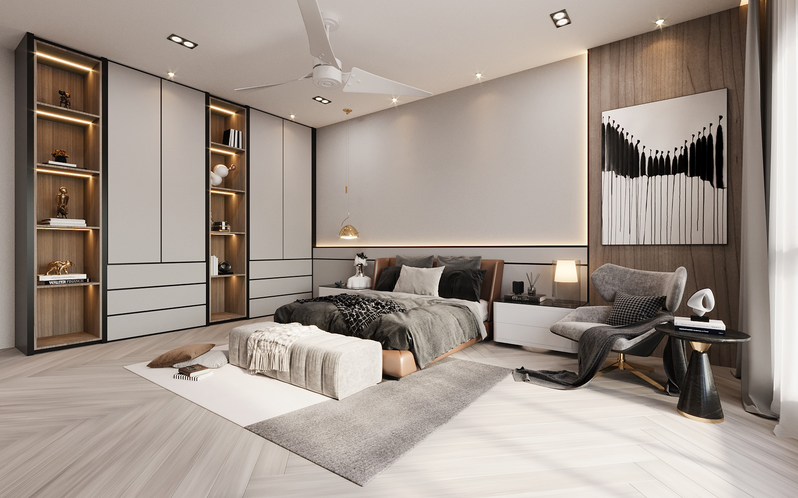 Phòng ngủ được thiết kế theo phong cách cổ điển pha chút hiện đại. Giường ngủ tông màu trắng, bàn trang điểm và tủ đựng đồ màu cafe hiện đại. Một chiếc bàn trà nhỏ xinh và đèn ngủ mang đến không gian ấm cúng và thoải mái. Sàn gỗ làm nổi bật đồ dùng nội thất bên trong, tạo sự hài hòa đến từng chi tiết.