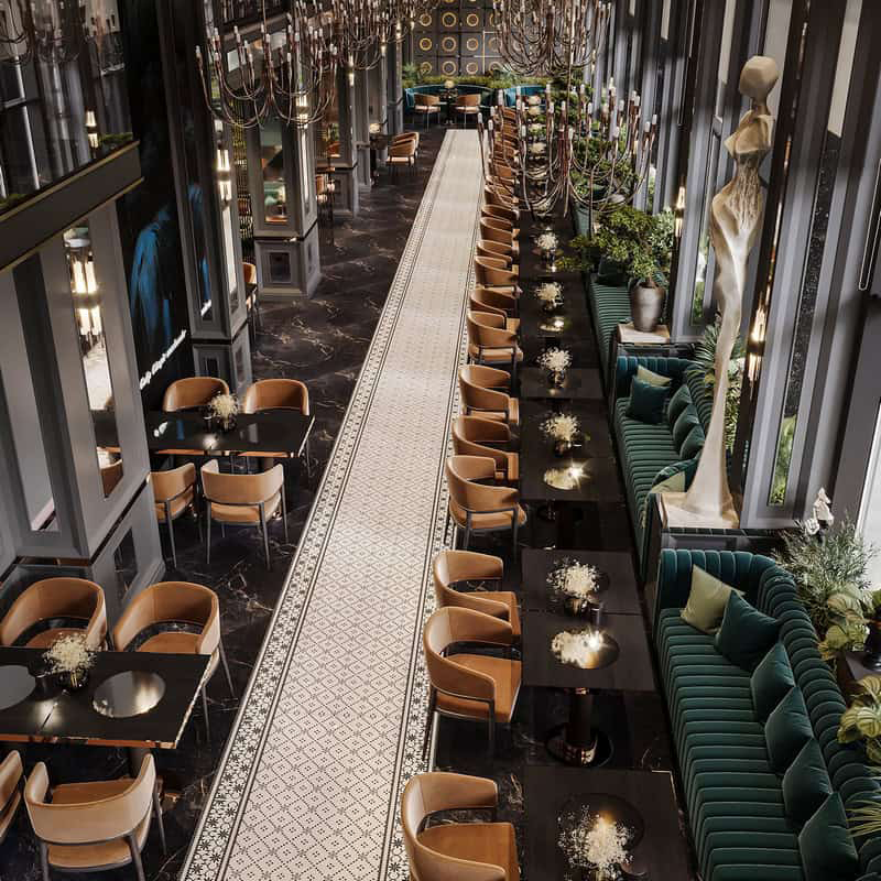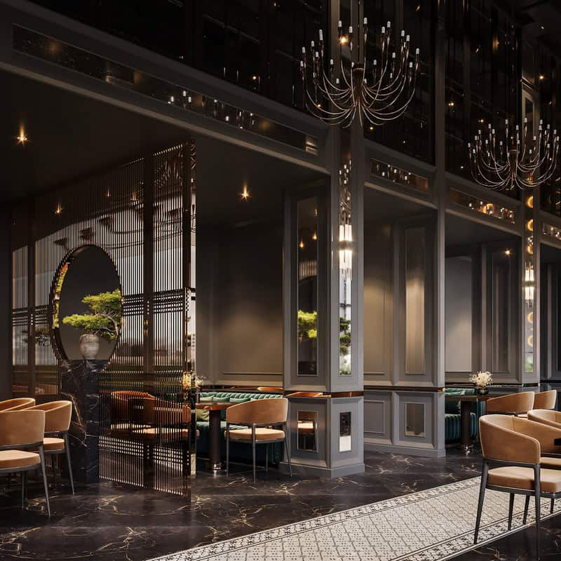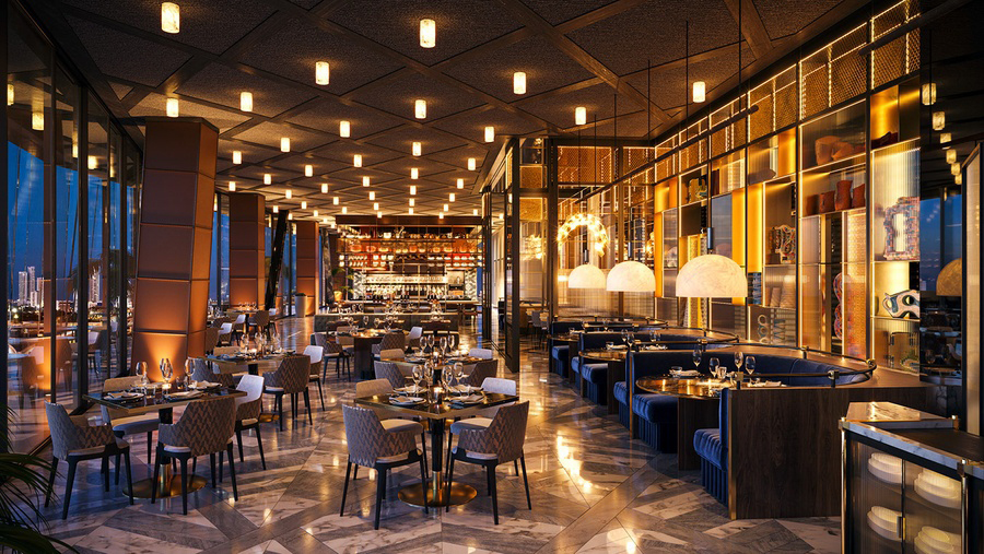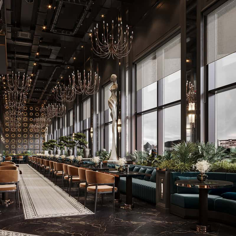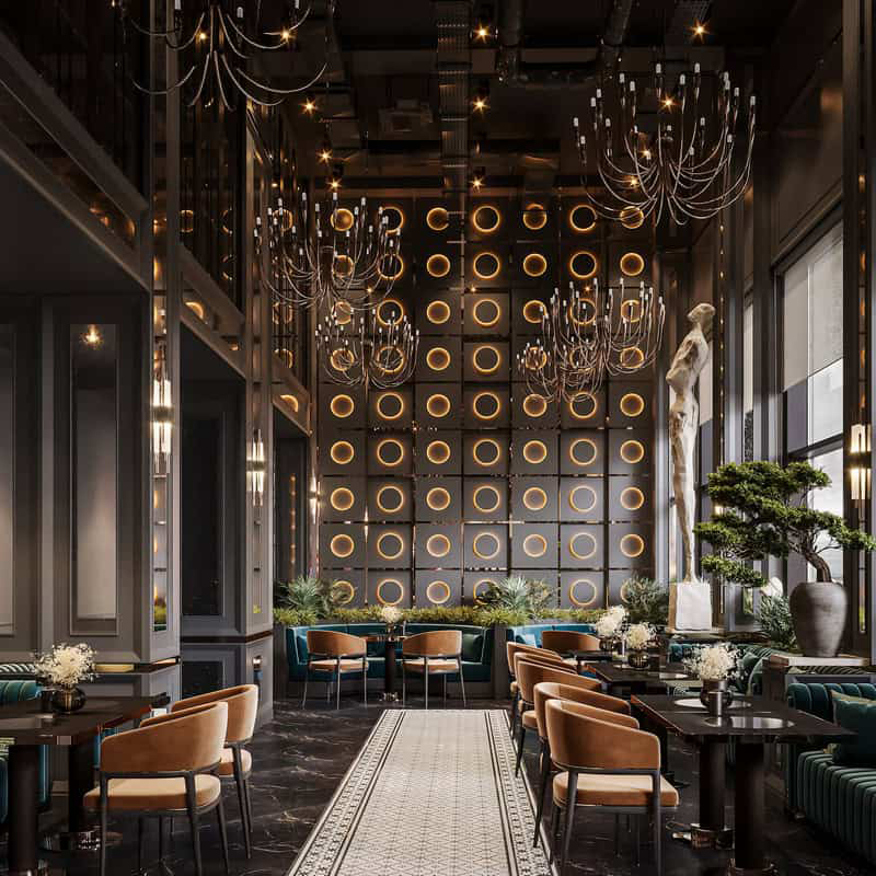 3. Thiết kế hệ thống ánh sáng hợp lý để làm nổi bật không gian nội thất nhà hàng sang trọng và tiện nghi