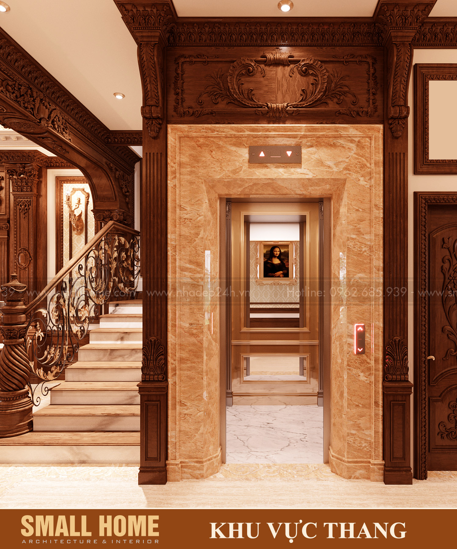 Sảnh thang cũng sử dụng chất liệu gỗ tự nhiên, phối một cách khéo léo với các vật liệu đá granit sáng màu...kết hợp với thang máy ốp đá sáng màu cực kì sang trọng đã mang lại không gian sảnh thang đẹp viên mãn, là khung xương nối không gian giữa cách tầng cách linh hoạt.