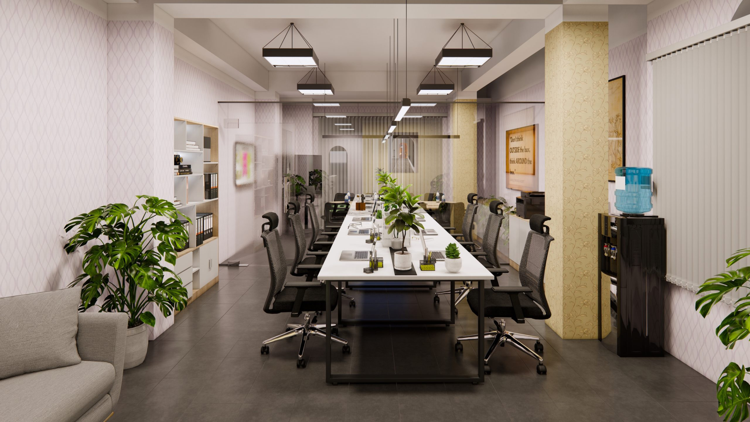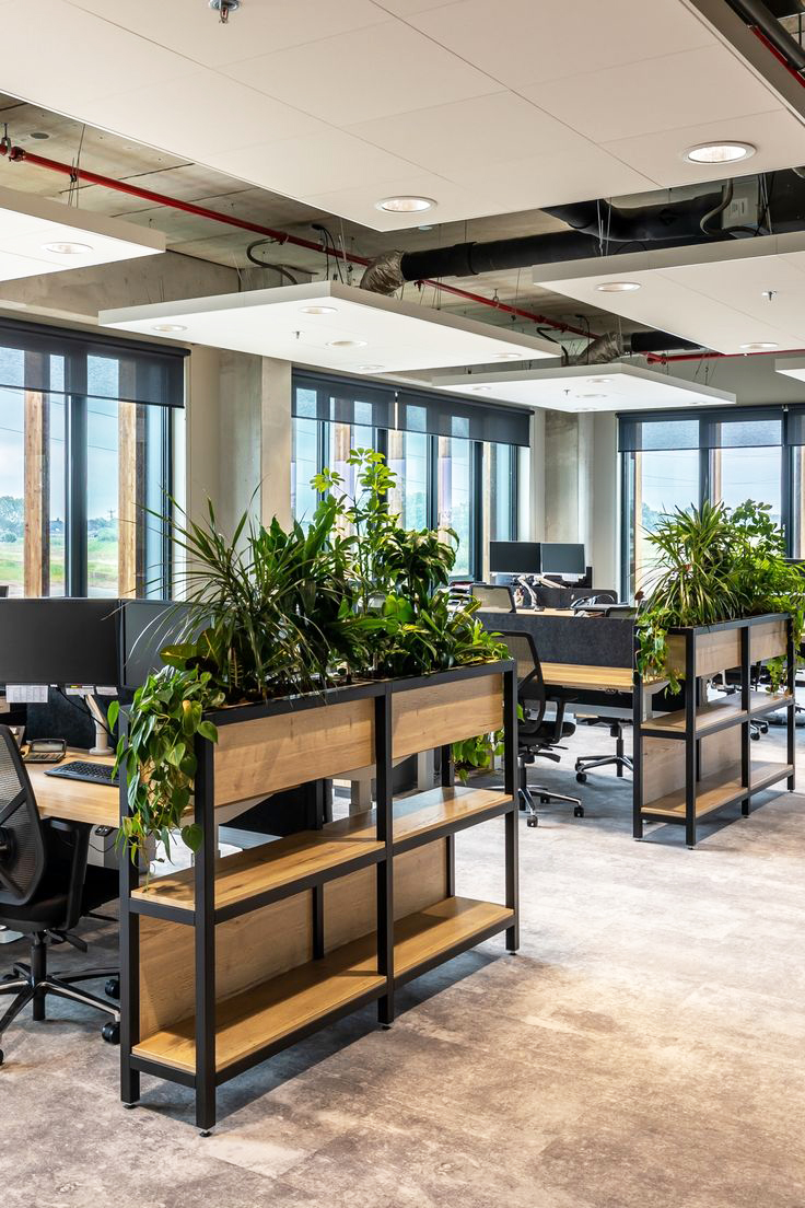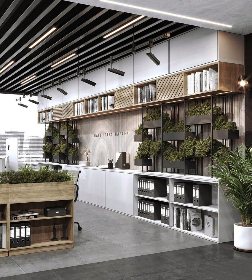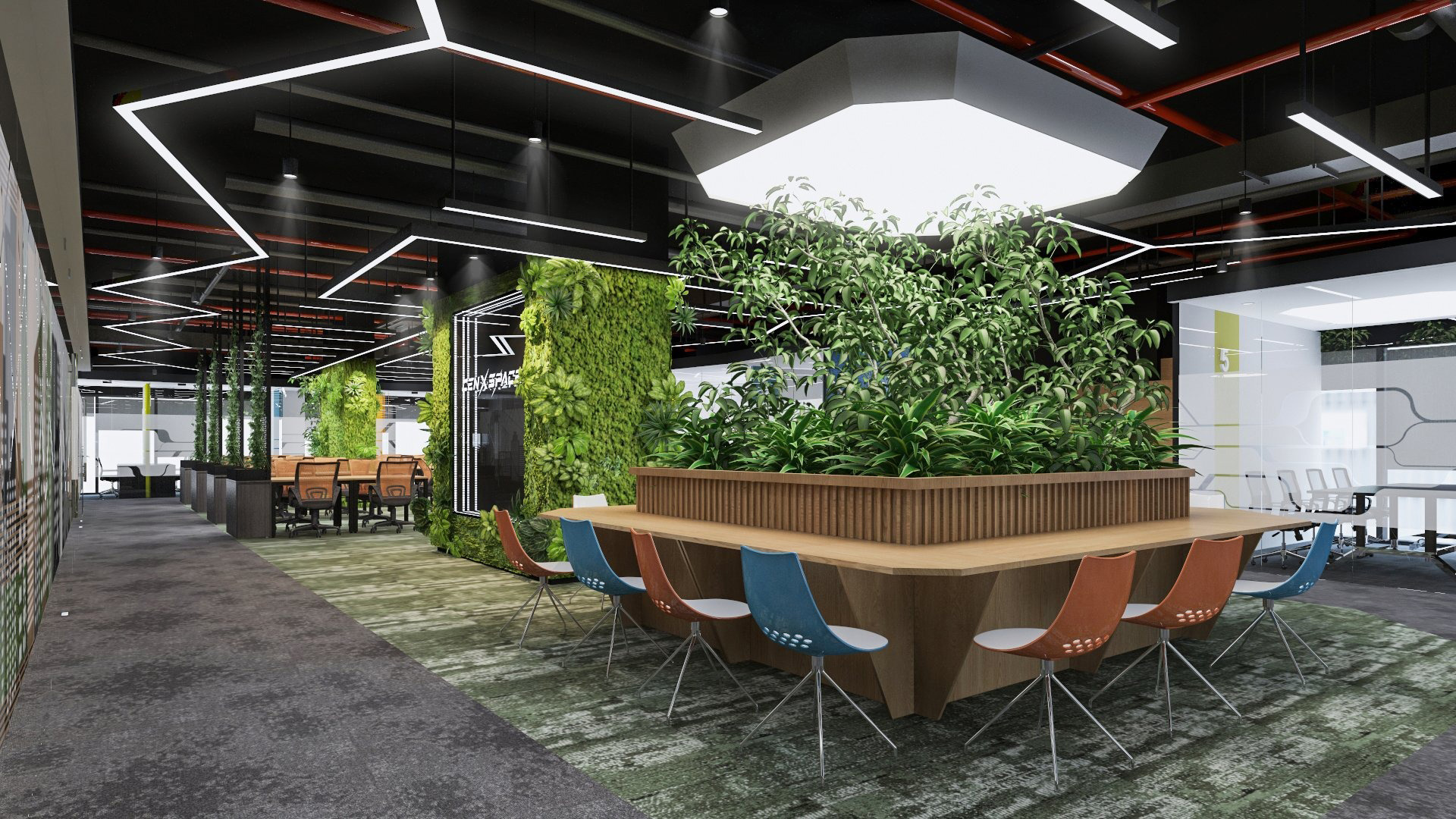 Một văn phòng được thiết kế theo không gian mở, loại bỏ sự ngăn cách cứng nhắc của các bức tường hoặc vách ngăn, để có sự giao thoa và giao hòa giữa các không gian nhỏ, cùng với sự xuất hiện của cây xanh sẽ là một điểm nhấn thú vị trong không gian làm việc lý tưởng mà bạn đang muốn kiến tạo.
