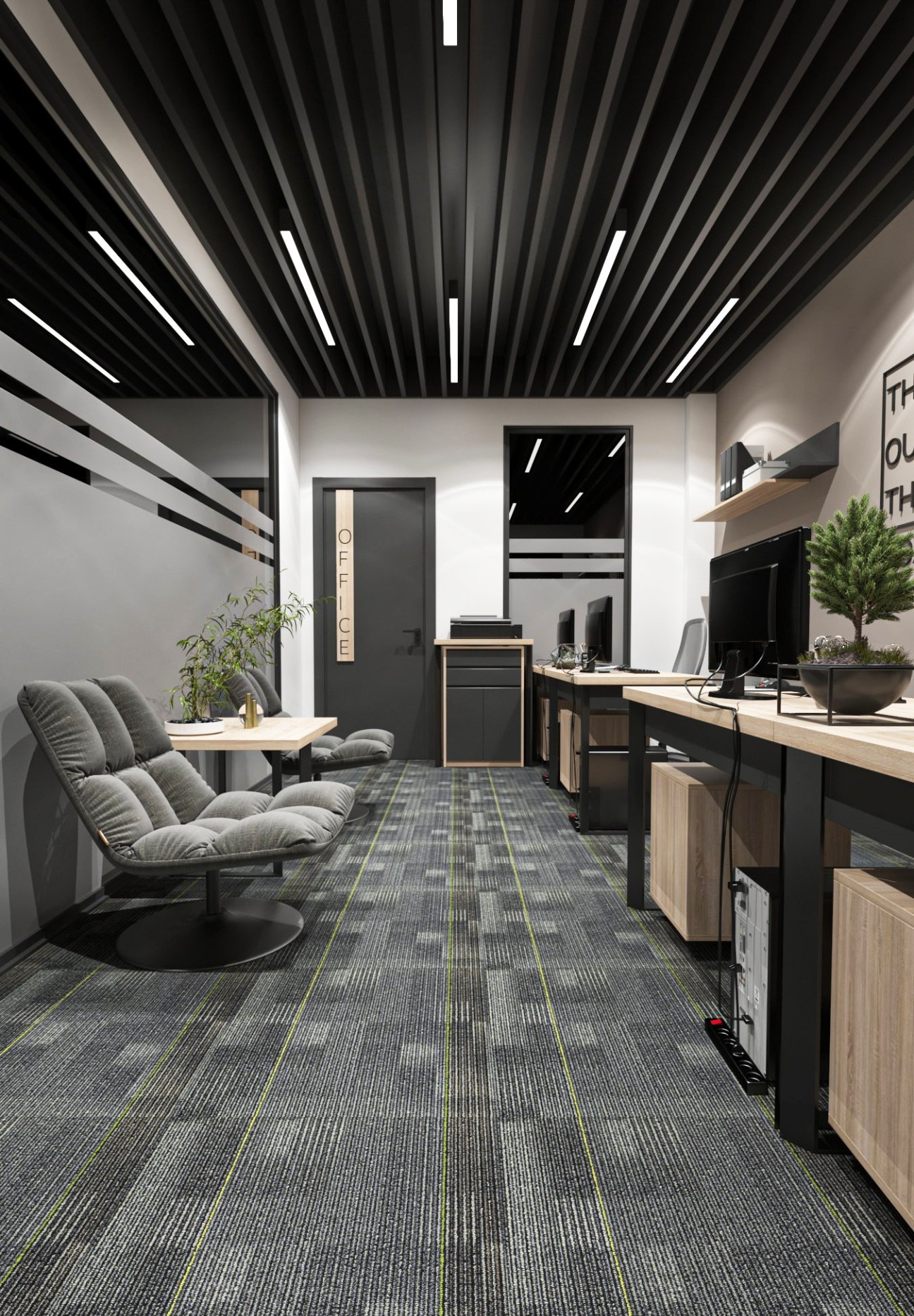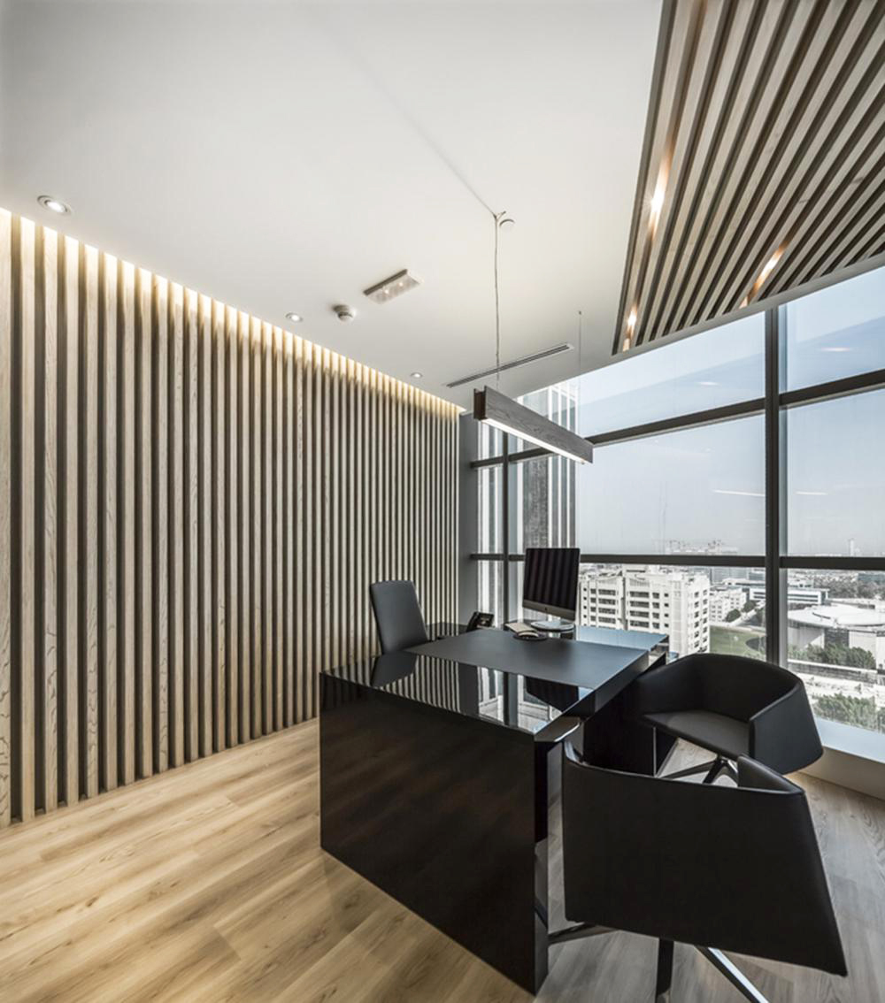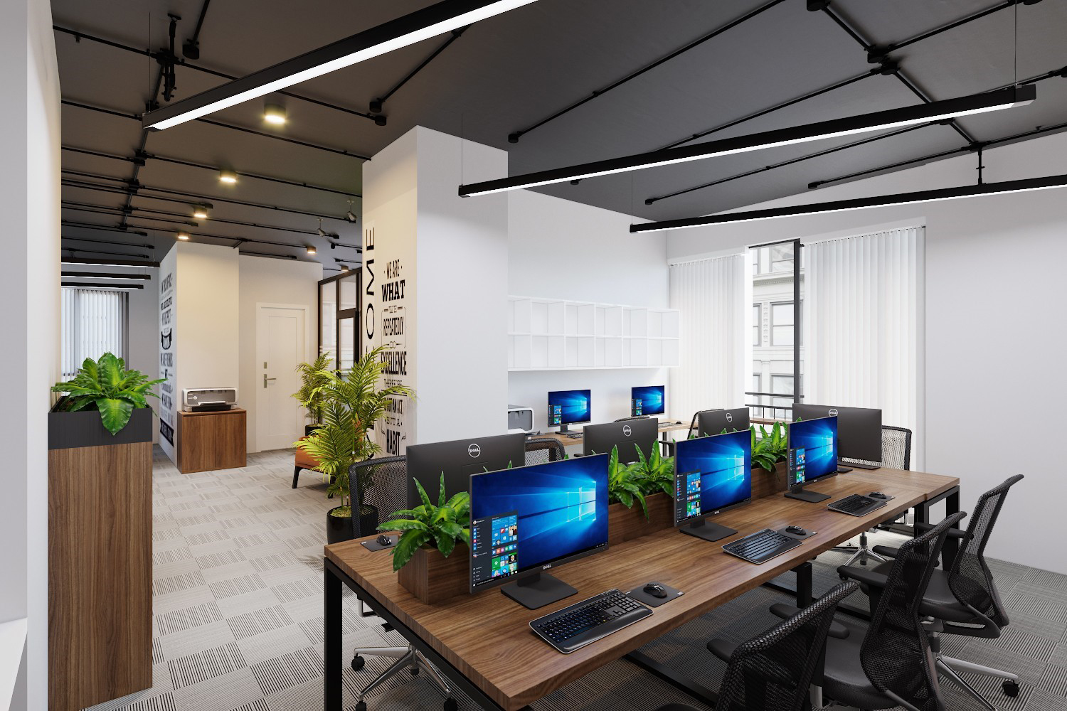 Thiết kế văn phòng với gam màu chủ đạo là màu đen, cách bố trí thông minh và tinh tế, cùng hệ thống đèn chiếu từ trên cao, sự xuất hiện của cây xanh, một khoảng không gian hiện đại cho khoảng thời gian 8h mỗi ngày.