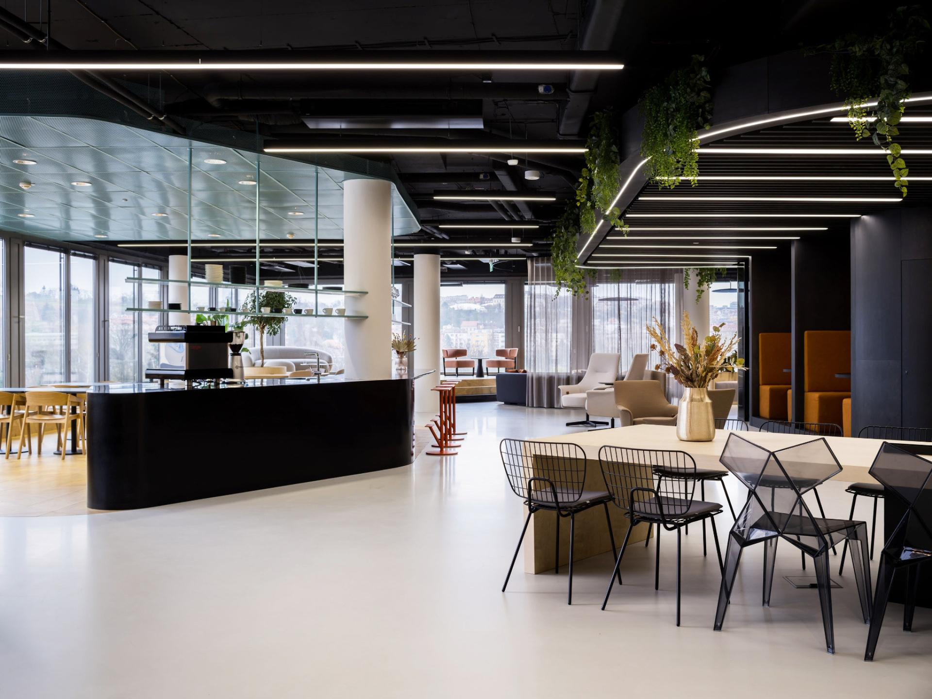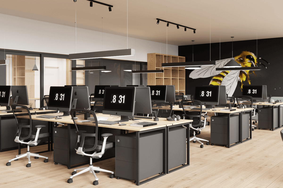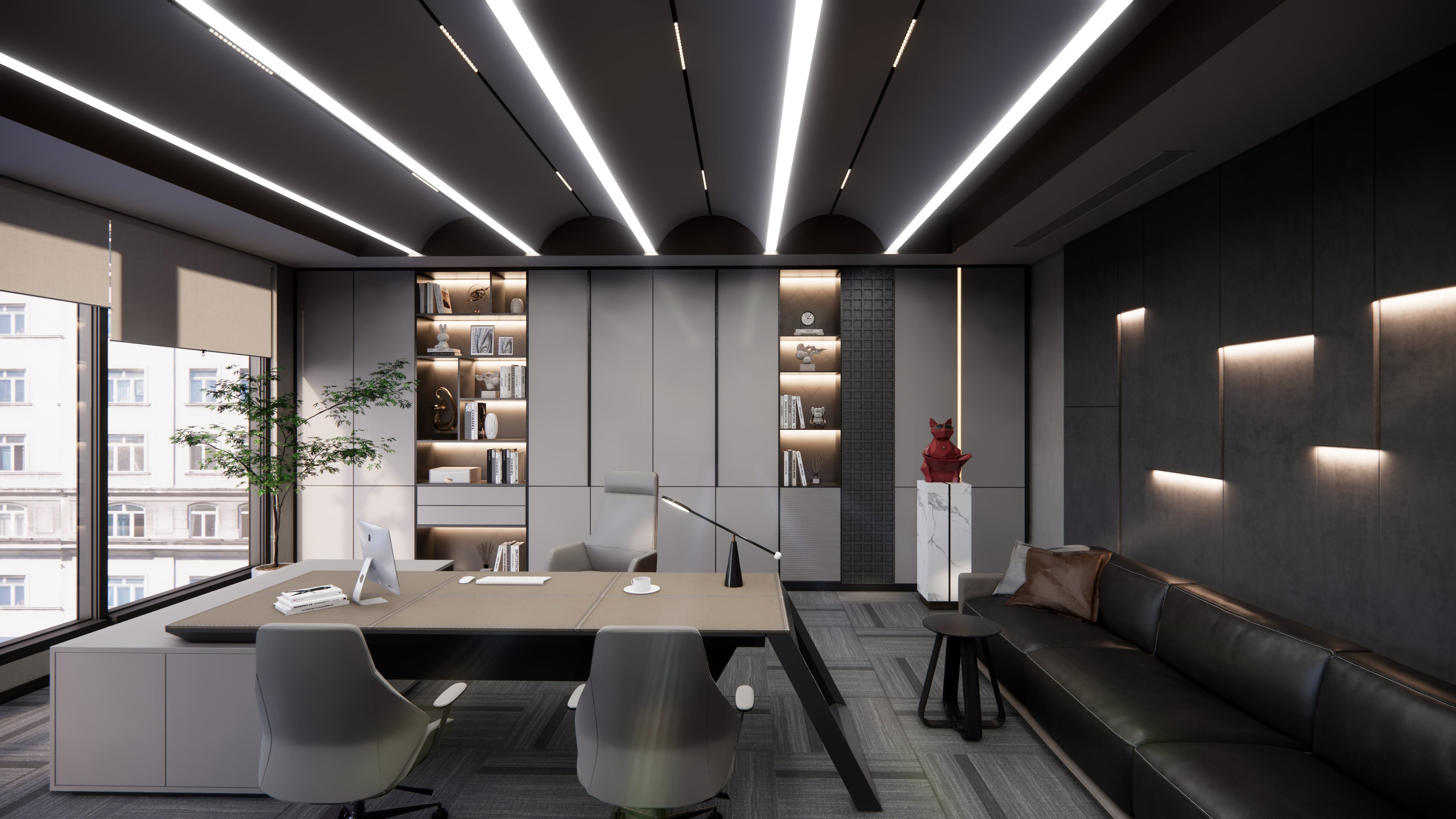 Thiết kế văn phòng với gam màu chủ đạo là màu đen, cách bố trí thông minh và tinh tế, cùng hệ thống đèn chiếu từ trên cao, sự xuất hiện của cây xanh, một khoảng không gian hiện đại cho khoảng thời gian 8h mỗi ngày.