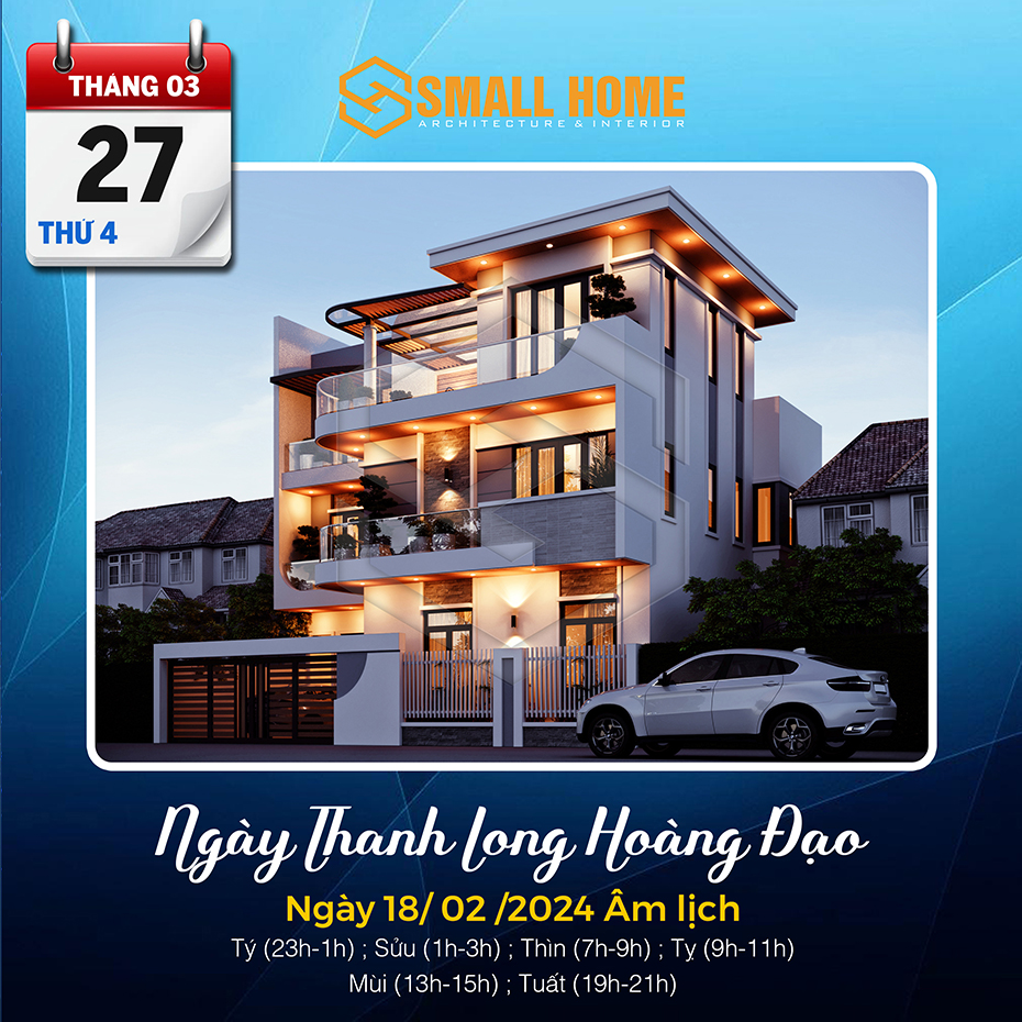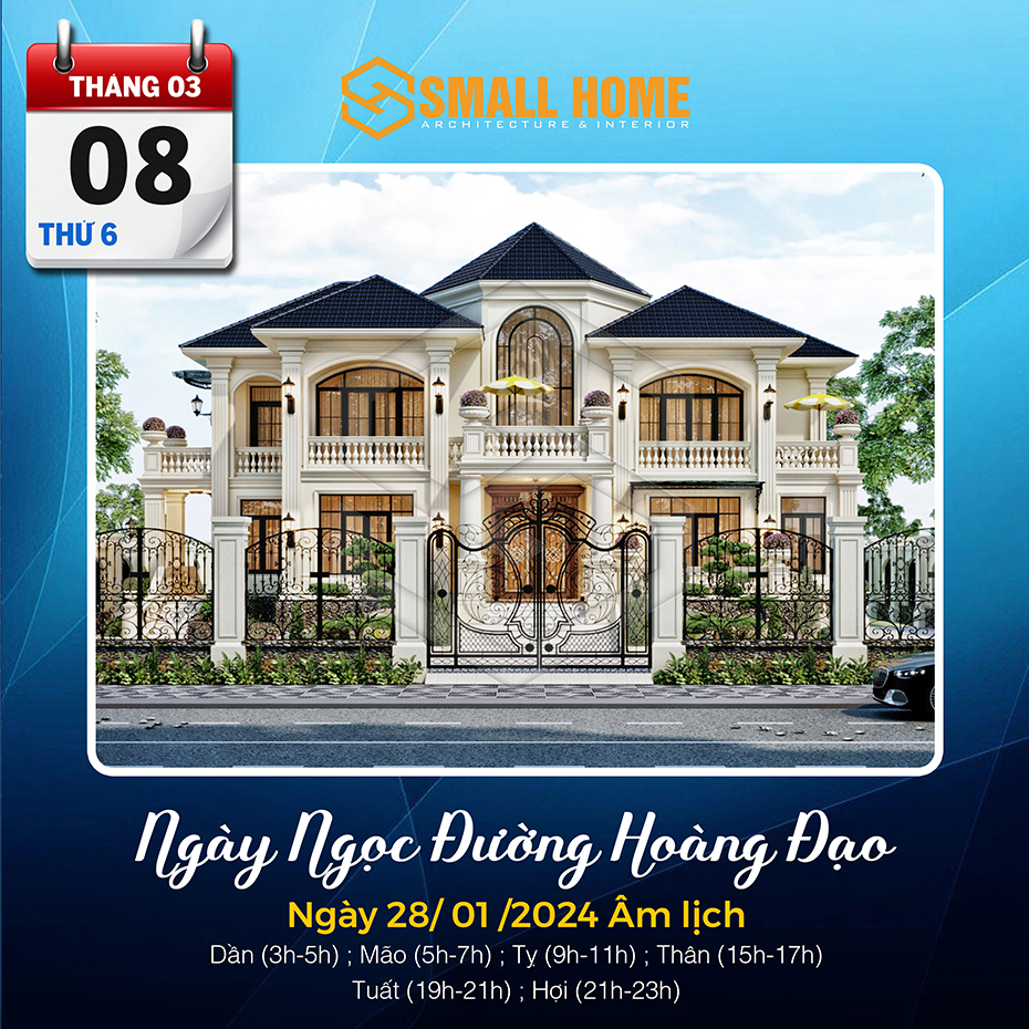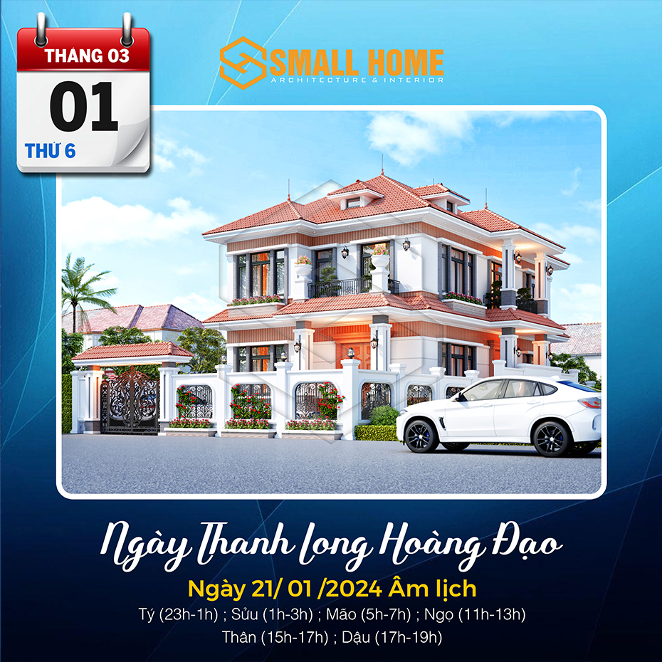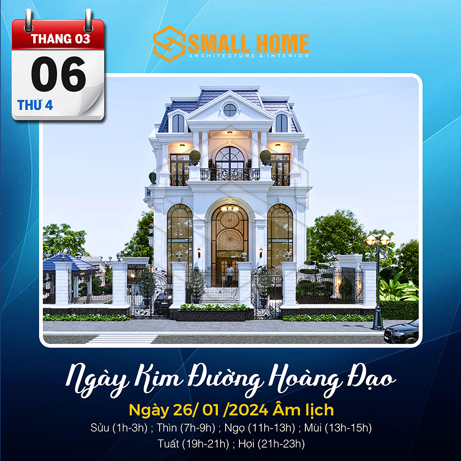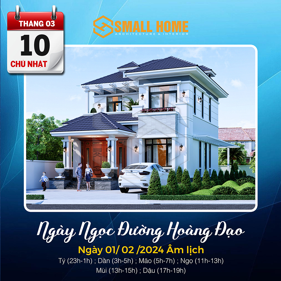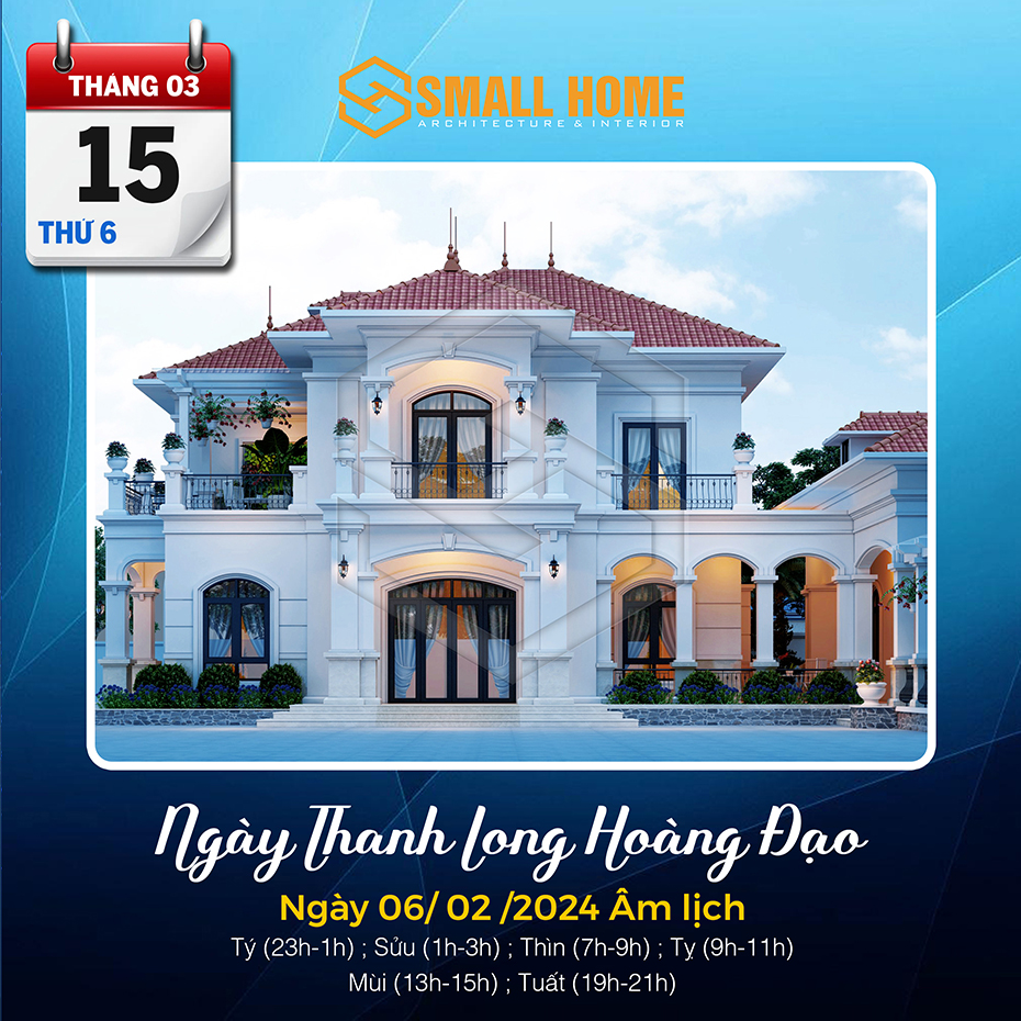 Việc xem ngày tốt làm nhà tốt xấu có ảnh hưởng khá lớn đến tâm lý của gia chủ. Xây nhà, dựng cửa là việc hệ trọng cần xem xét và bàn bạc kỹ lưỡng cho nên việc xem ngày tốt làm nhà là việc quan trọng ảnh hưởng tới công việc, vận mệnh của gia chủ. Vậy Kiến trúc & Nội thất Smallhome xin tư vấn một số ngày tốt làm nhà sửa nhà trong tháng 03 năm 2024. Thông thường xem ngày làm nhà, người ta thường chọn các ngày Hoàng đạo, có các sao như: Sát cống, Thanh Long, Hoàng Đạo và quan trọng nhất là việc xem ngày khởi công xây nhà và sửa nhà phải theo tuổi gia chủ.