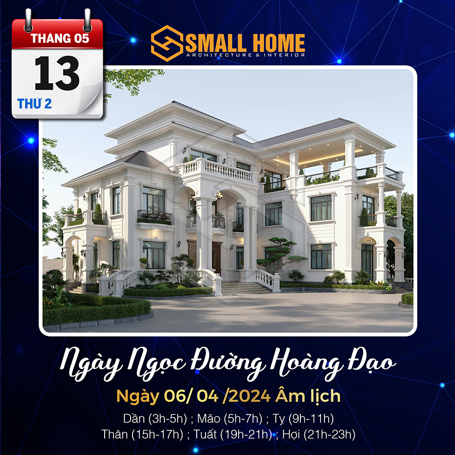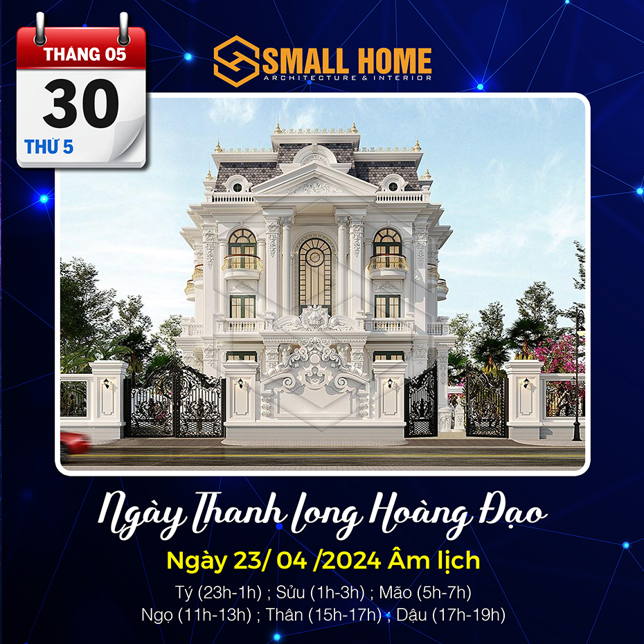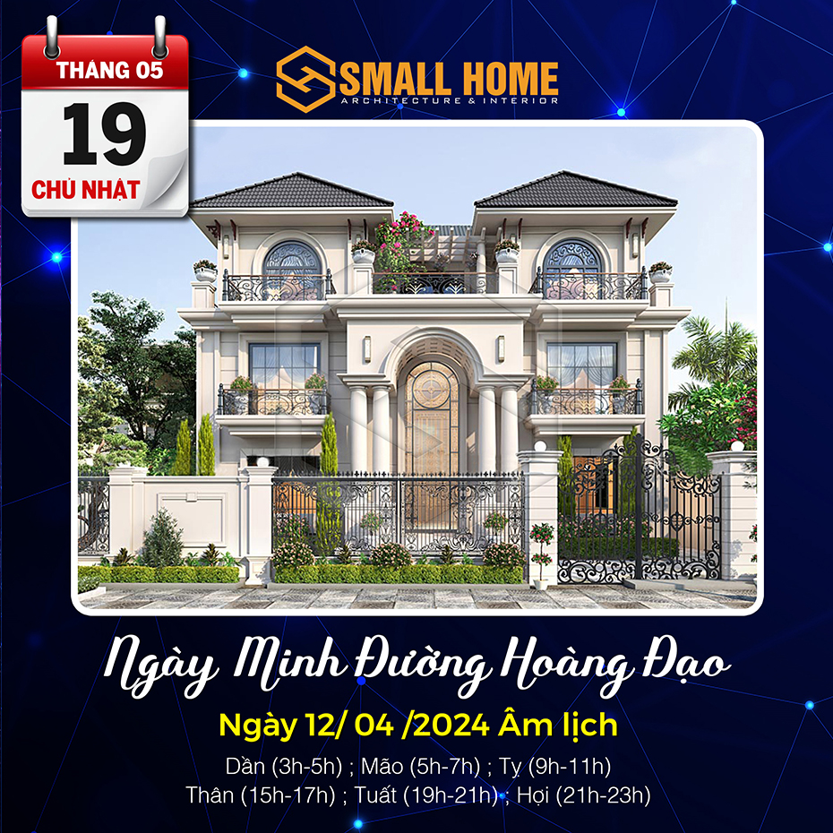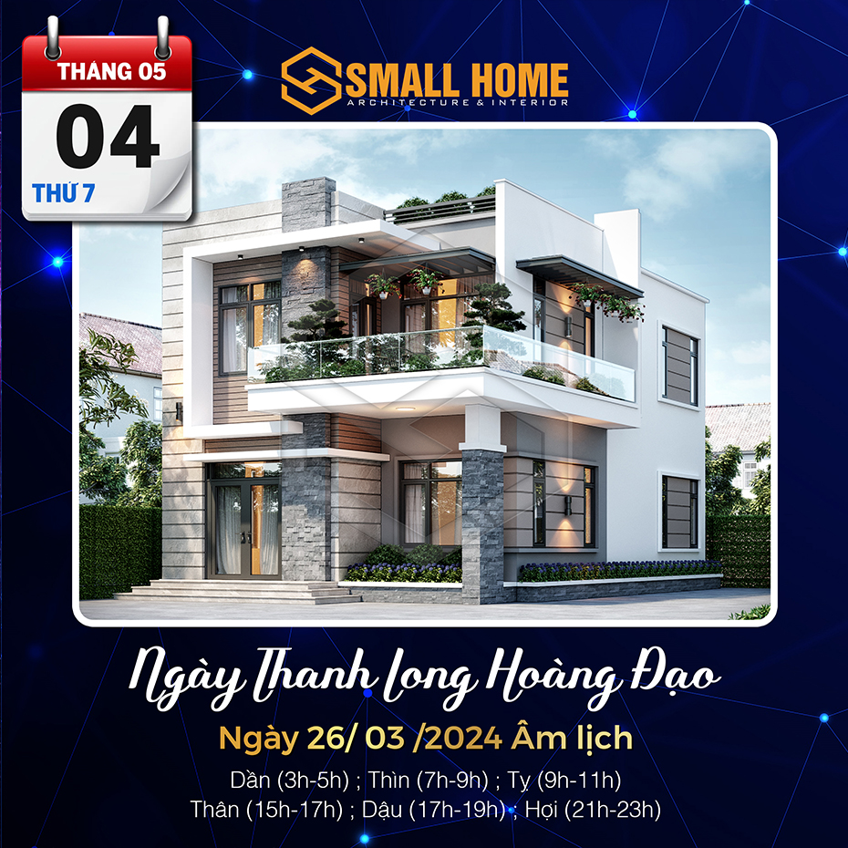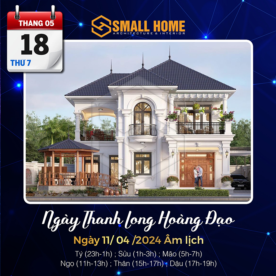 Việc xem ngày tốt làm nhà tốt xấu có ảnh hưởng khá lớn đến tâm lý của gia chủ. Xây nhà, dựng cửa là việc hệ trọng cần xem xét và bàn bạc kỹ lưỡng cho nên việc xem ngày tốt làm nhà là việc quan trọng ảnh hưởng tới công việc, vận mệnh của gia chủ. Vậy Kiến trúc & Nội thất Smallhome xin tư vấn một số ngày tốt làm nhà sửa nhà trong tháng 05 năm 2024. Thông thường xem ngày làm nhà, người ta thường chọn các ngày Hoàng đạo, có các sao như: Sát cống, Thanh Long, Hoàng Đạo và quan trọng nhất là việc xem ngày khởi công xây nhà và sửa nhà phải theo tuổi gia chủ.