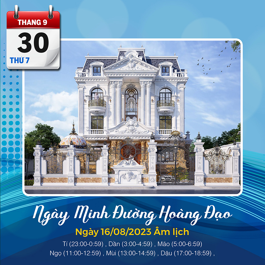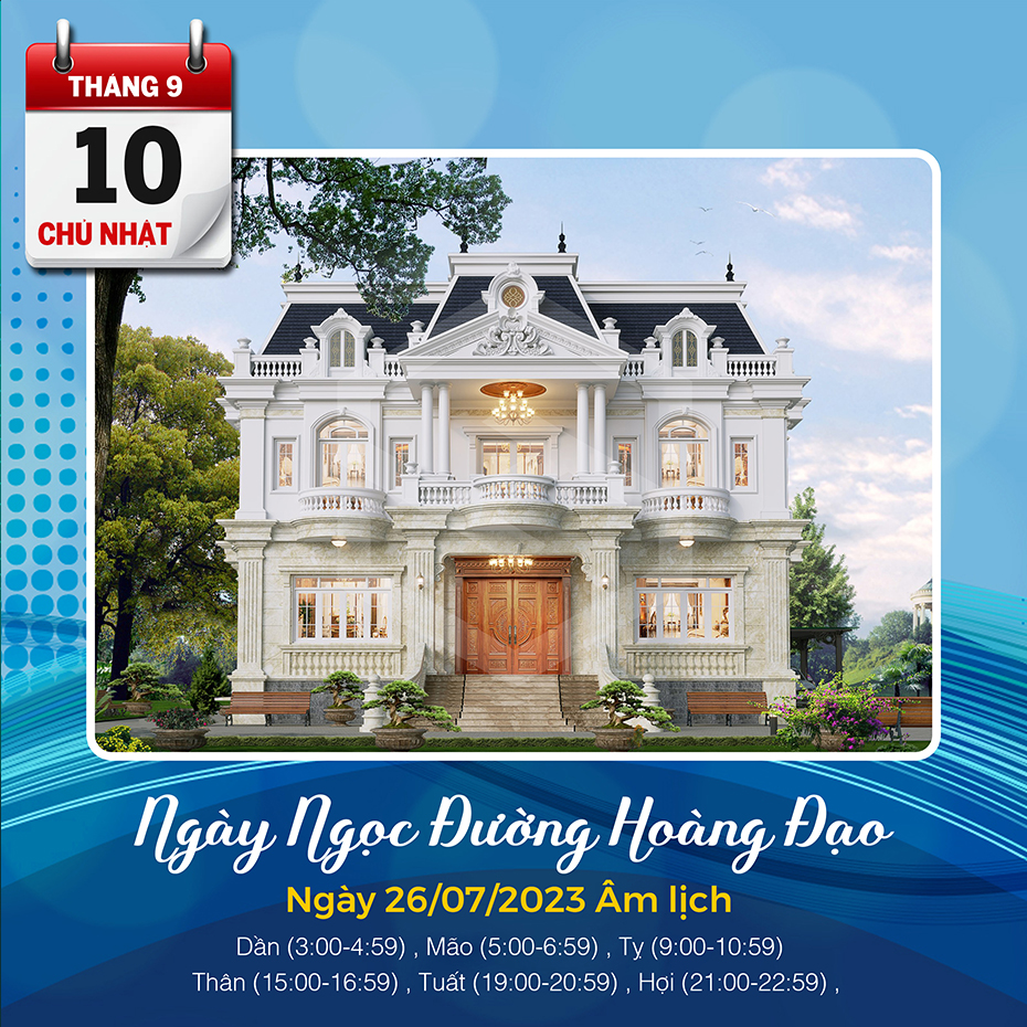 - Các ngày hoàng đạo trong tháng: Minh Đường Hoàng Đạo, Kim Đường Hoàng Đạo, Kim Quỹ Hoàng Đạo, Ngọc Đường Hoàng Đạo, Tư Mệnh Hoàng Đạo và Thanh Long Hoàng Đạo.